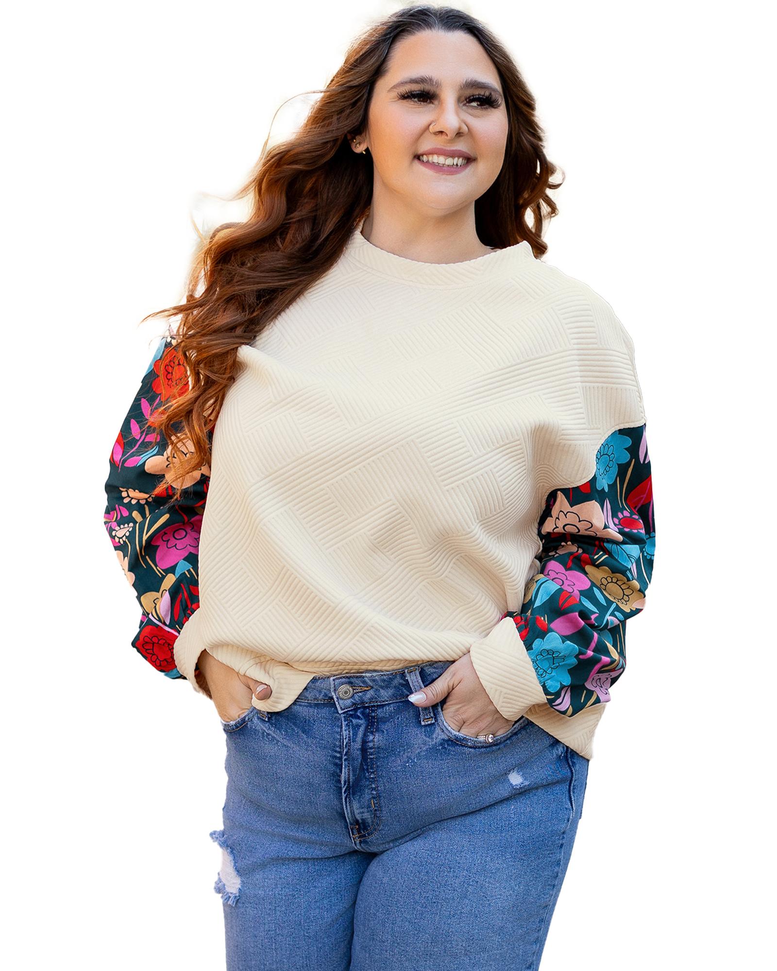 - White Floral Patchwork Sleeve Textured Plus Size Pullover Top