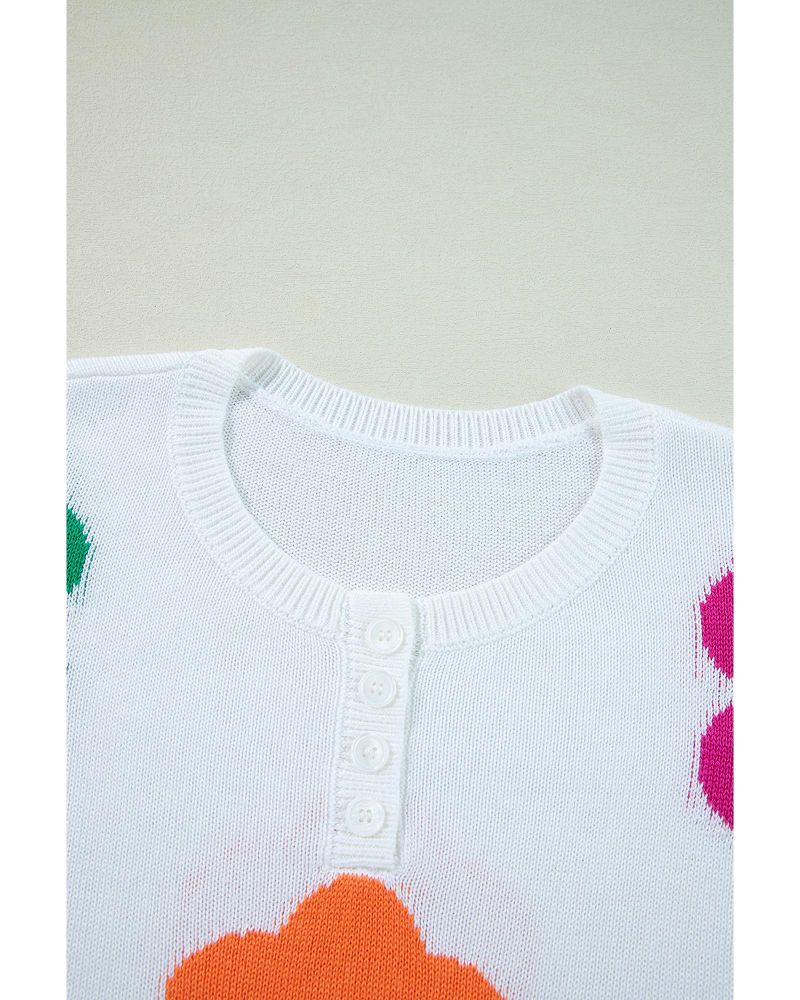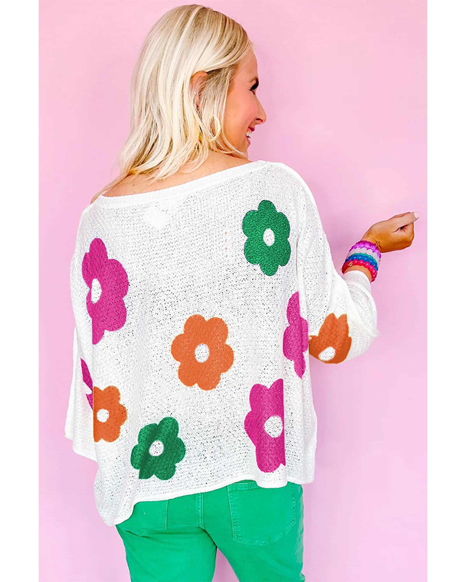 White Floral Print Buttoned Loose Lightweight Sweater – M