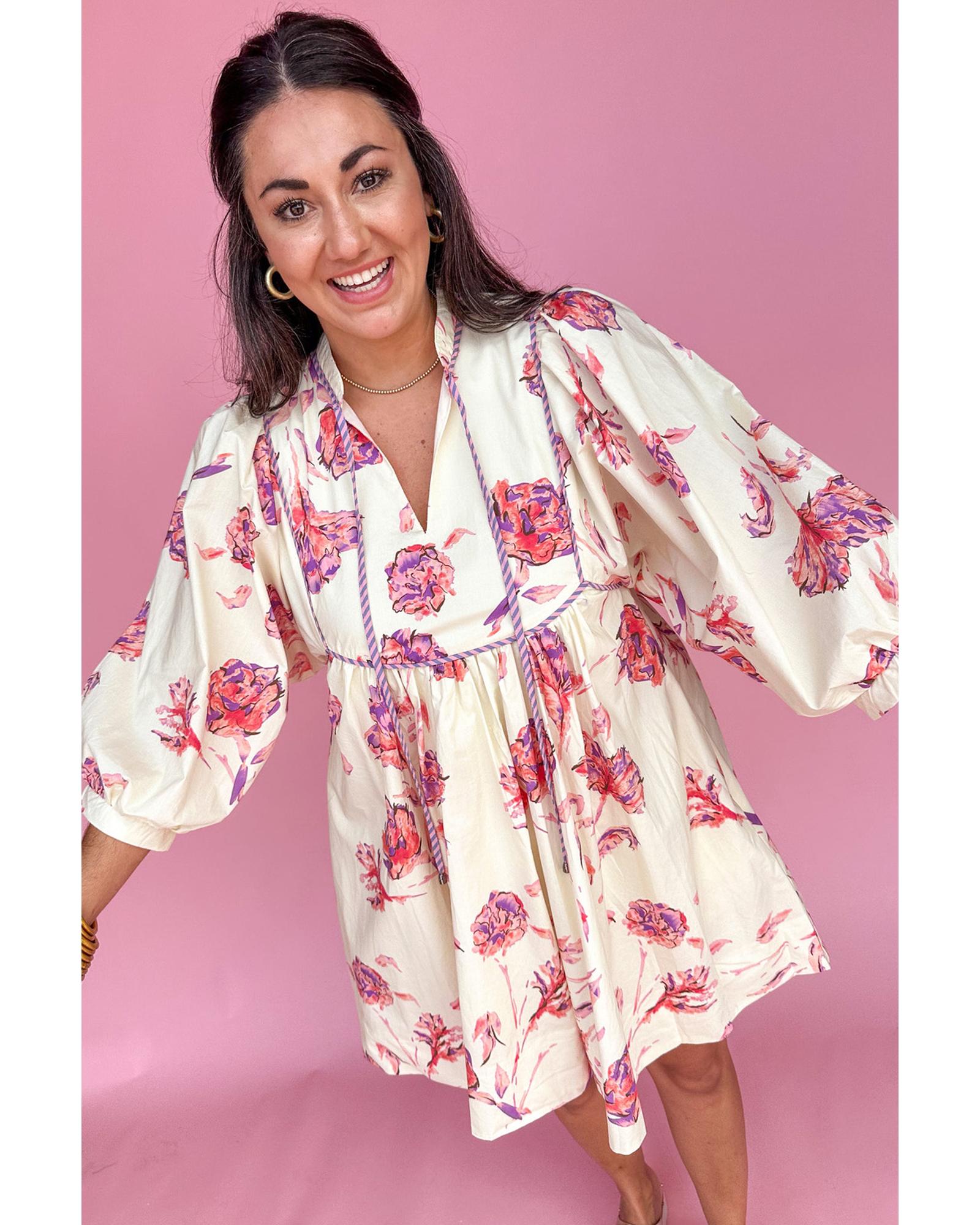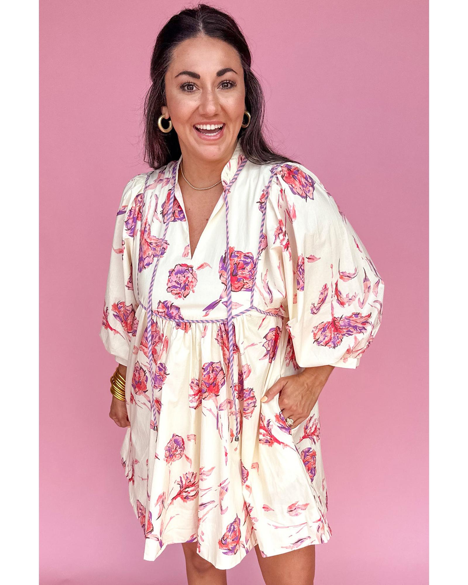 White Floral Print Lace up V Neck Balloon Sleeve Plus Size Shift Mini Dress – 2X