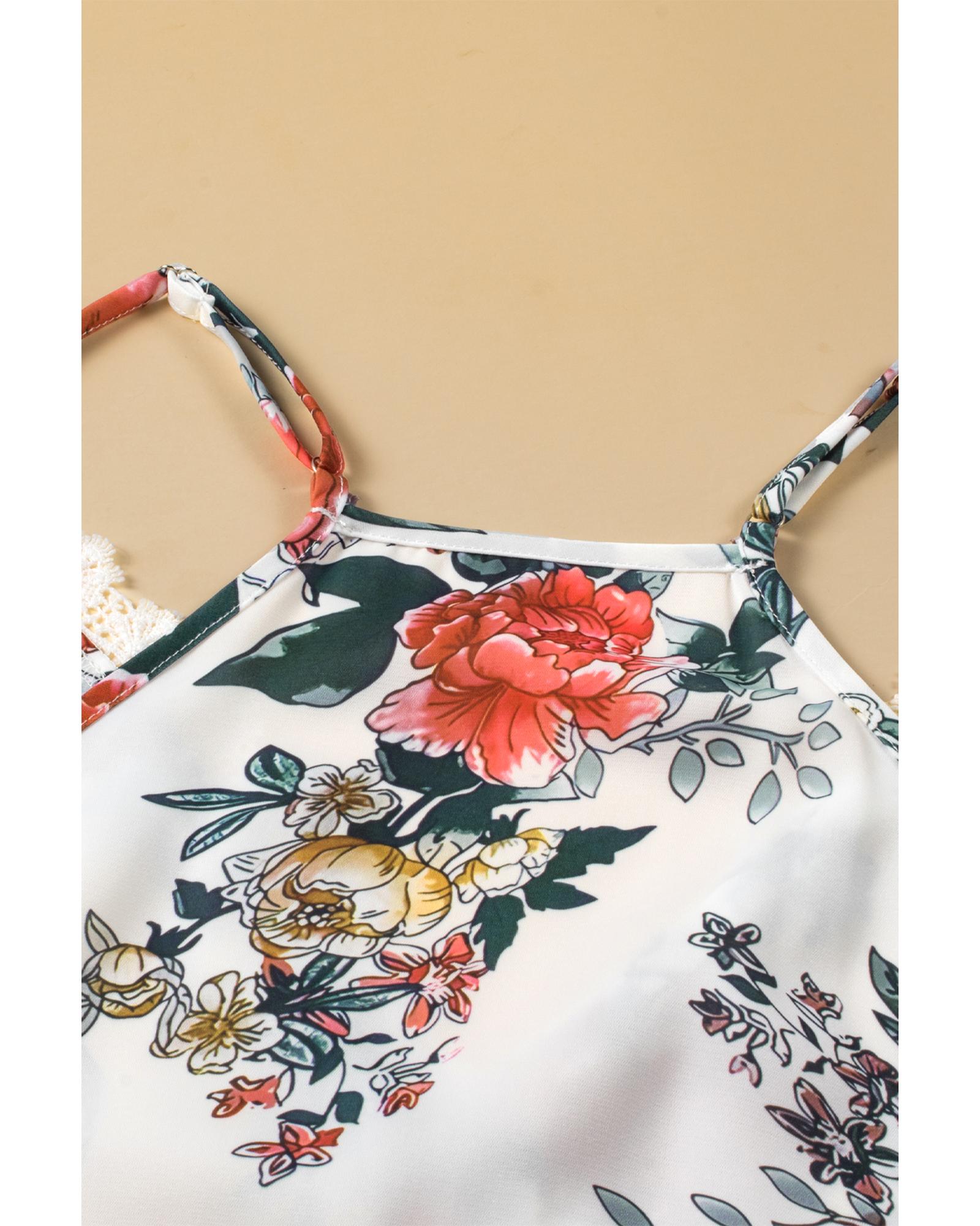 White Floral Print Lace V Neck Tank Top – L