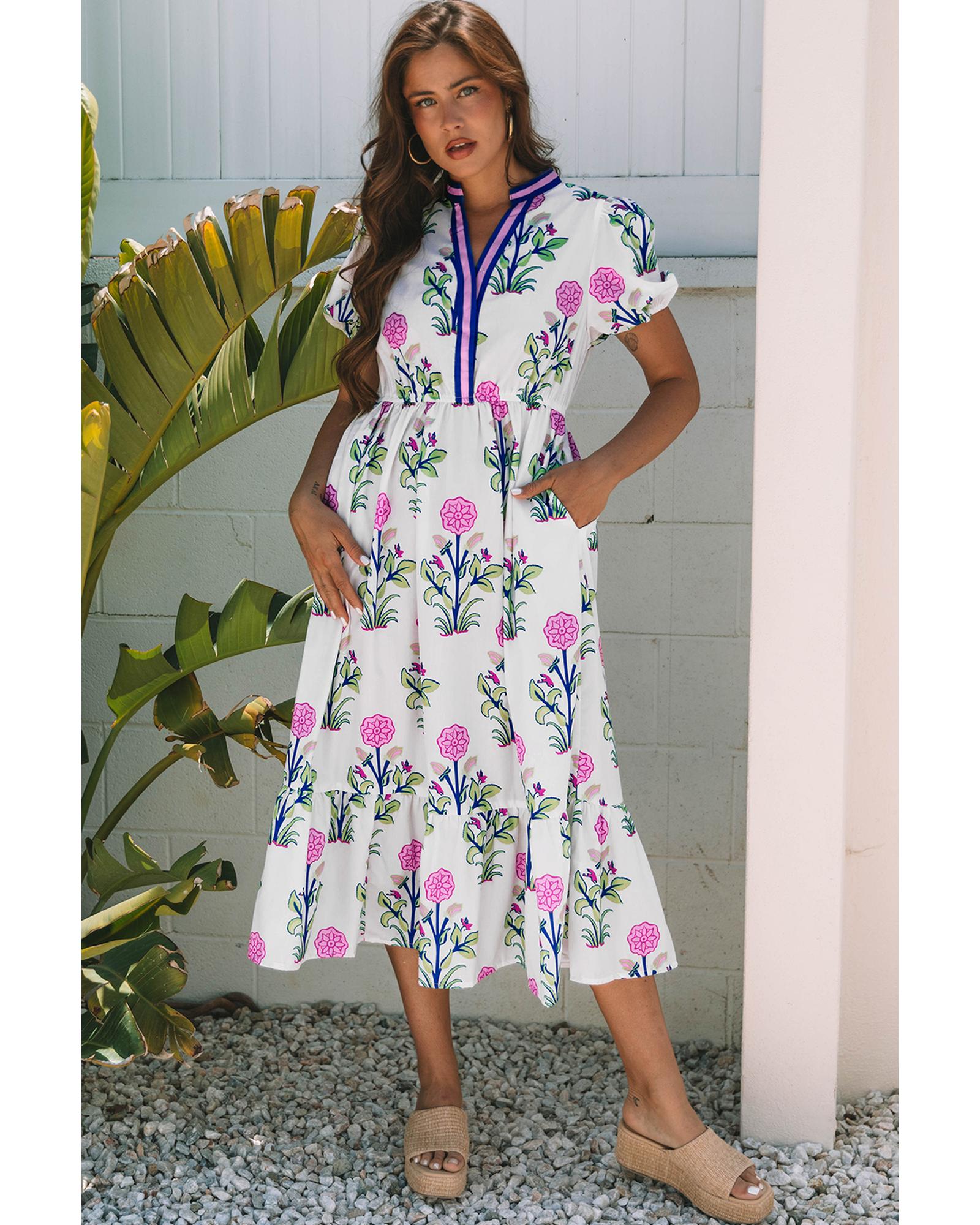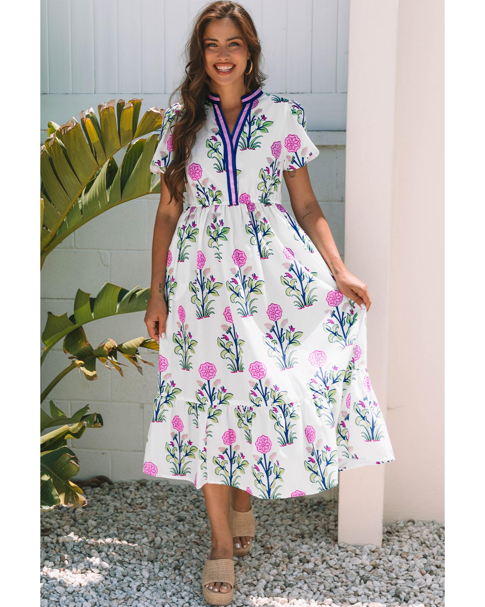 - White Floral Puff Short Sleeve V Neck High Waist Maxi Dress