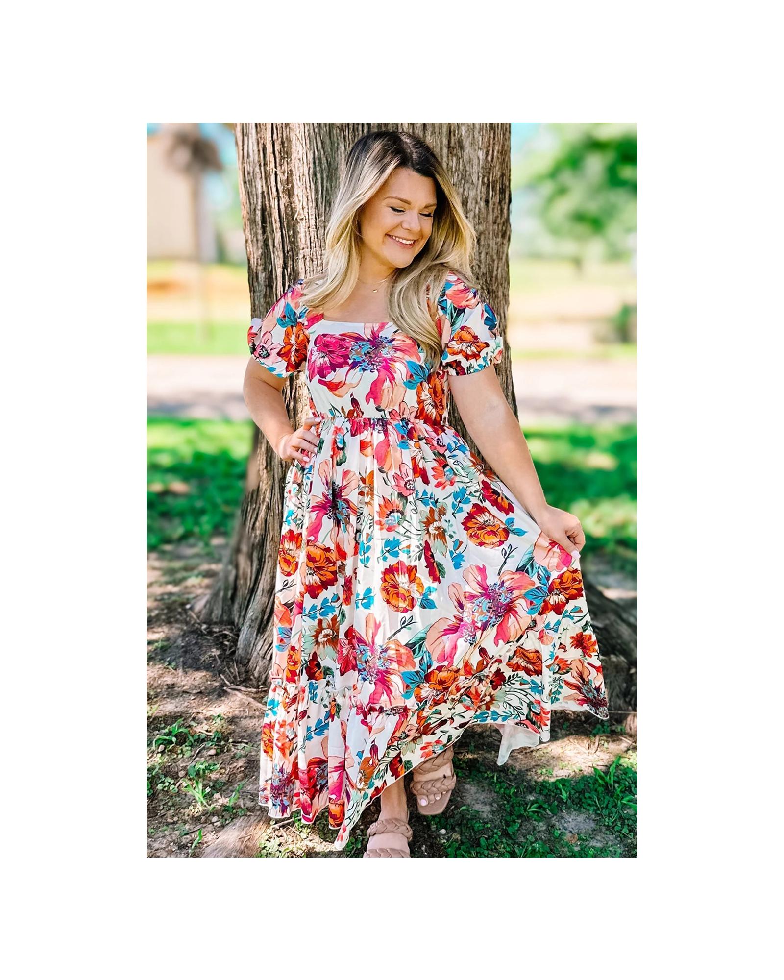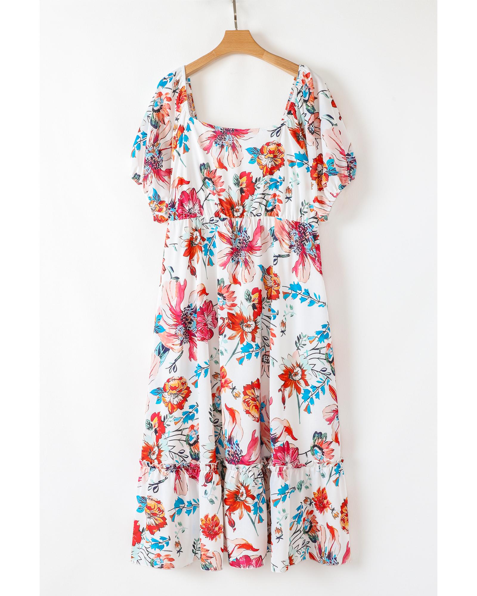 White Floral Square Neck Puff Sleeve Flowy Plus Size Midi Dress – 1X
