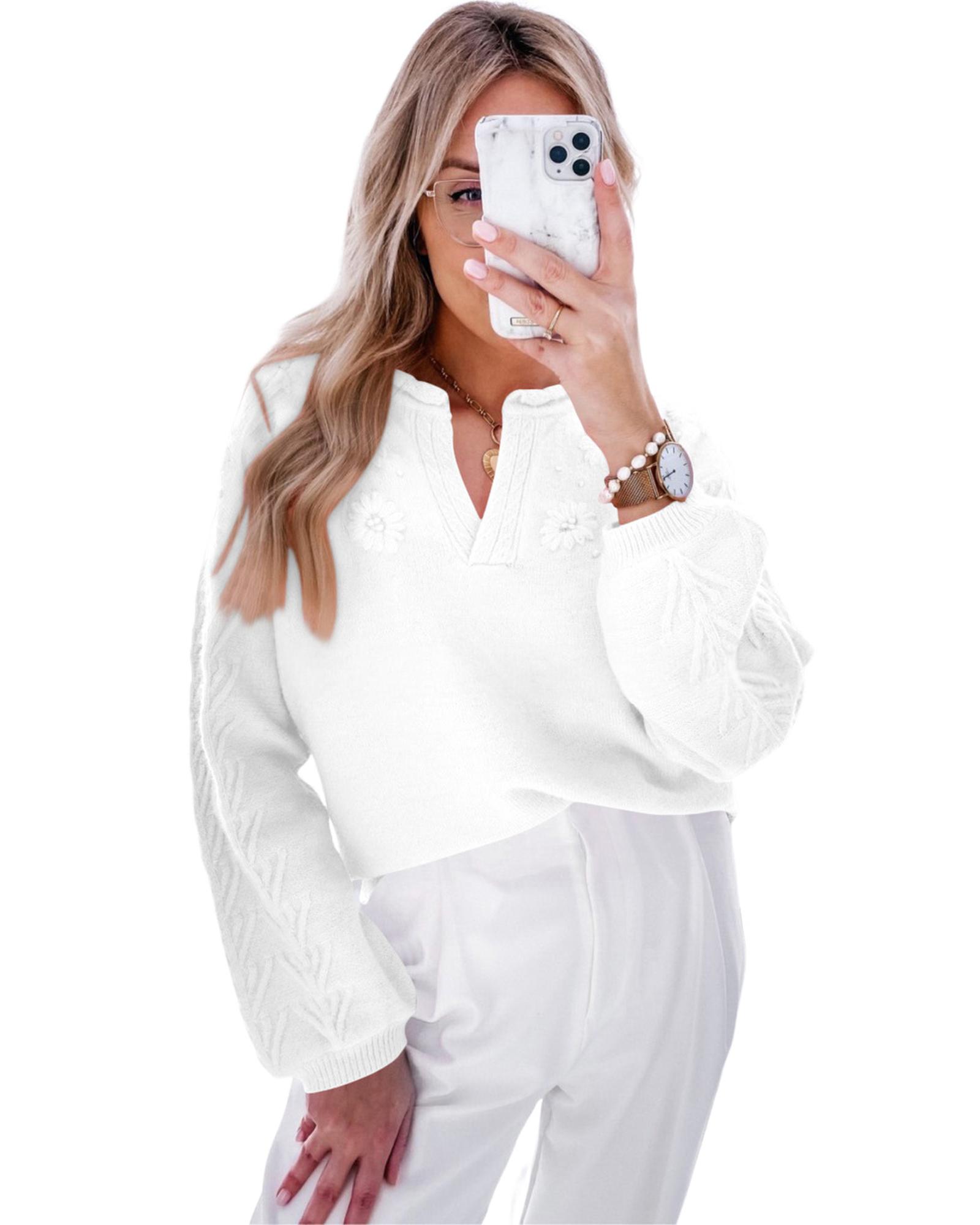 White Flower Detail Knitted Notched Neck Sweater – S