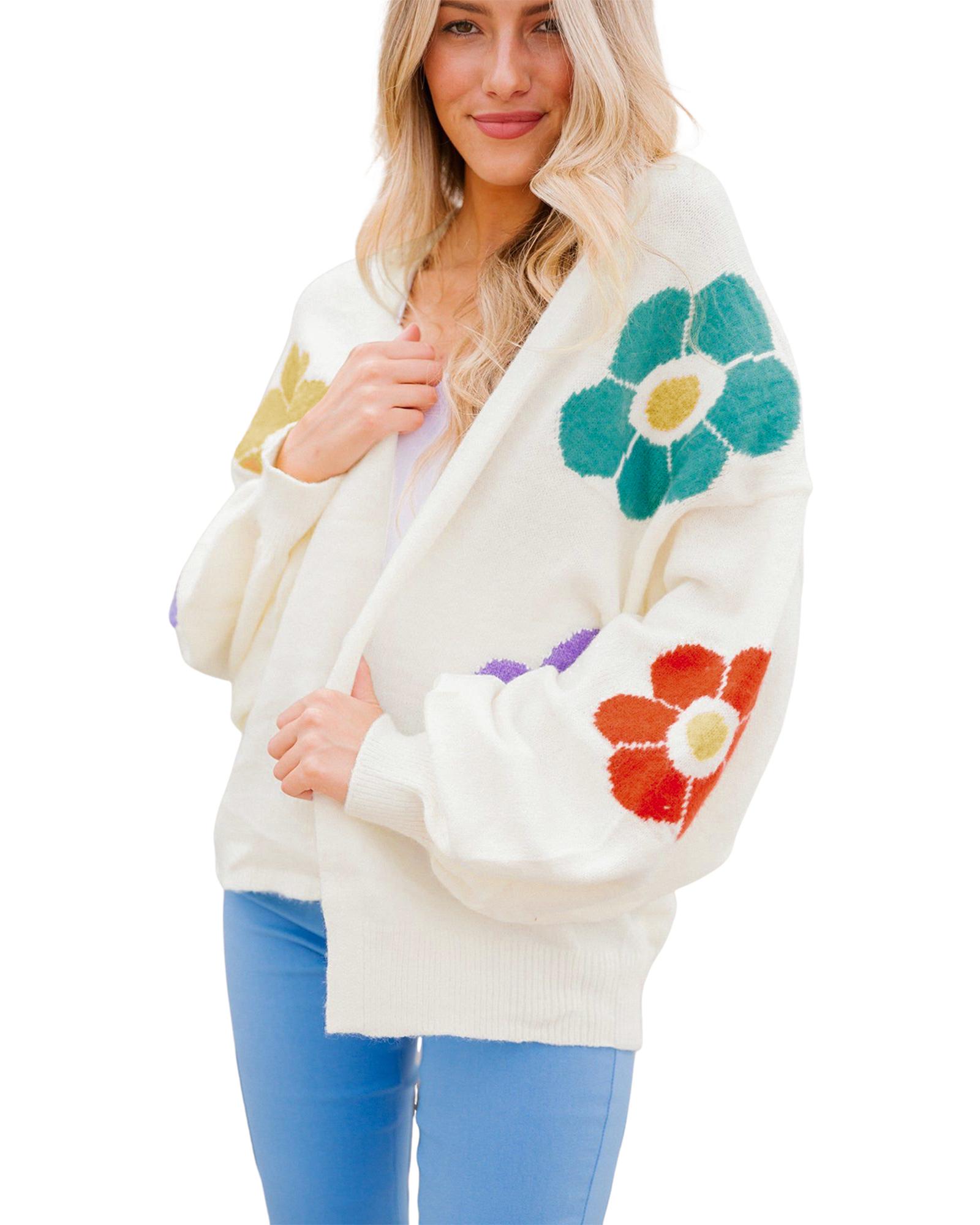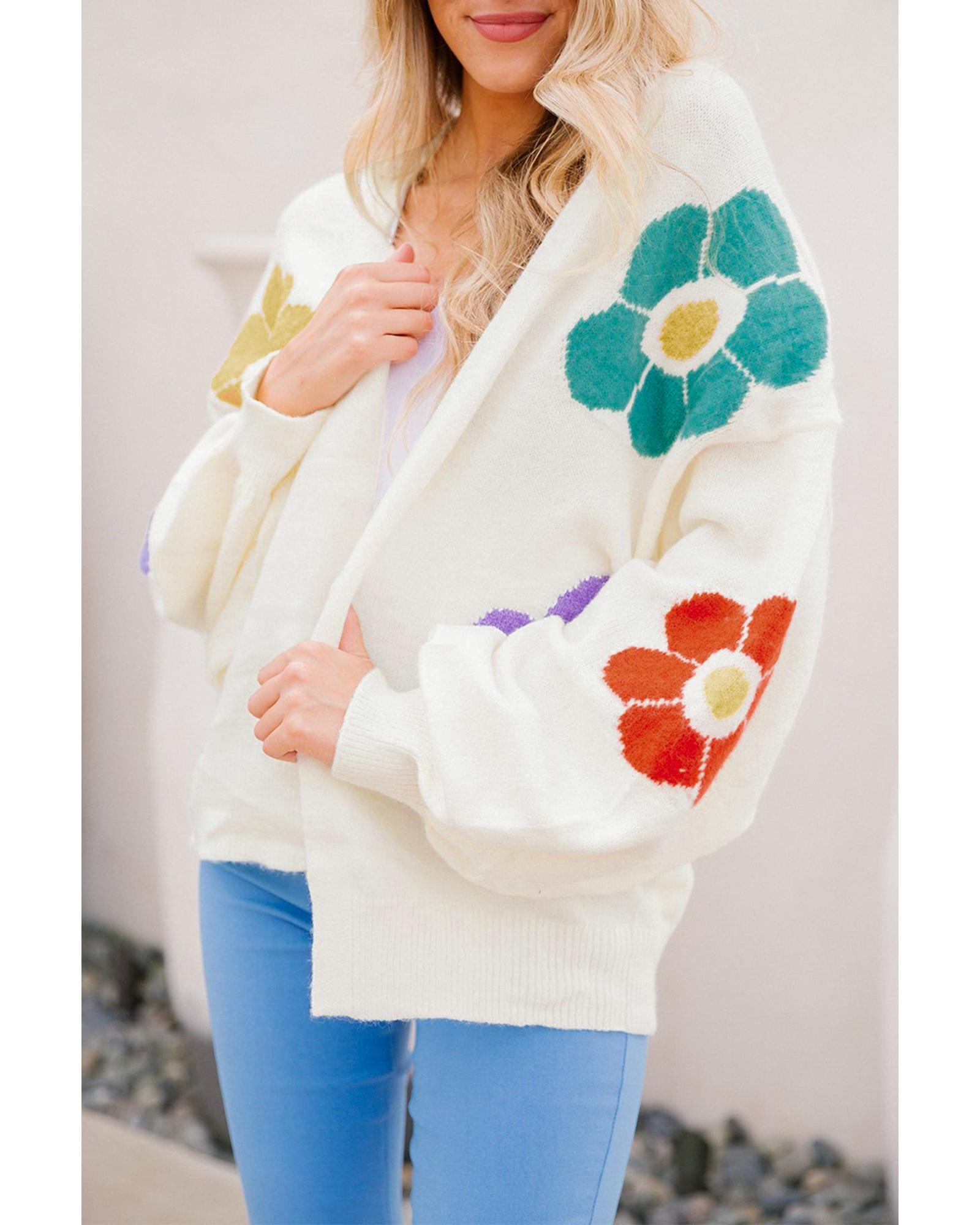 White Flower Jacquared Bubble Sleeve Open Cardigan – M