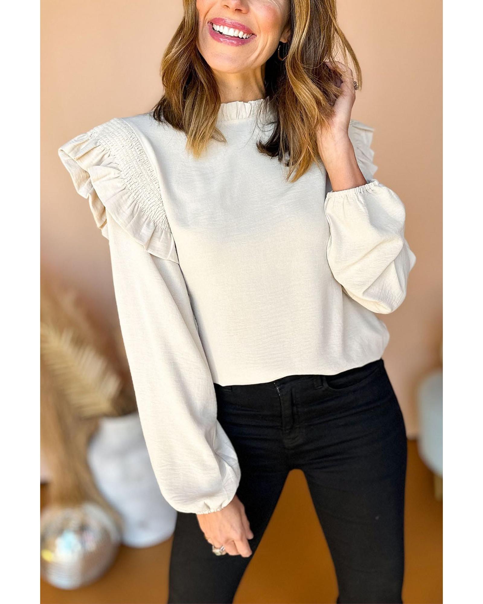 - Plain white blouse with shirred ruffled shoulder design