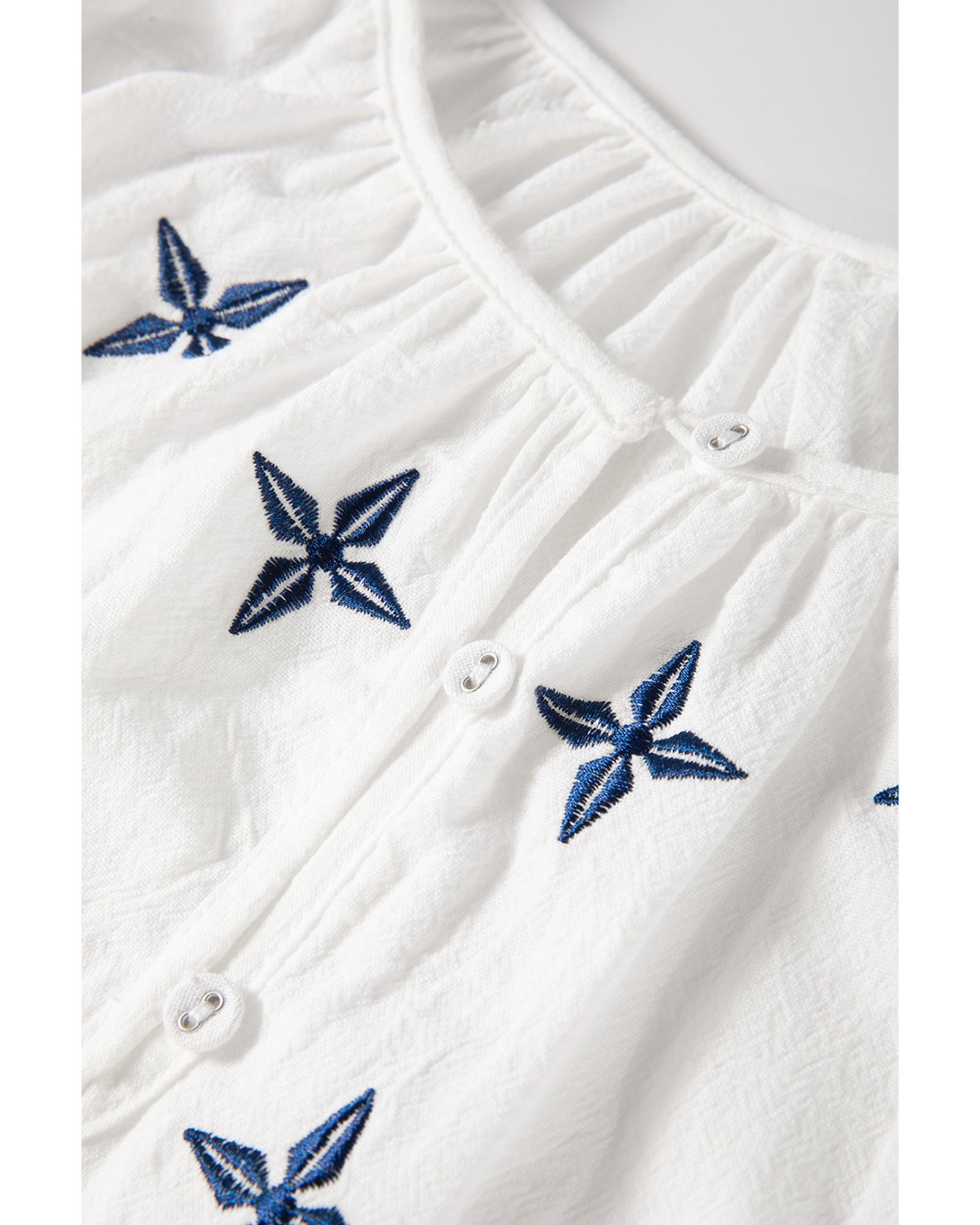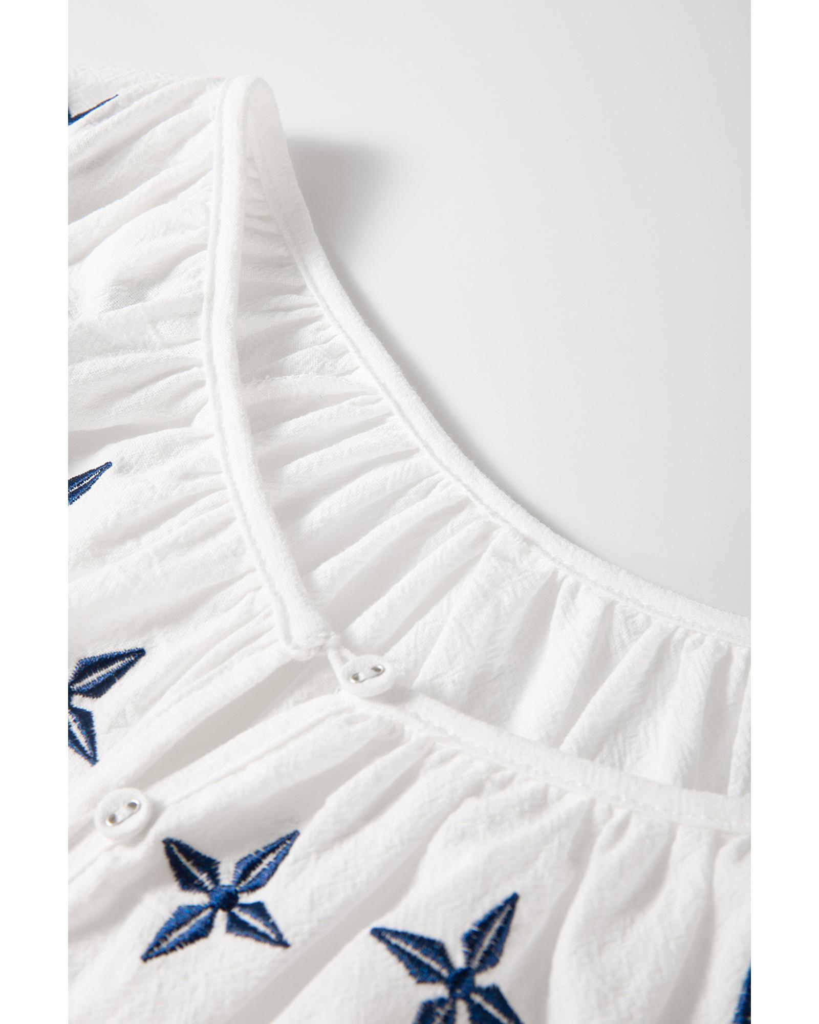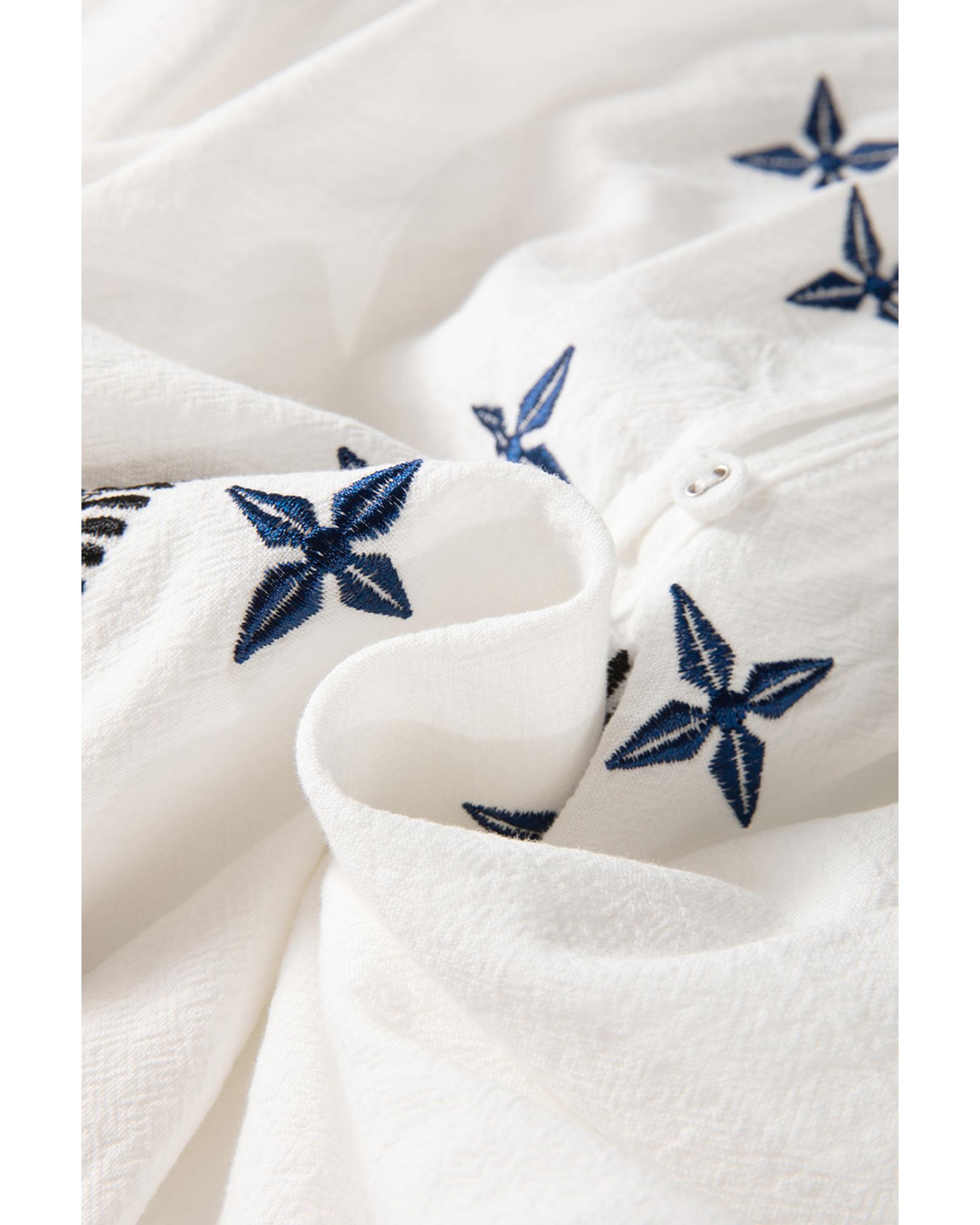 - White geometric embroidered long sleeve buttoned blouse