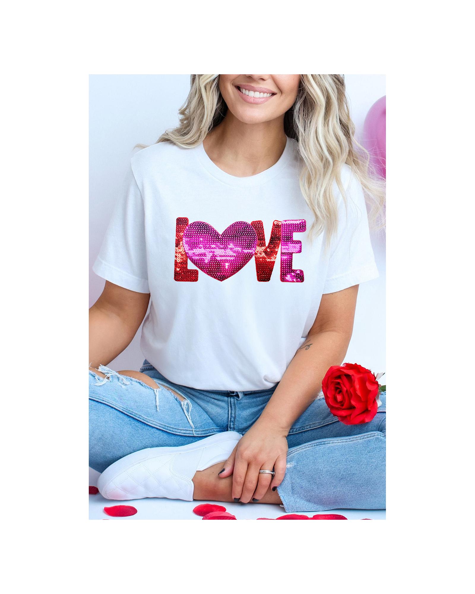 White Heart LOVE Patched Pattern Crewneck Valentines T Shirt – 2XL