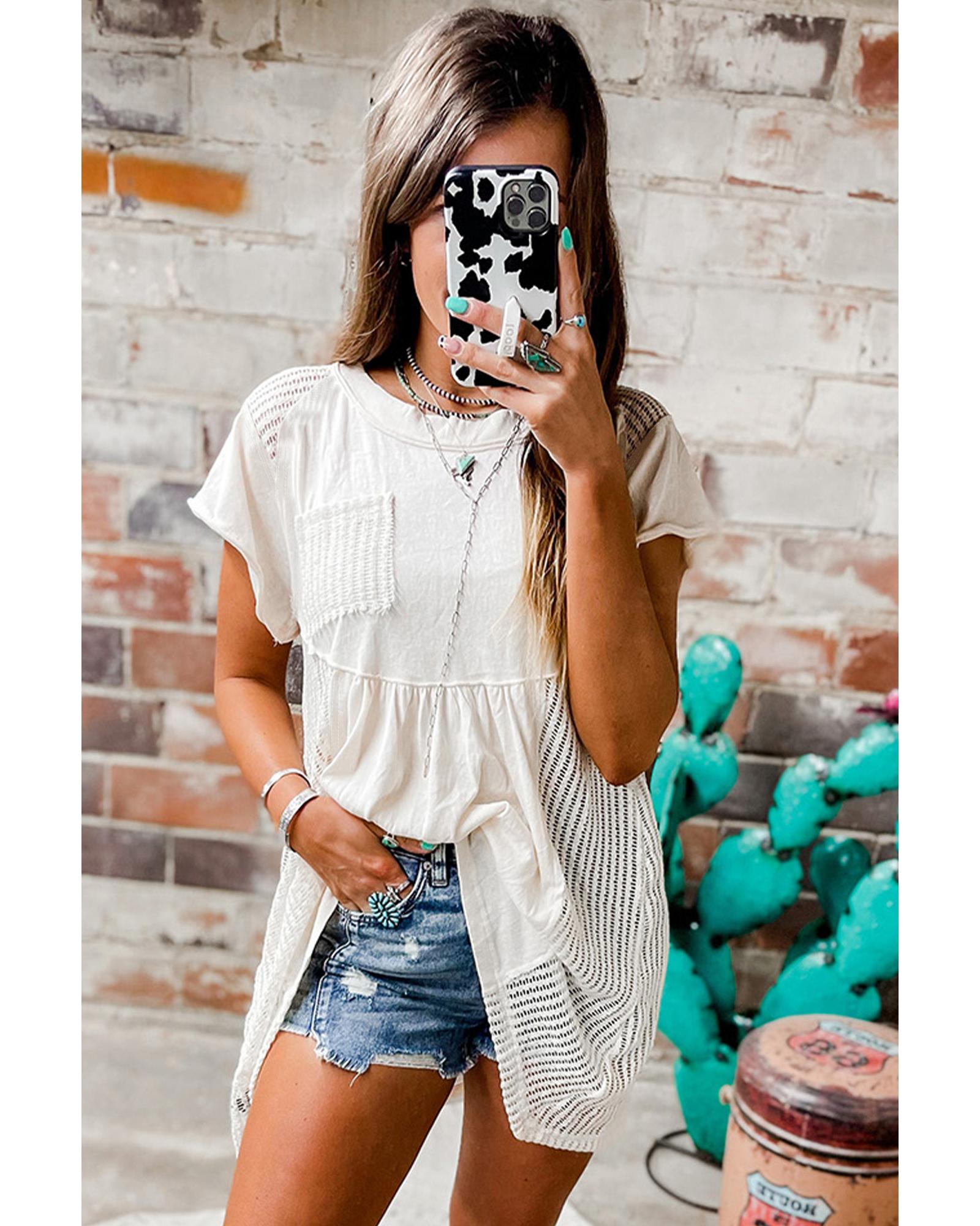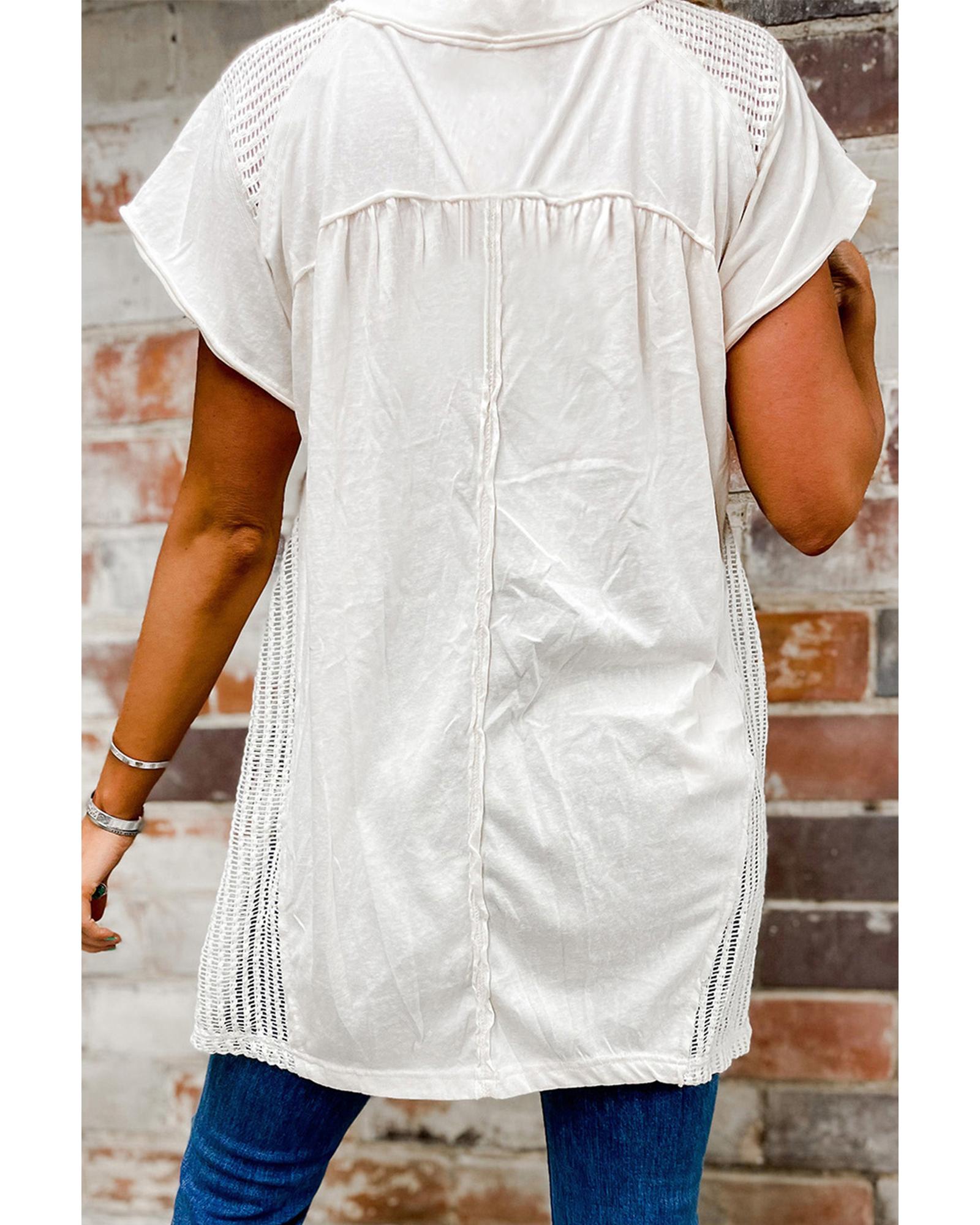 - White Hollow Knit Splicing Keyhole Back Tunic Top