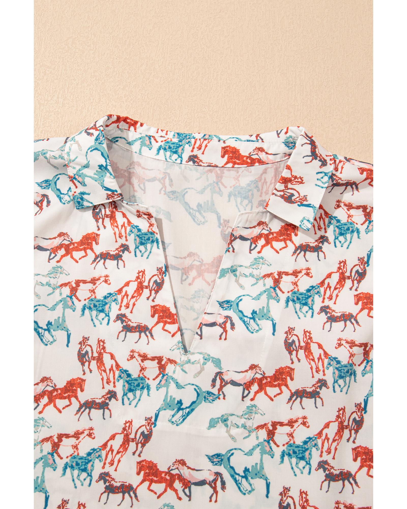 White Horse Galloping Allover Print Split Neck Plus Size Blouse – 3X