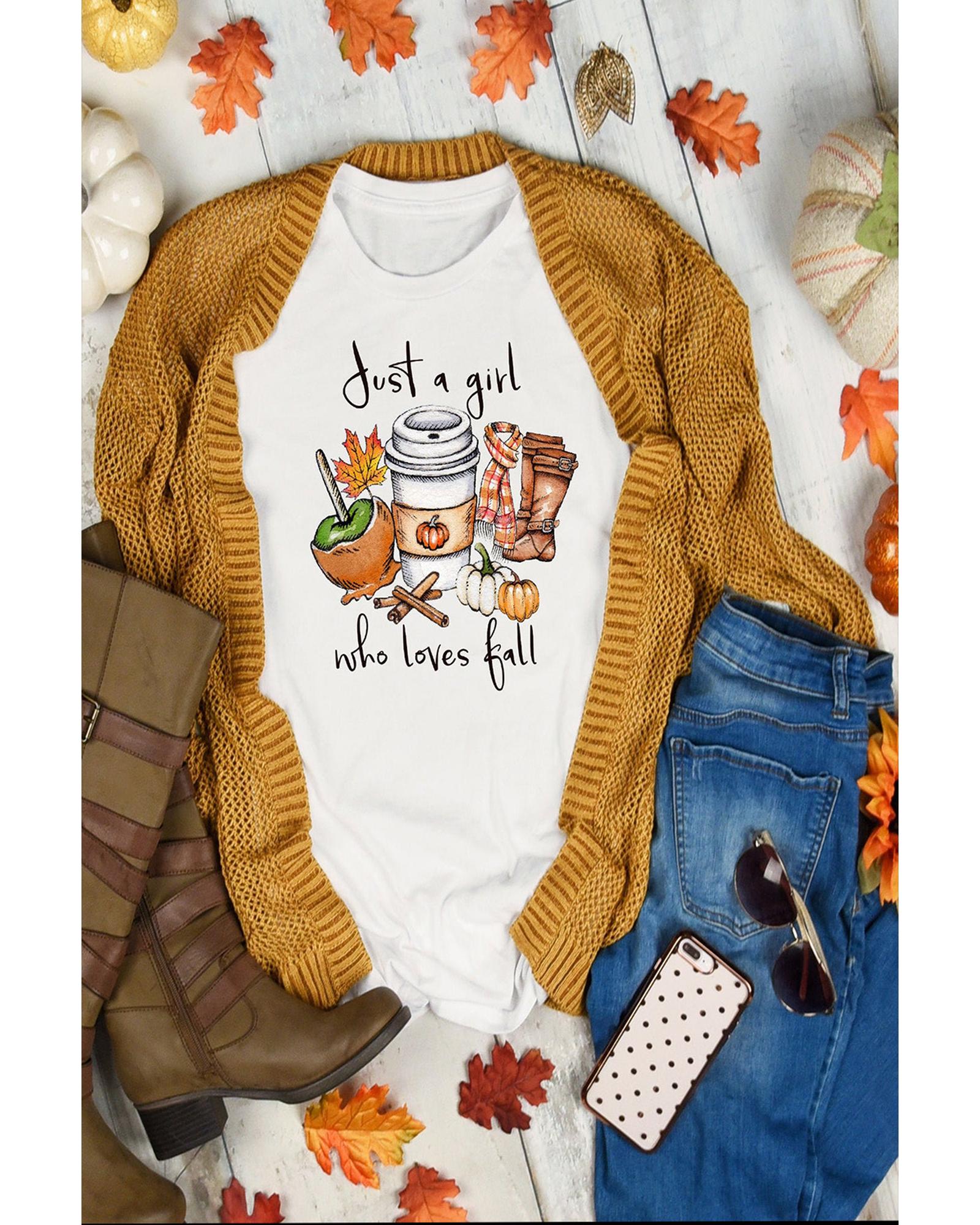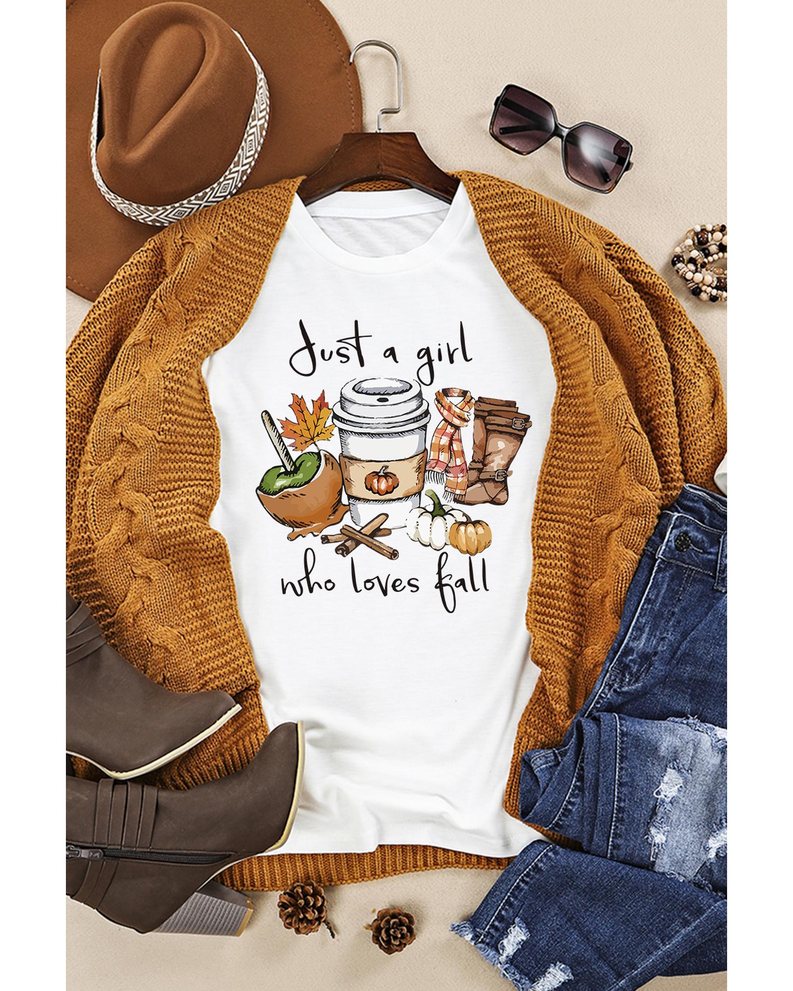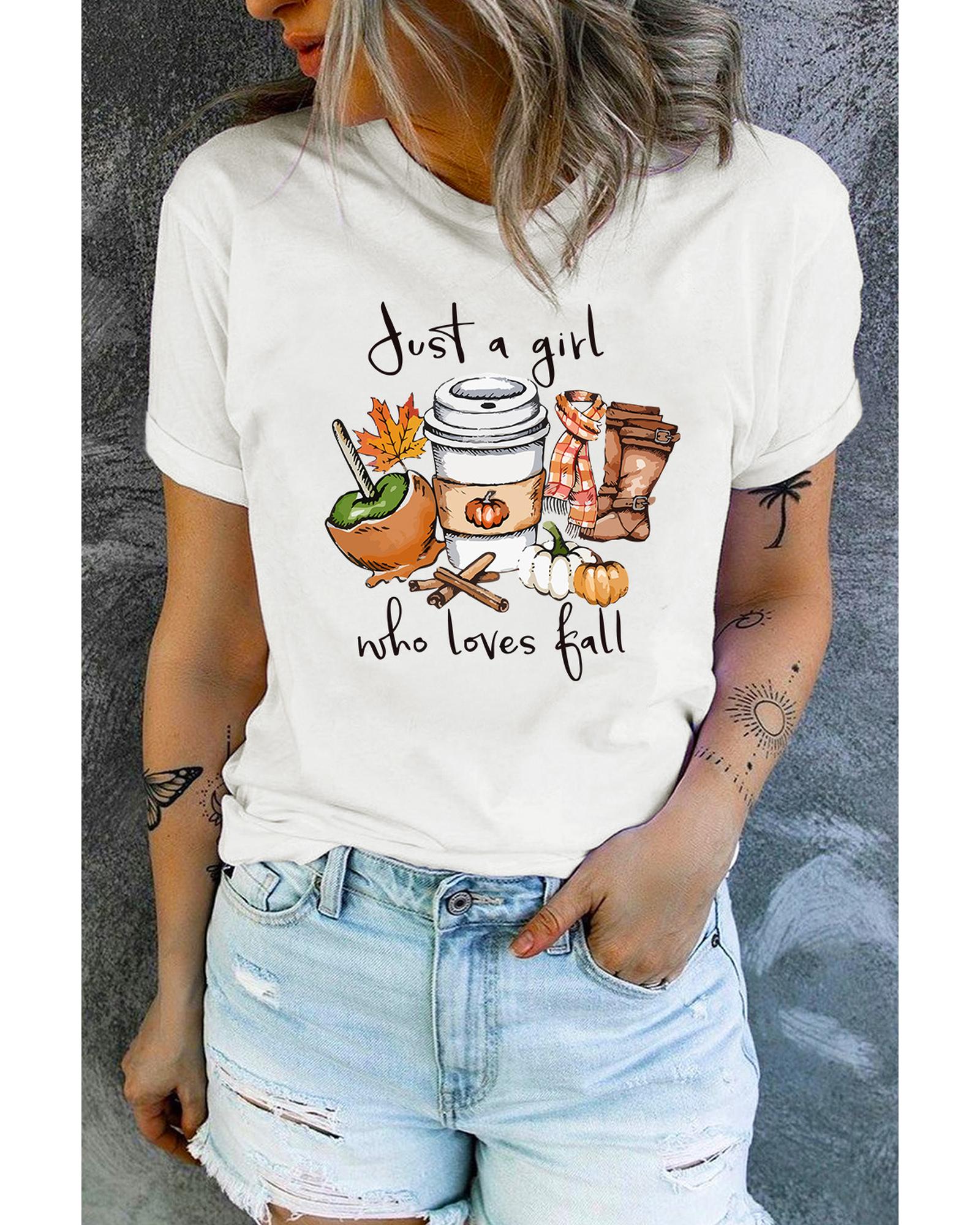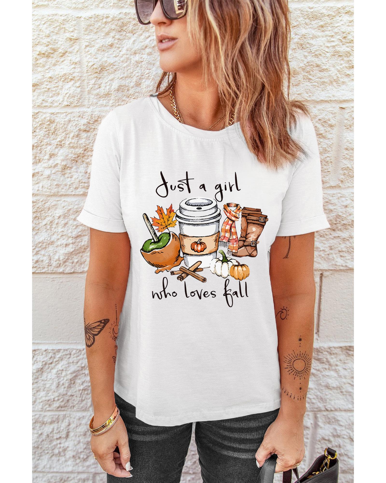 White Just A Girl Who Loves Fall Graphic T Shirt Fall Vibe Graphic Print Crew Neck High - quality materials Stylish and unique design Comfortable and relaxed fit Versatile and easy to style Available in multiple sizes