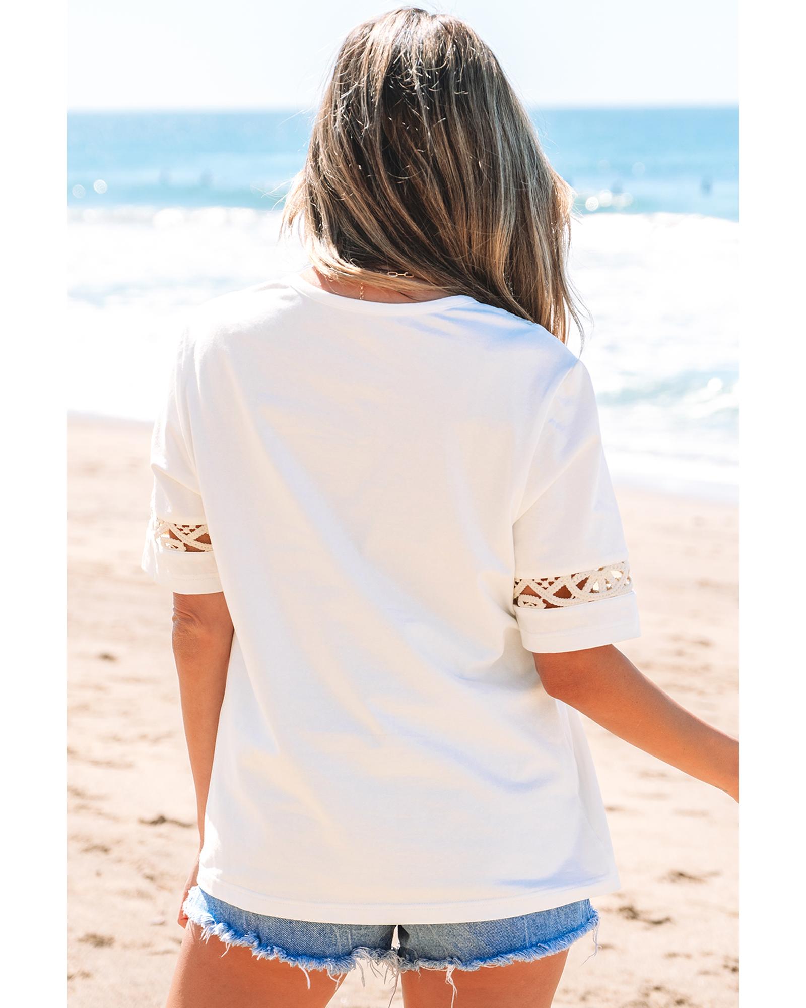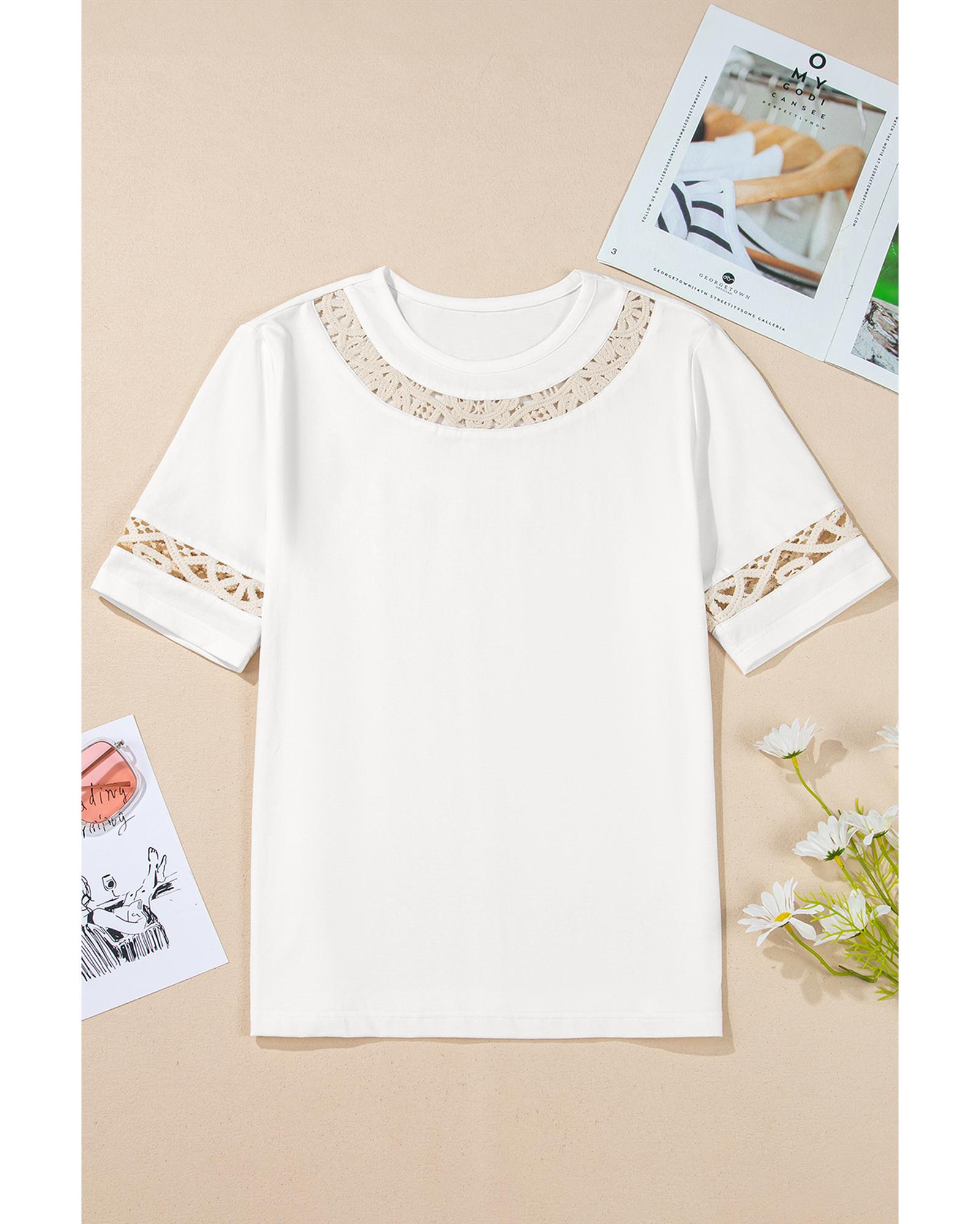 White Lace Crochet Crew Neck Casual T Shirt – S