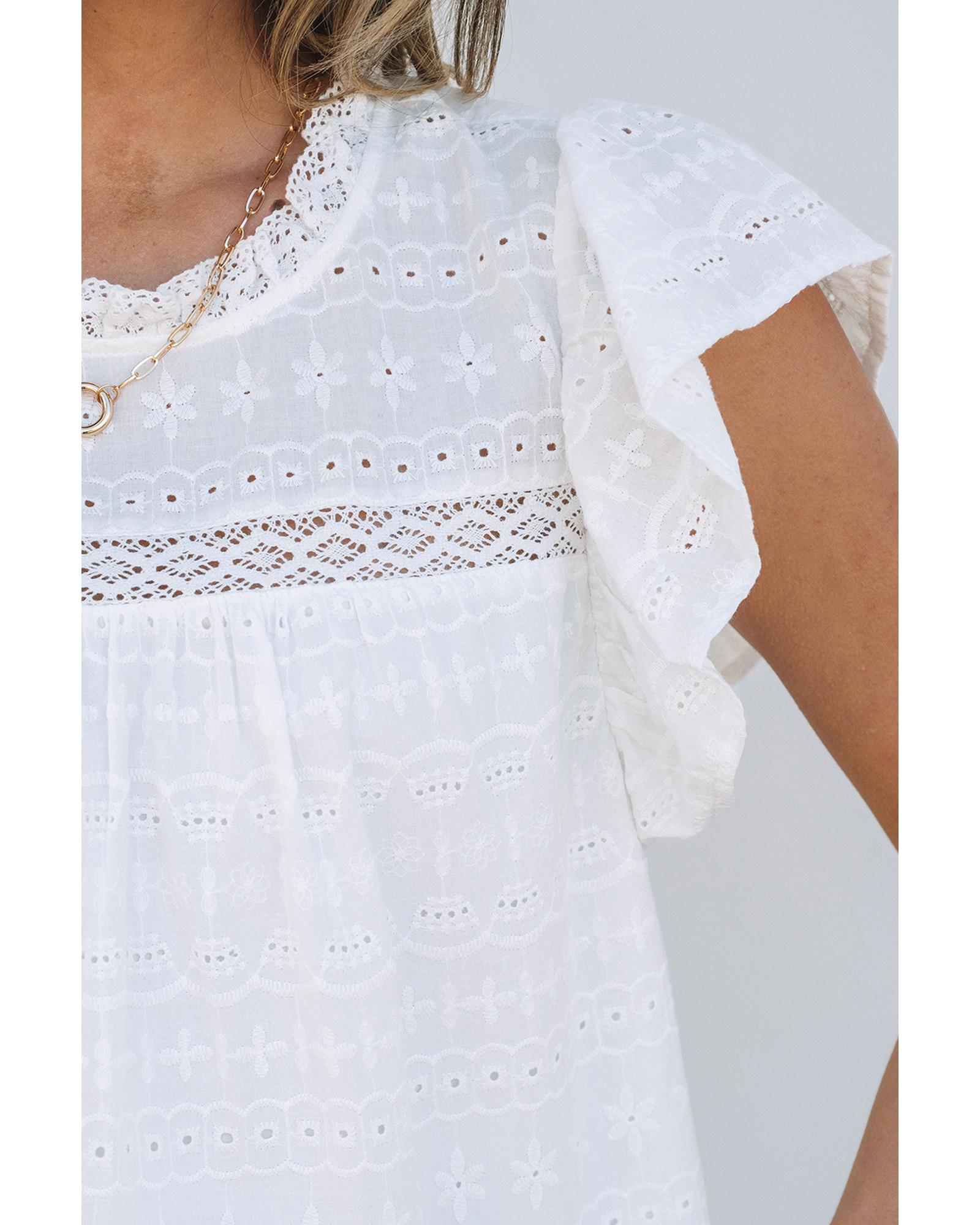 White Lace Neckline Flutter Sleeve Eyelets Blouse – L