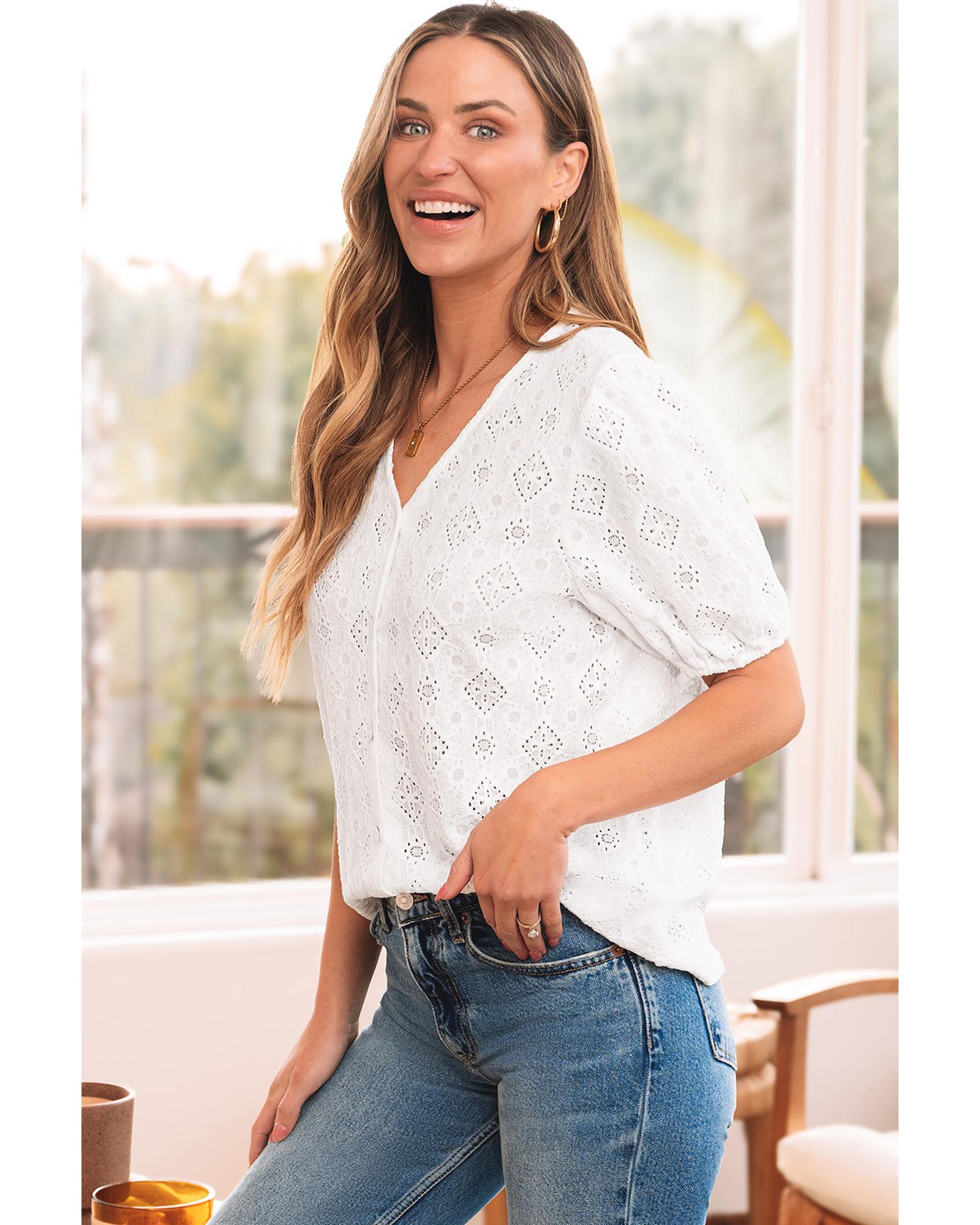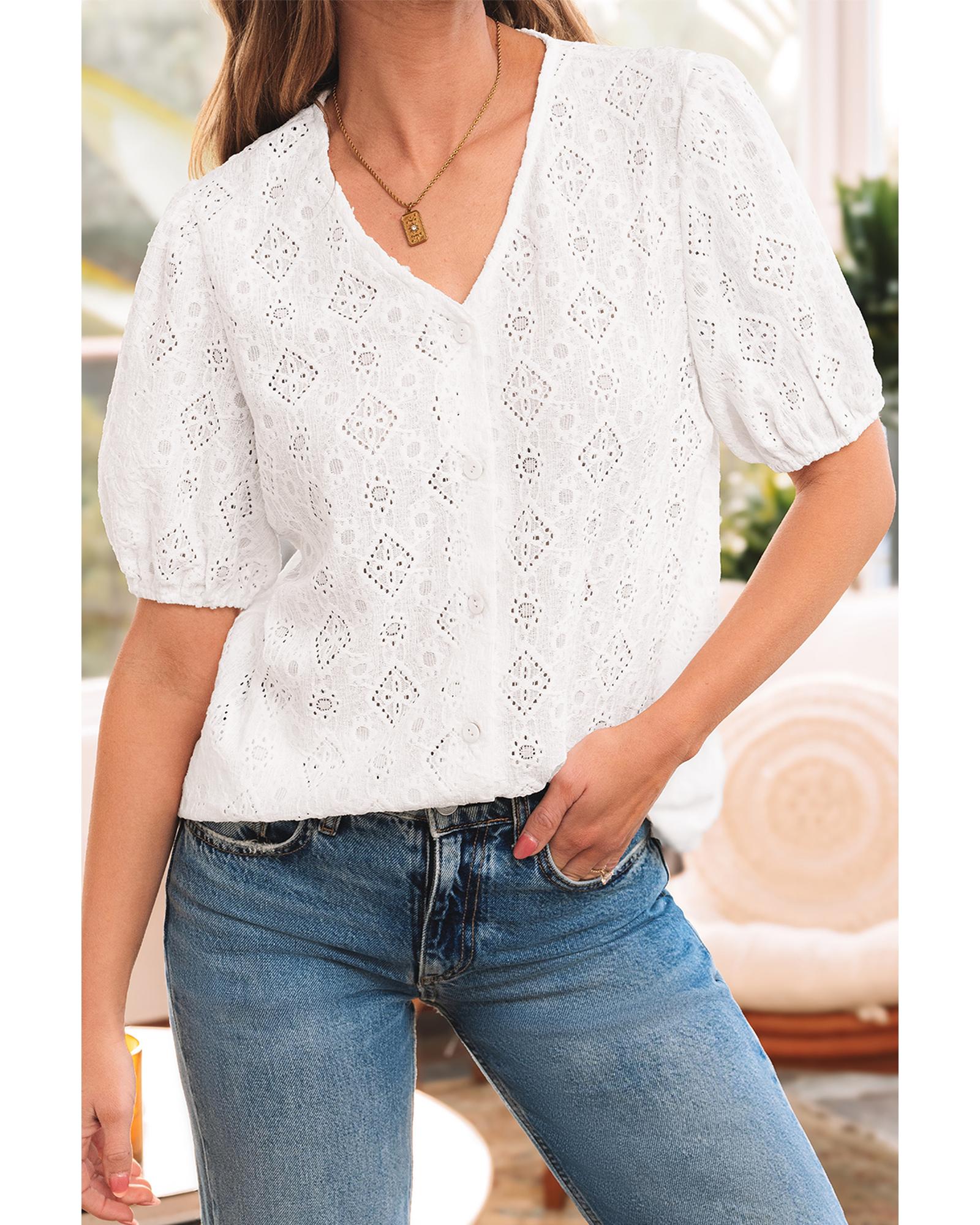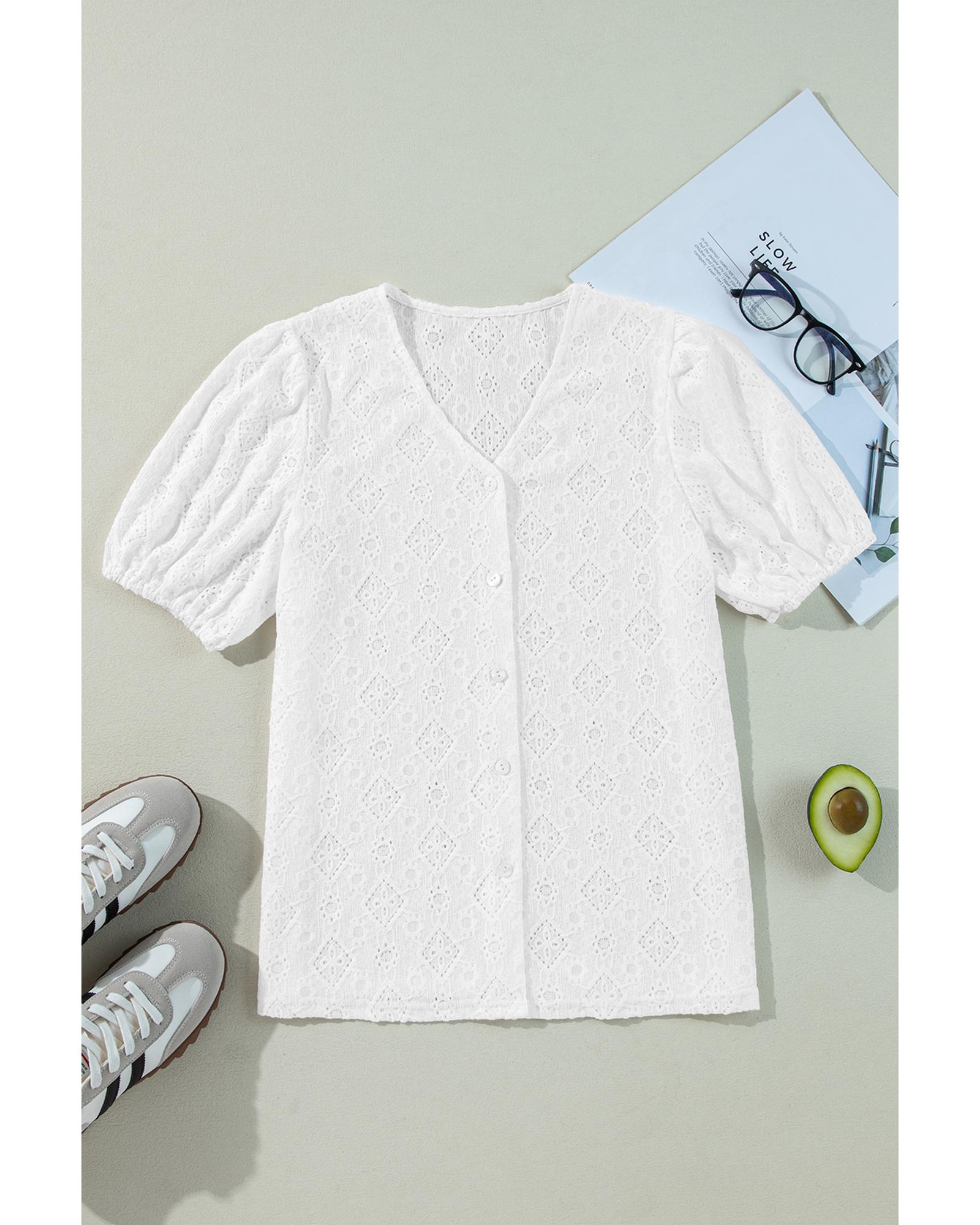 White Lace Puff Sleeve V Neck Button Up Shirt – M