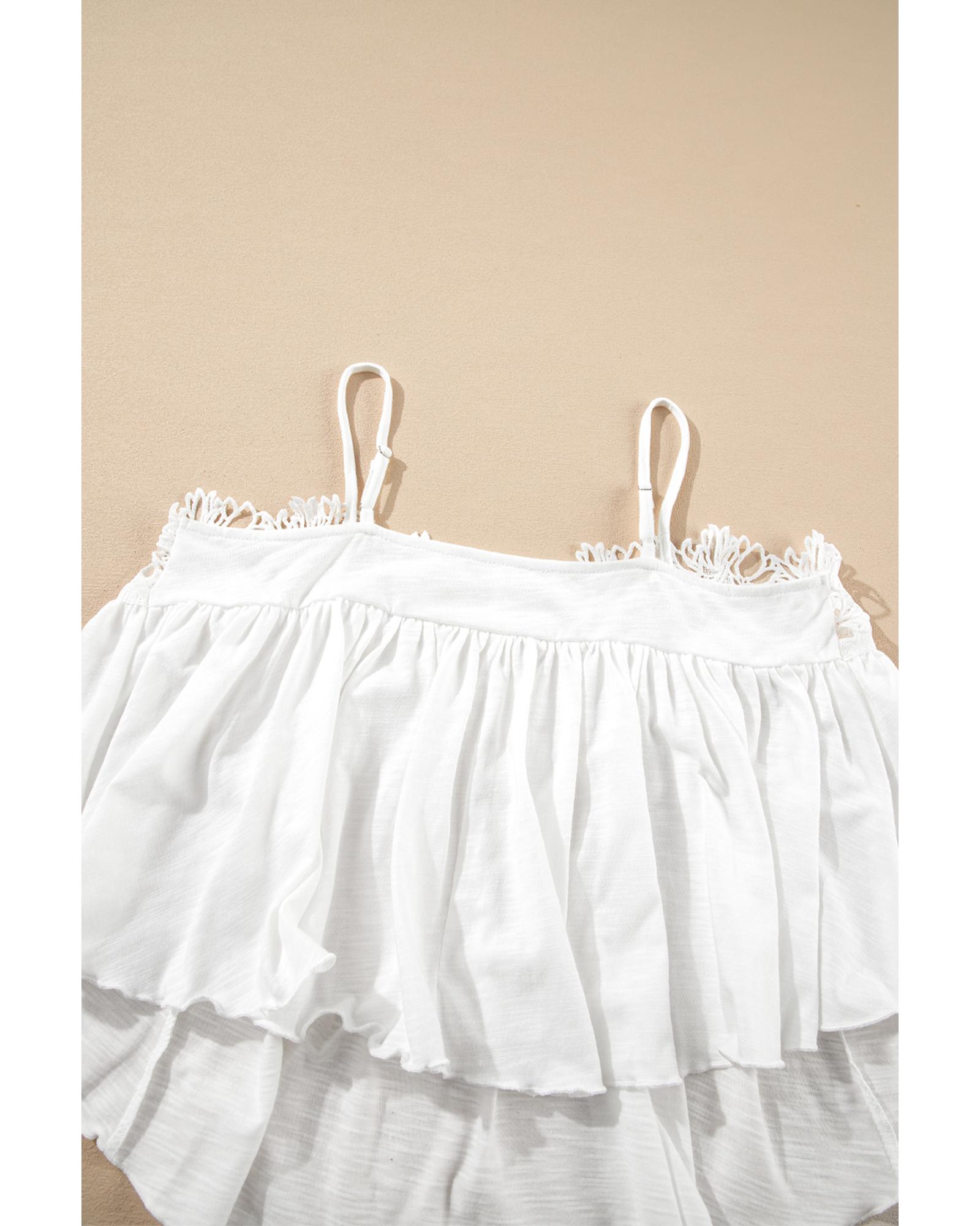 White Lace Splicing Spaghetti Straps Ruffle Flared Tank Top – L