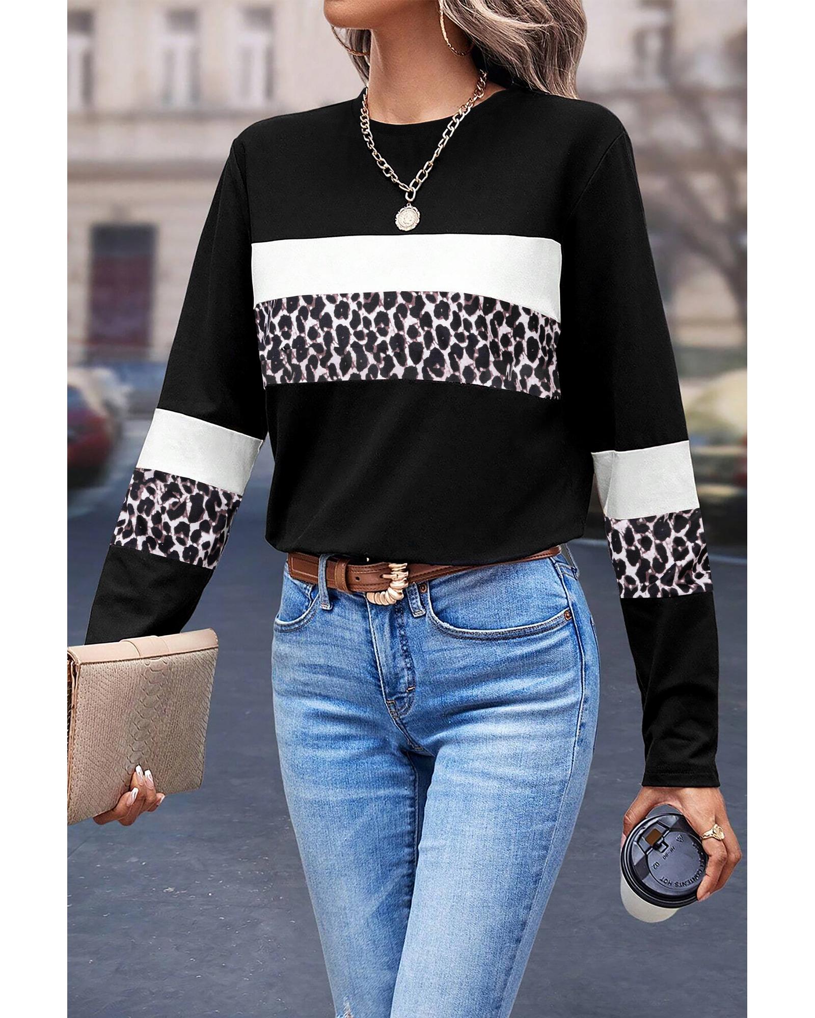 White Leopard Colorblock Patchwork Crew Neck Long Sleeve Tee – L