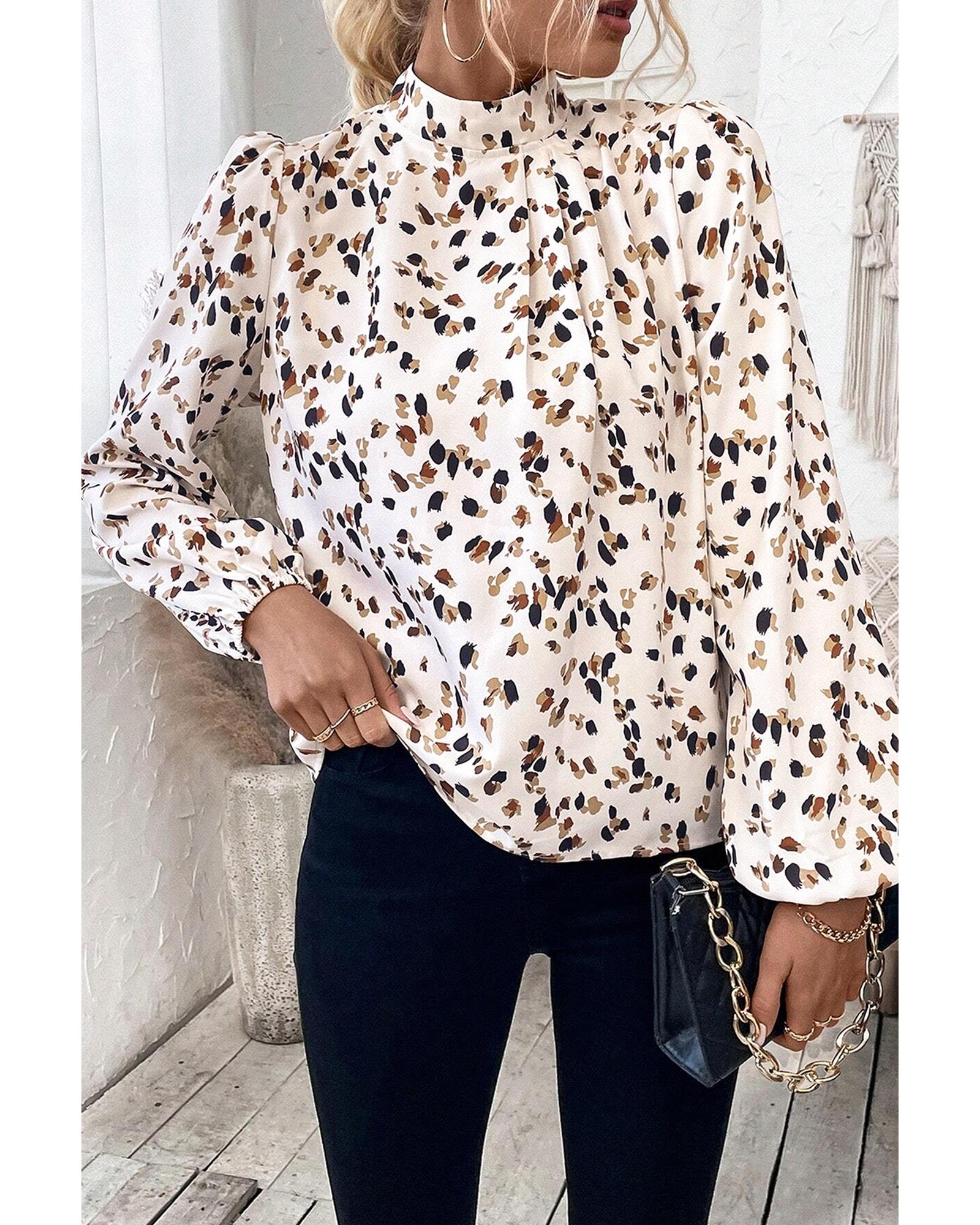 White Leopard Print Lantern Sleeve Mock Neck Pleated Blouse – M