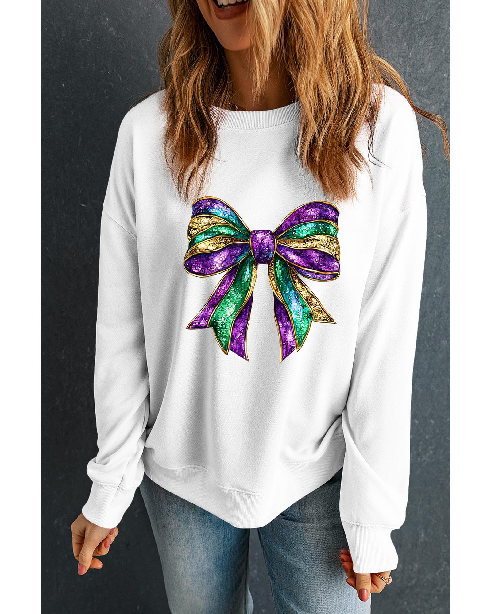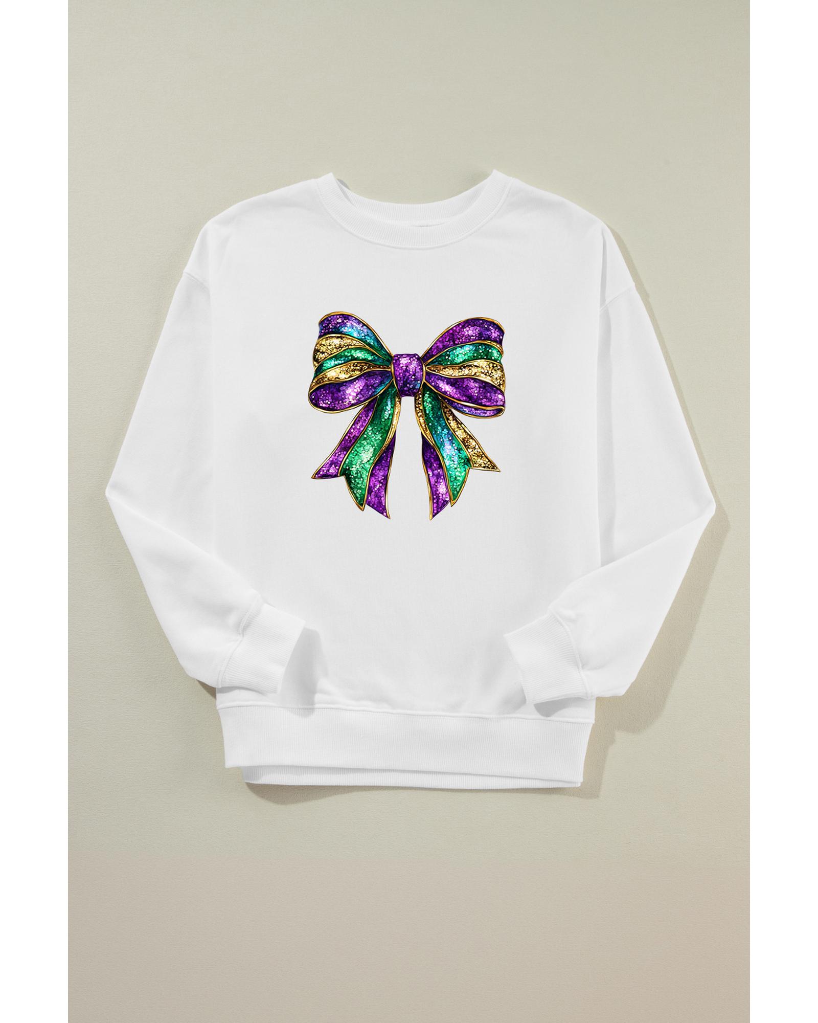 White Mardi Gras Bow Graphic Drop Shoulder Sweatshirt – M