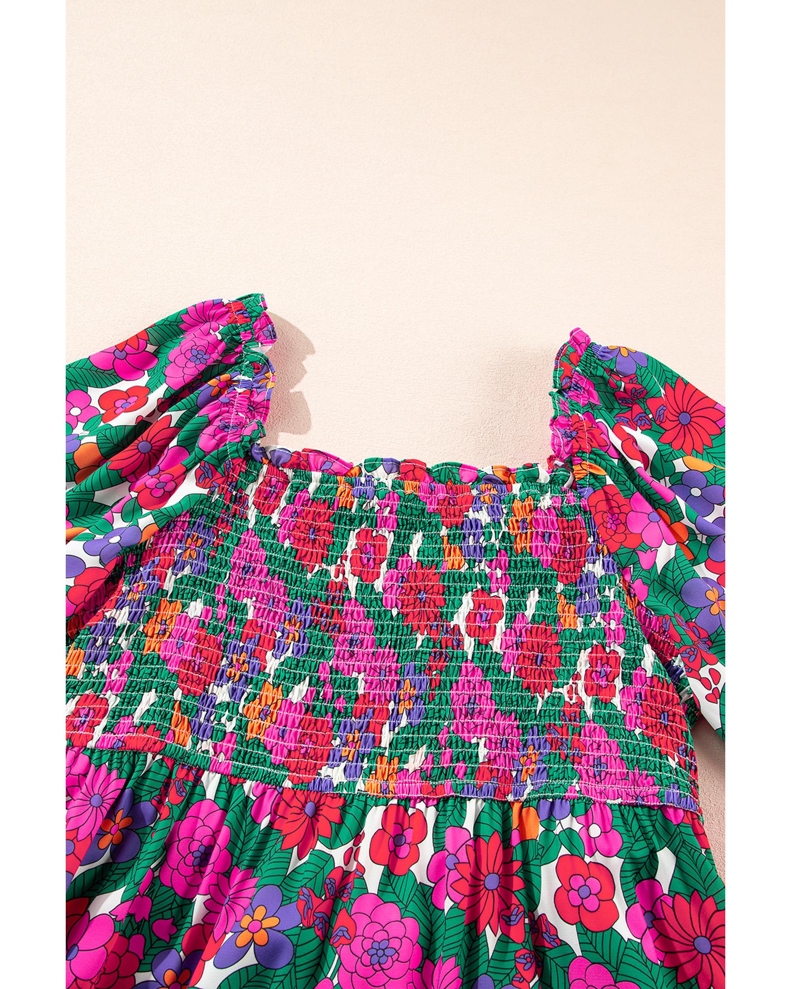White Plus Size Floral Frilled Square Neck Shirred Long Sleeve Dress - 3X