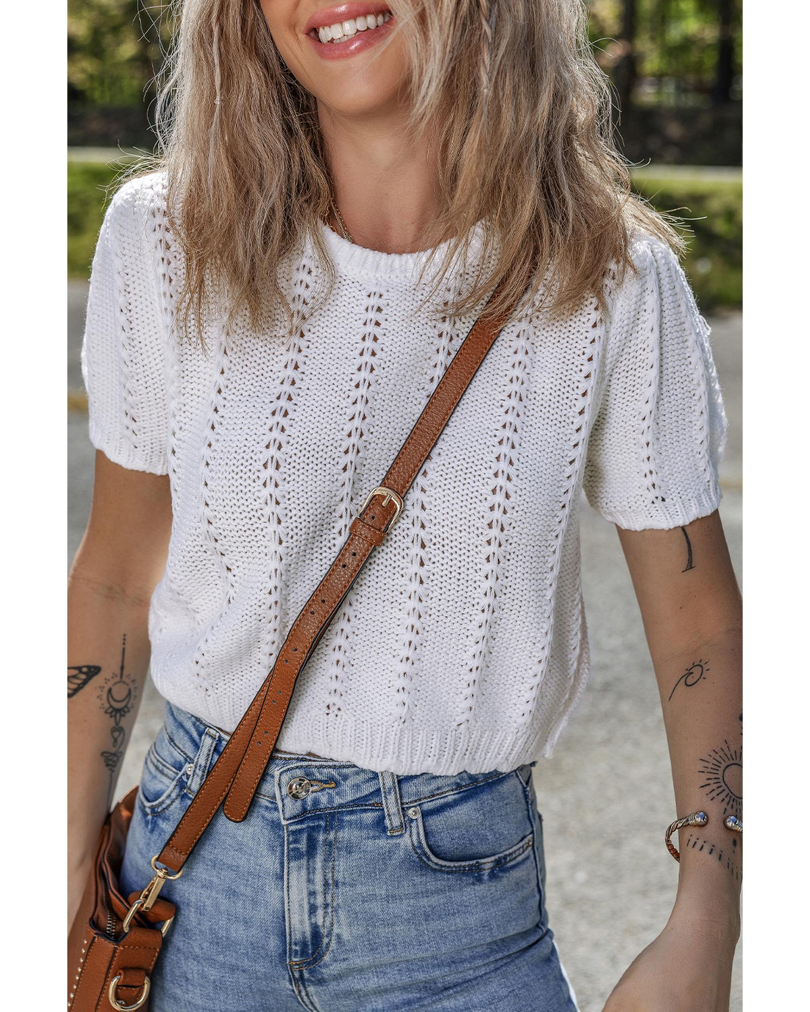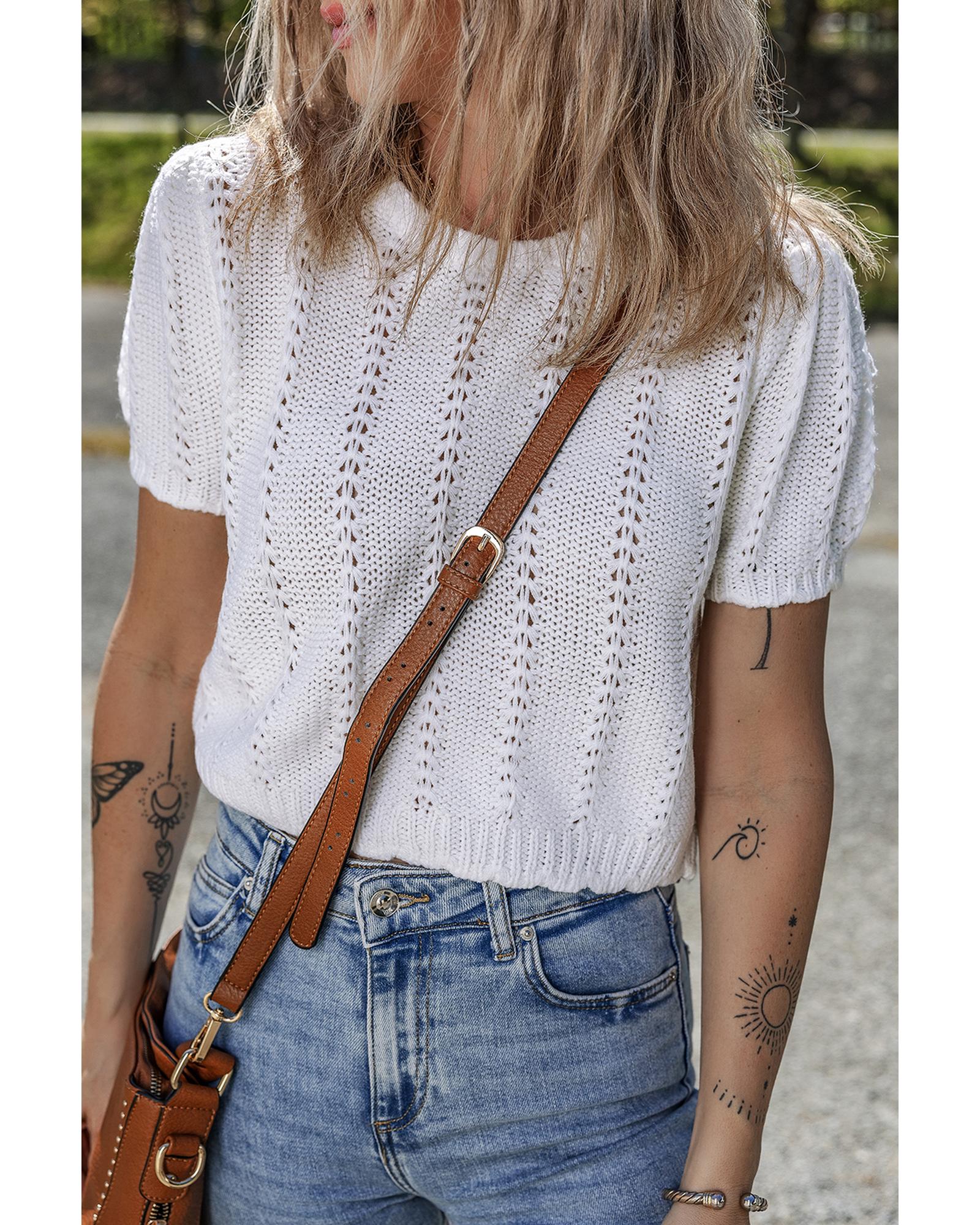 White Pointelle Knit Short Puff Sleeve Crewneck Sweater – L