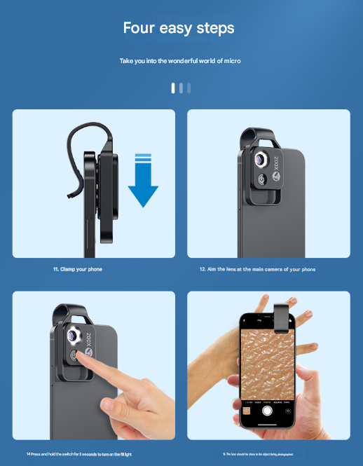 • Easy to Use – No App Needed: Enjoy hassle-free operation. Simply clip the lens over your phone’s main camera, turn on the light, and start exploring. No special apps or software are required.