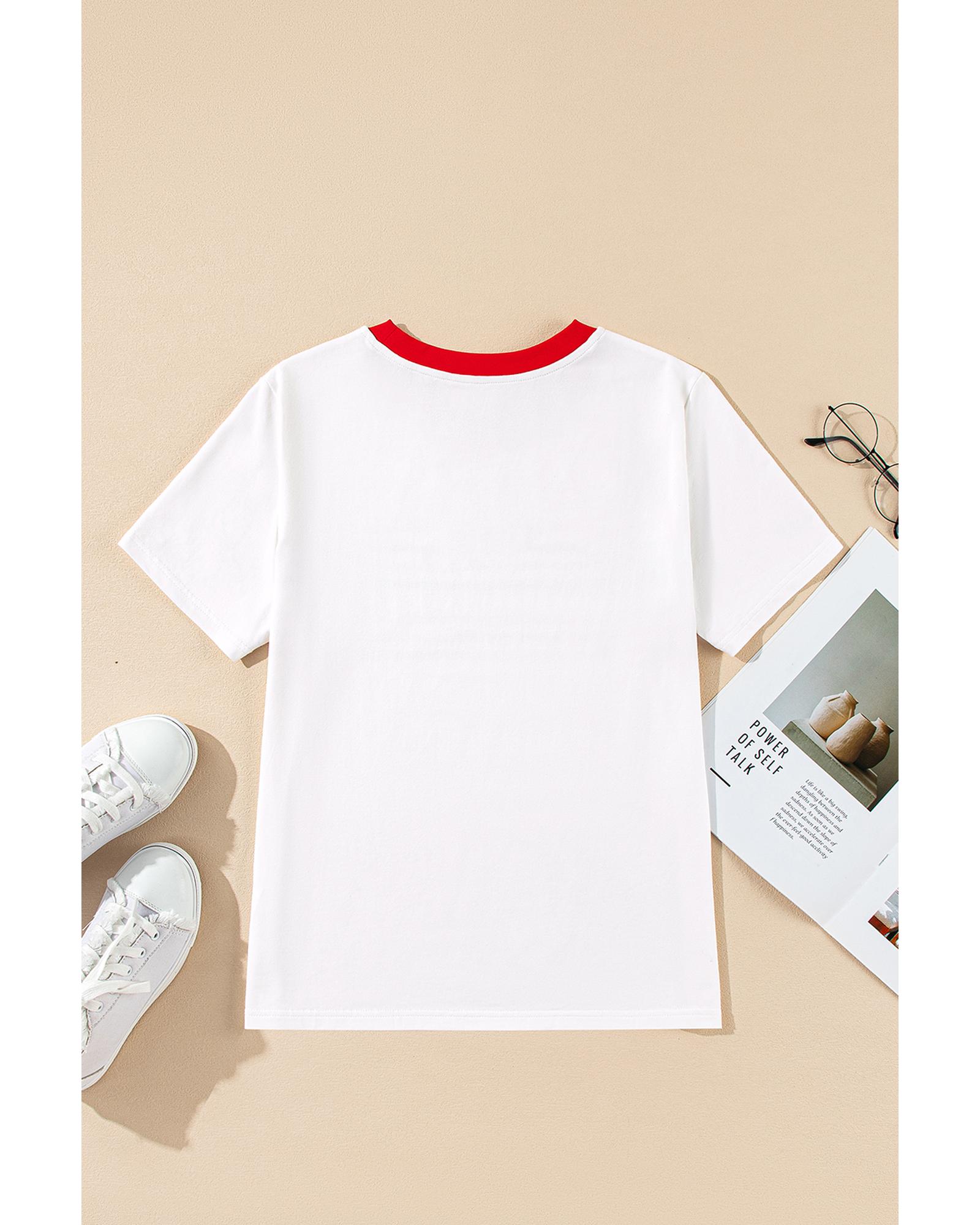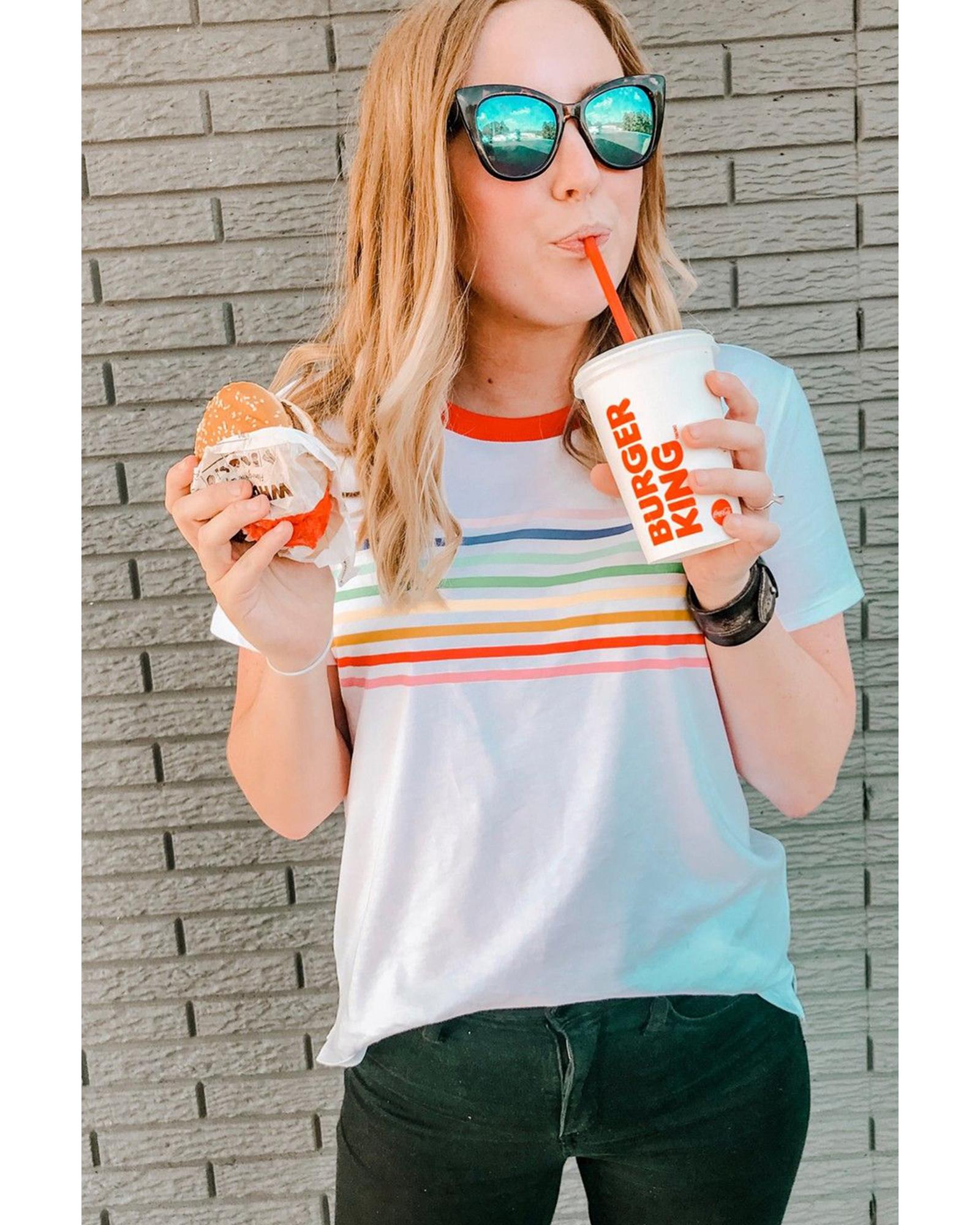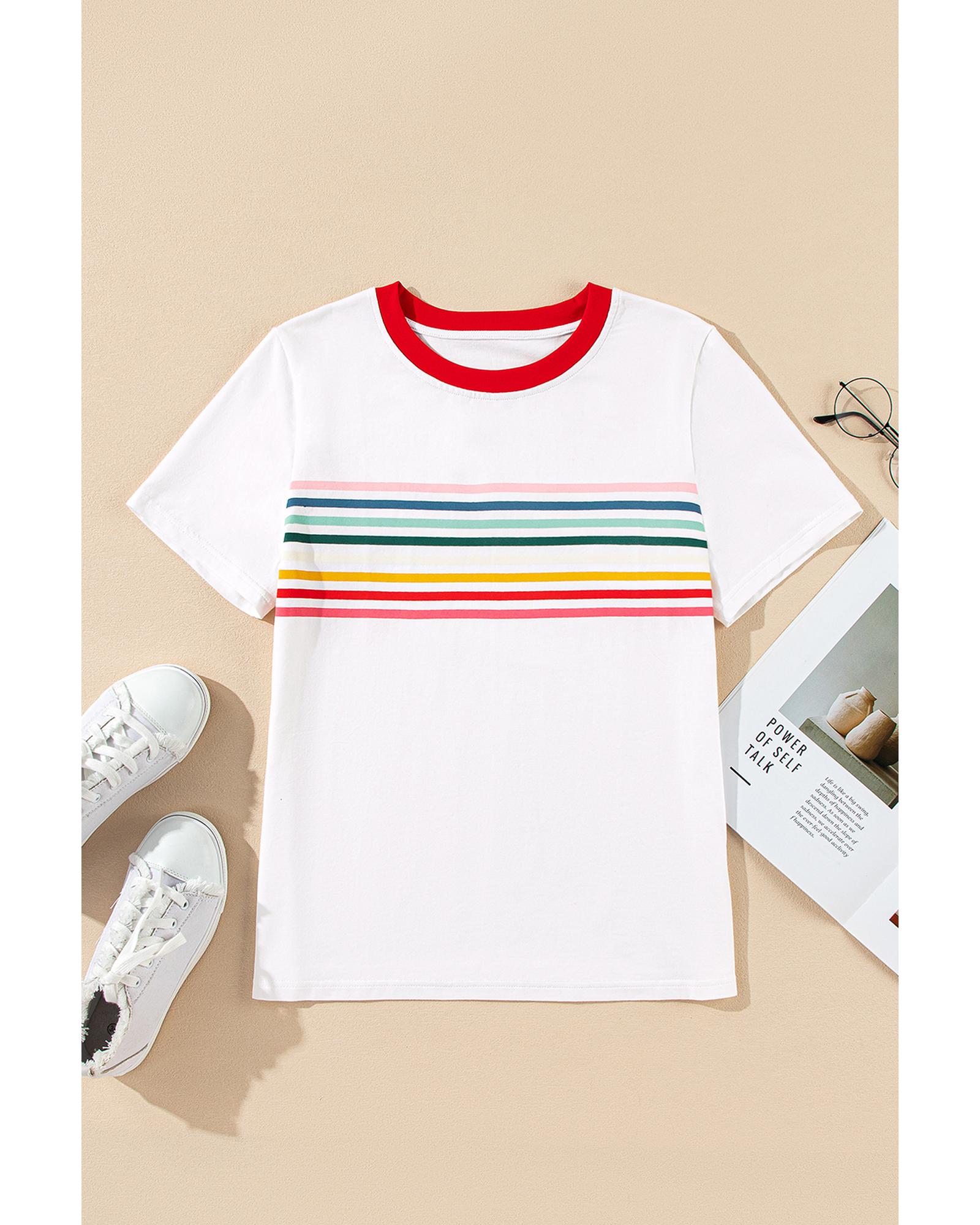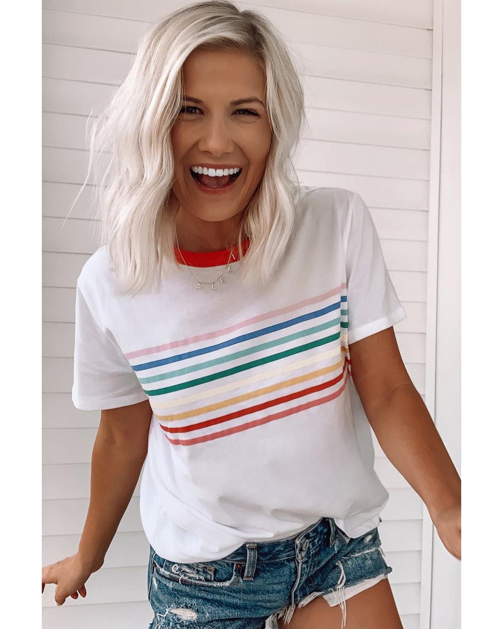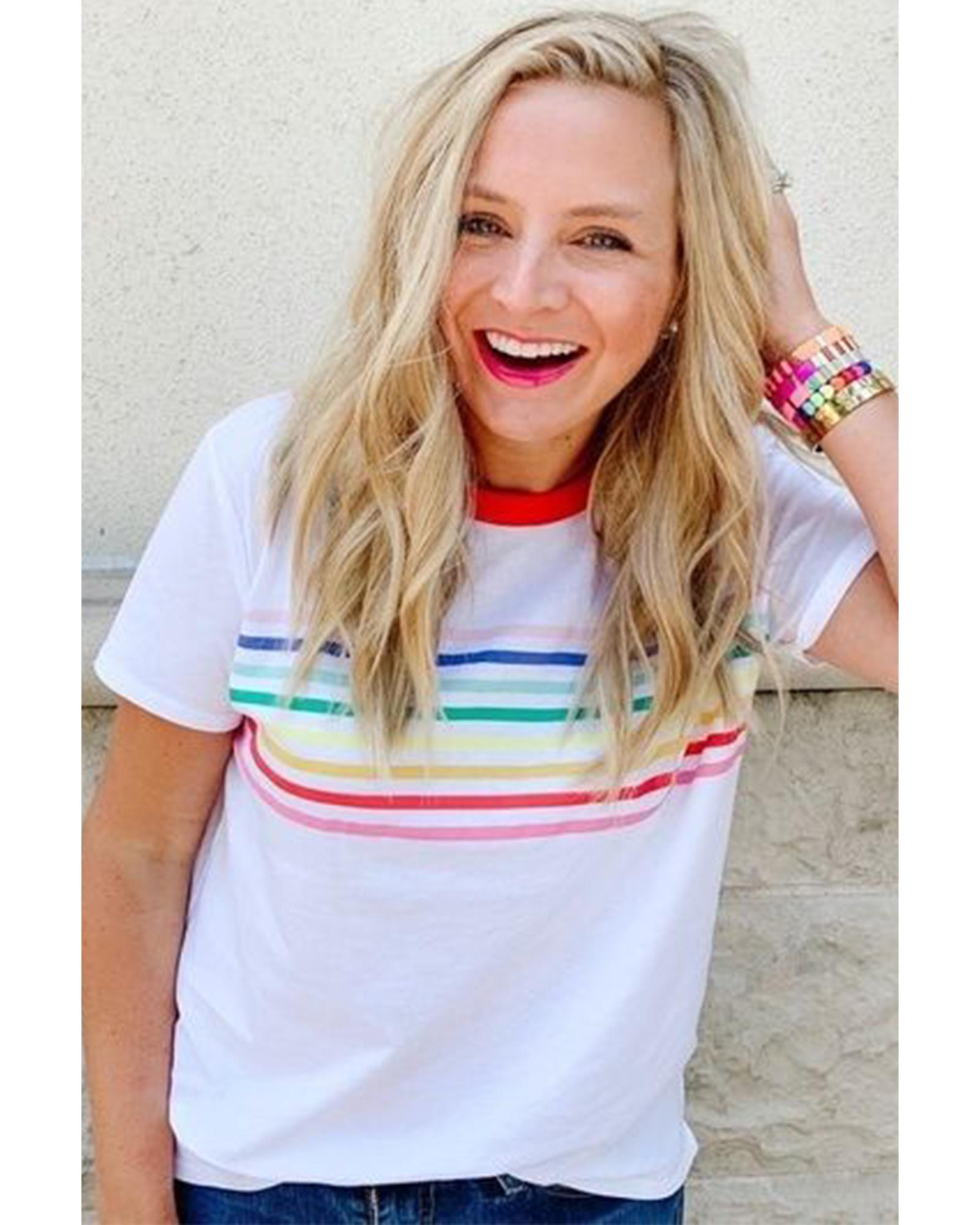 White Rainbow Stripe Print Contrast Crewneck T Shirt – L