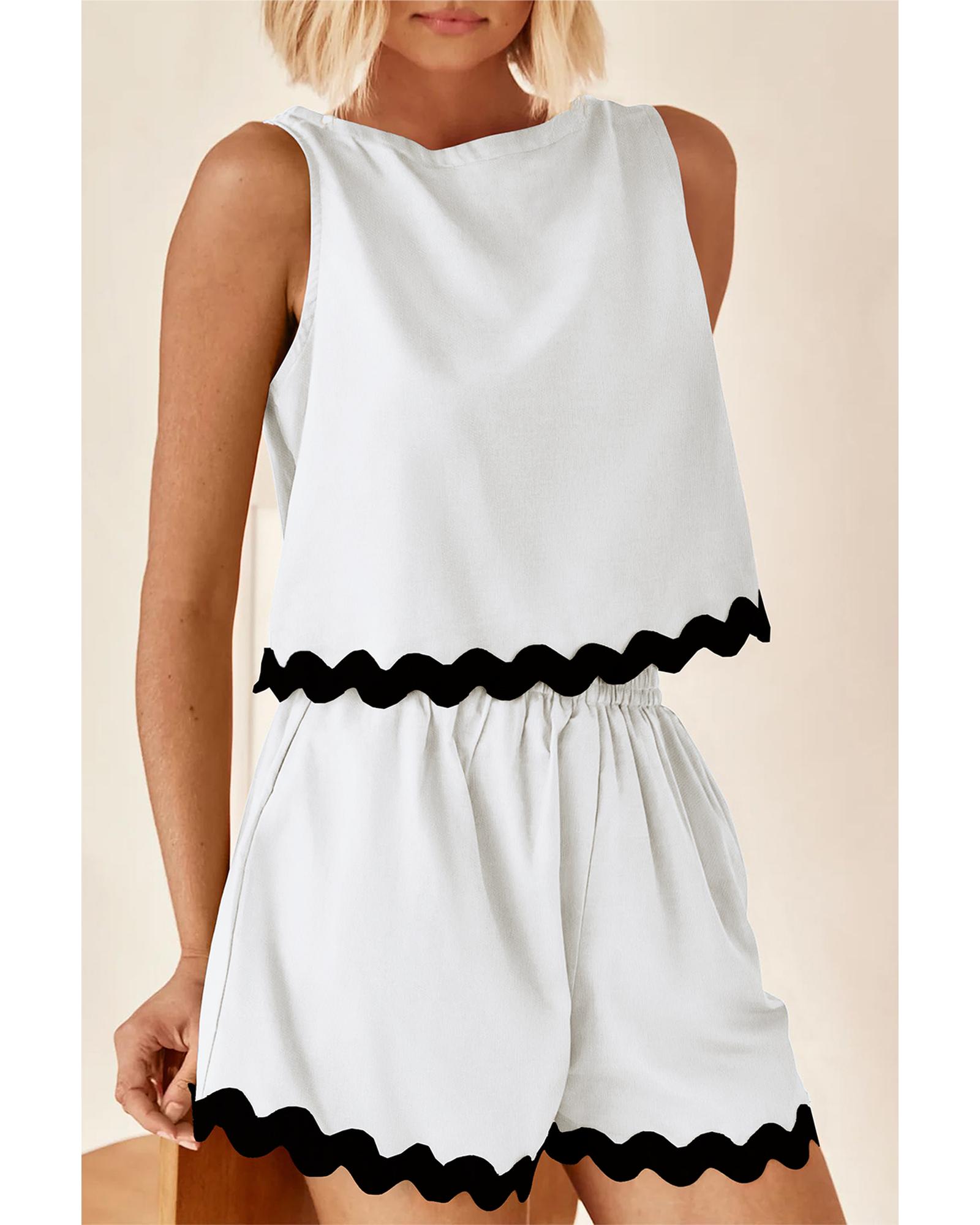 White Ricrac Trim Tank Top Elastic Waist Shorts Set – L