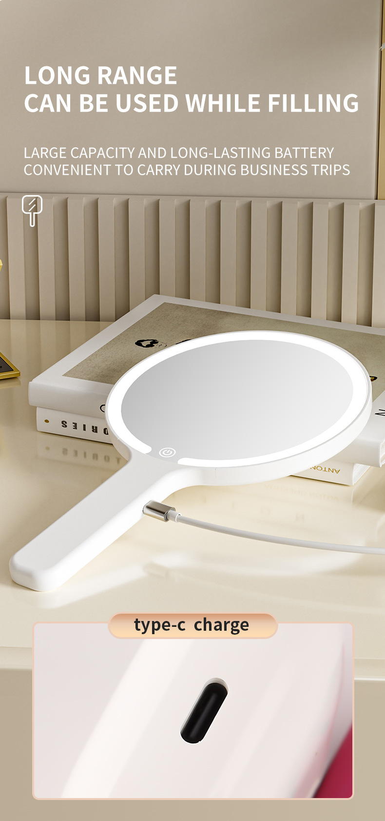White Round Portable Handheld LED Makeup Mirror – USB-C Rechargeable with 3 Color Light Modes for On-The-Go Touch-Ups