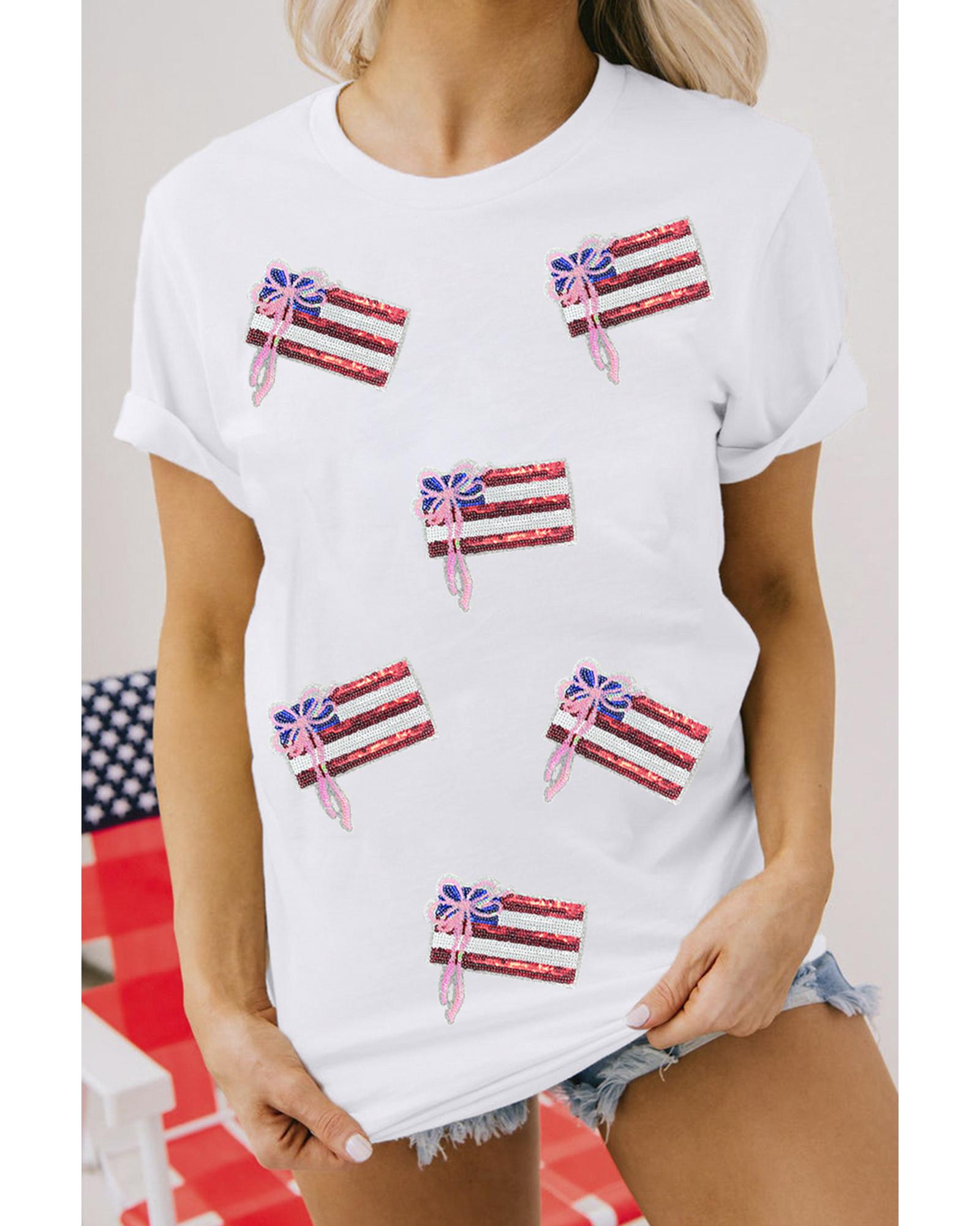 White Sequin Bow American Flag Patched T Shirt – 3XL