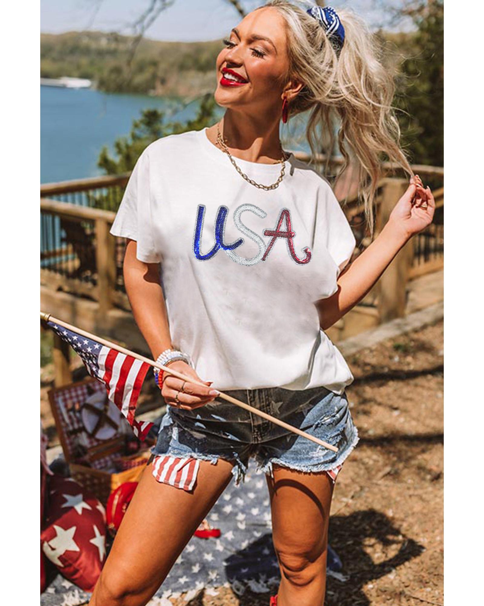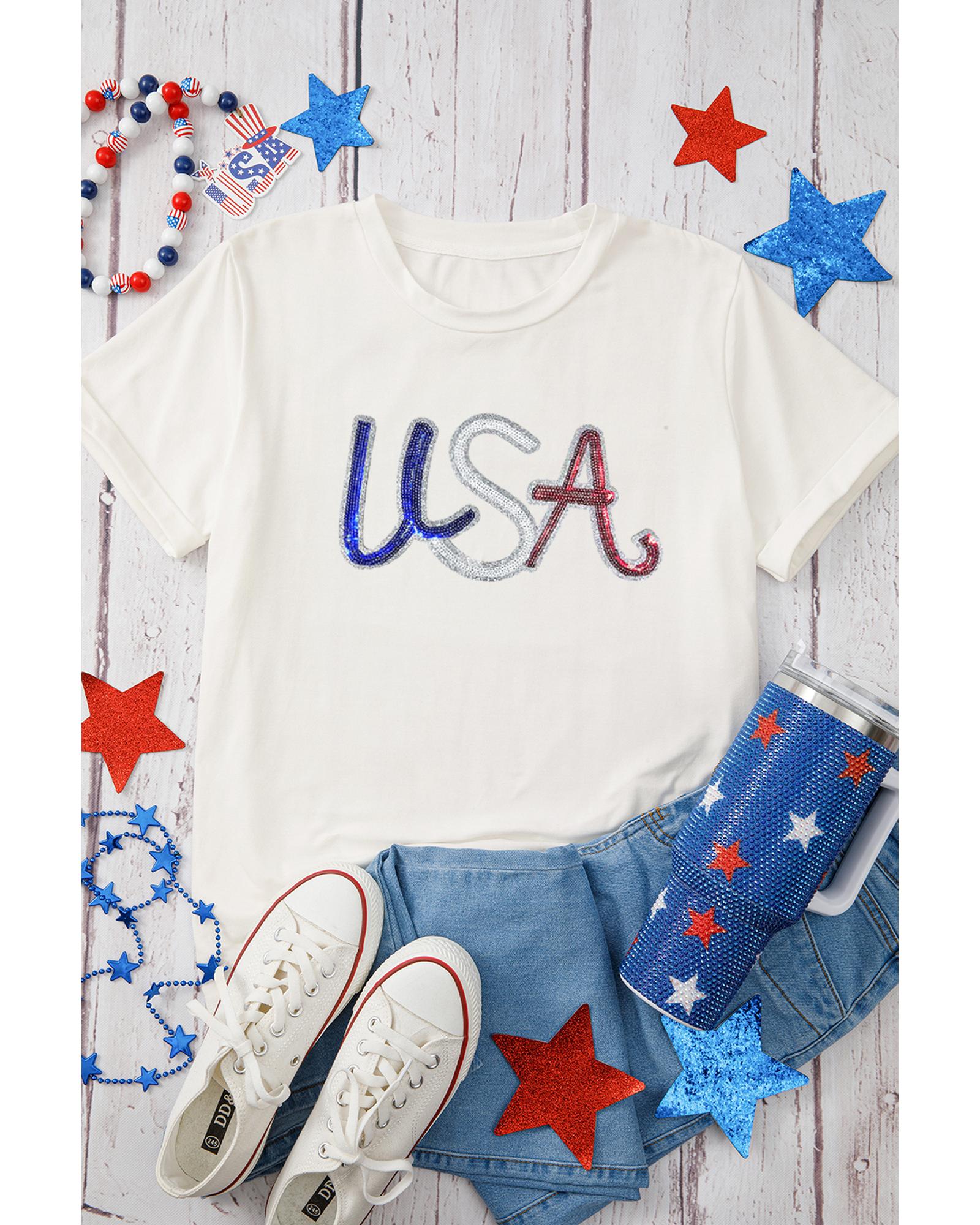 White Sequin USA Graphic Crew Neck Patriotic Tee – M