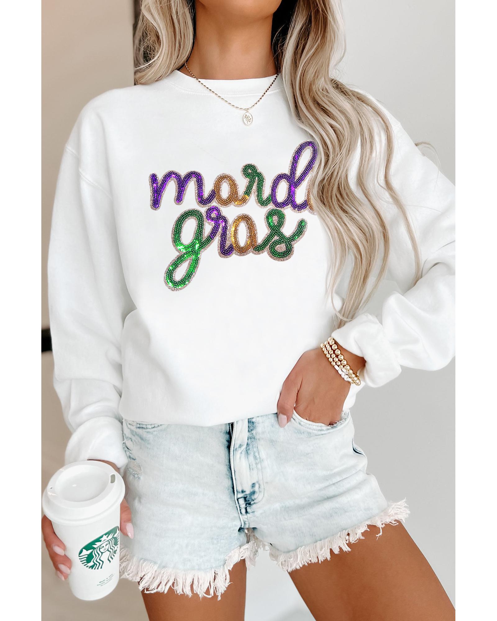 - White sequined Mardi Gras graphic crew neck drop shoulder sweatshirt