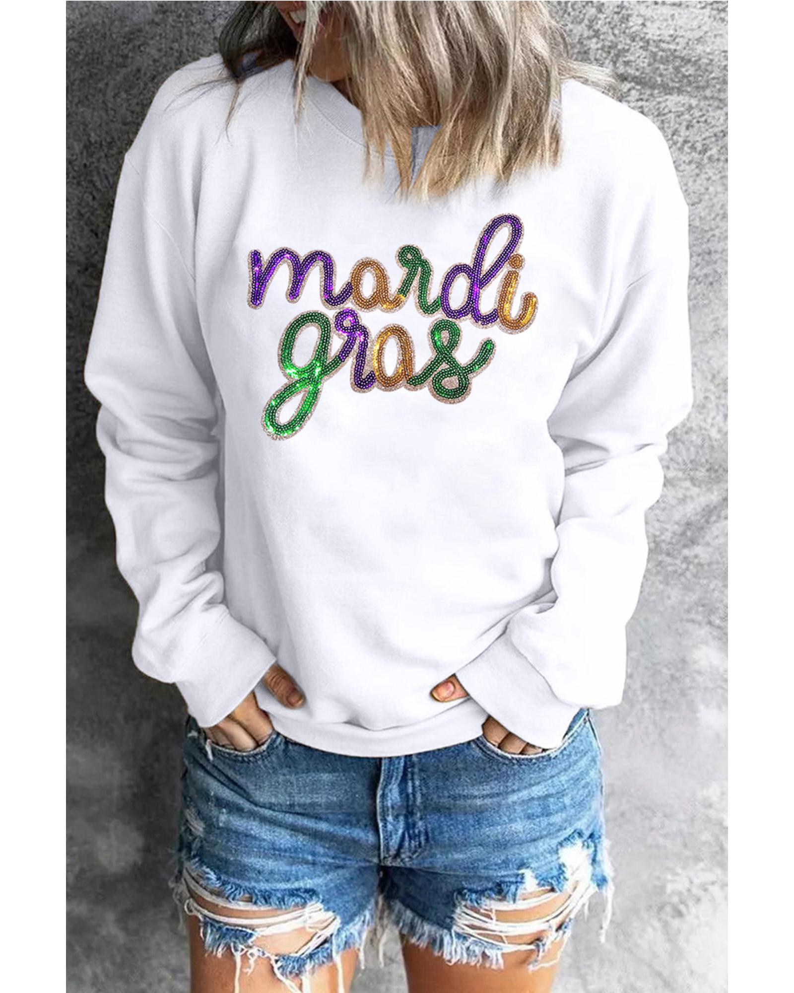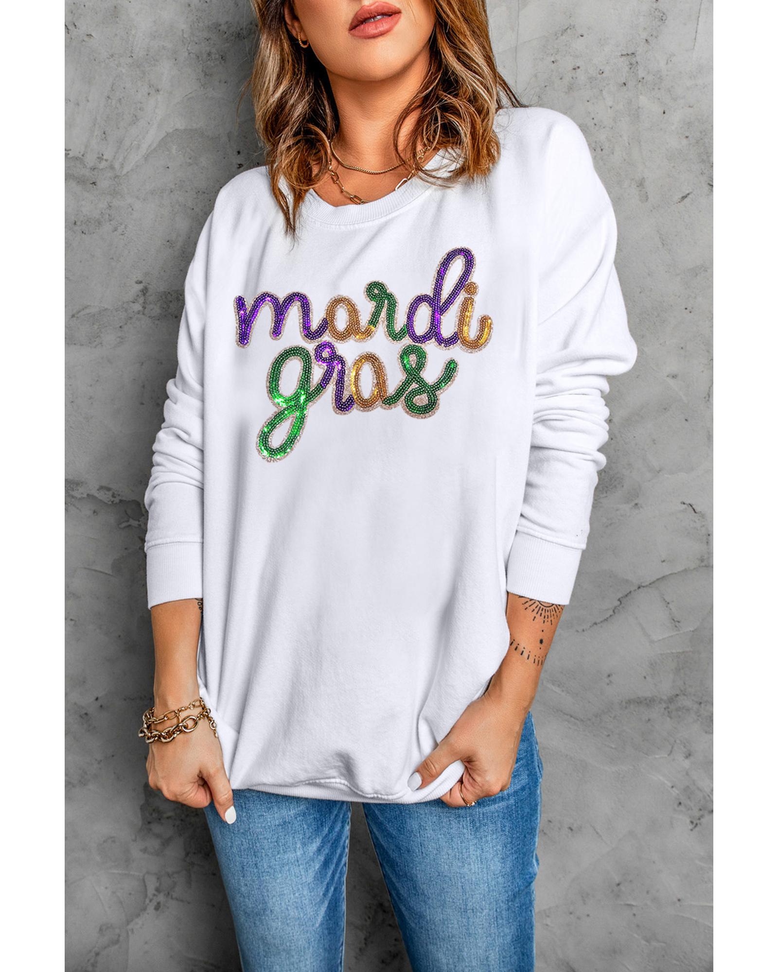 - White sequined Mardi Gras graphic crew neck drop shoulder sweatshirt