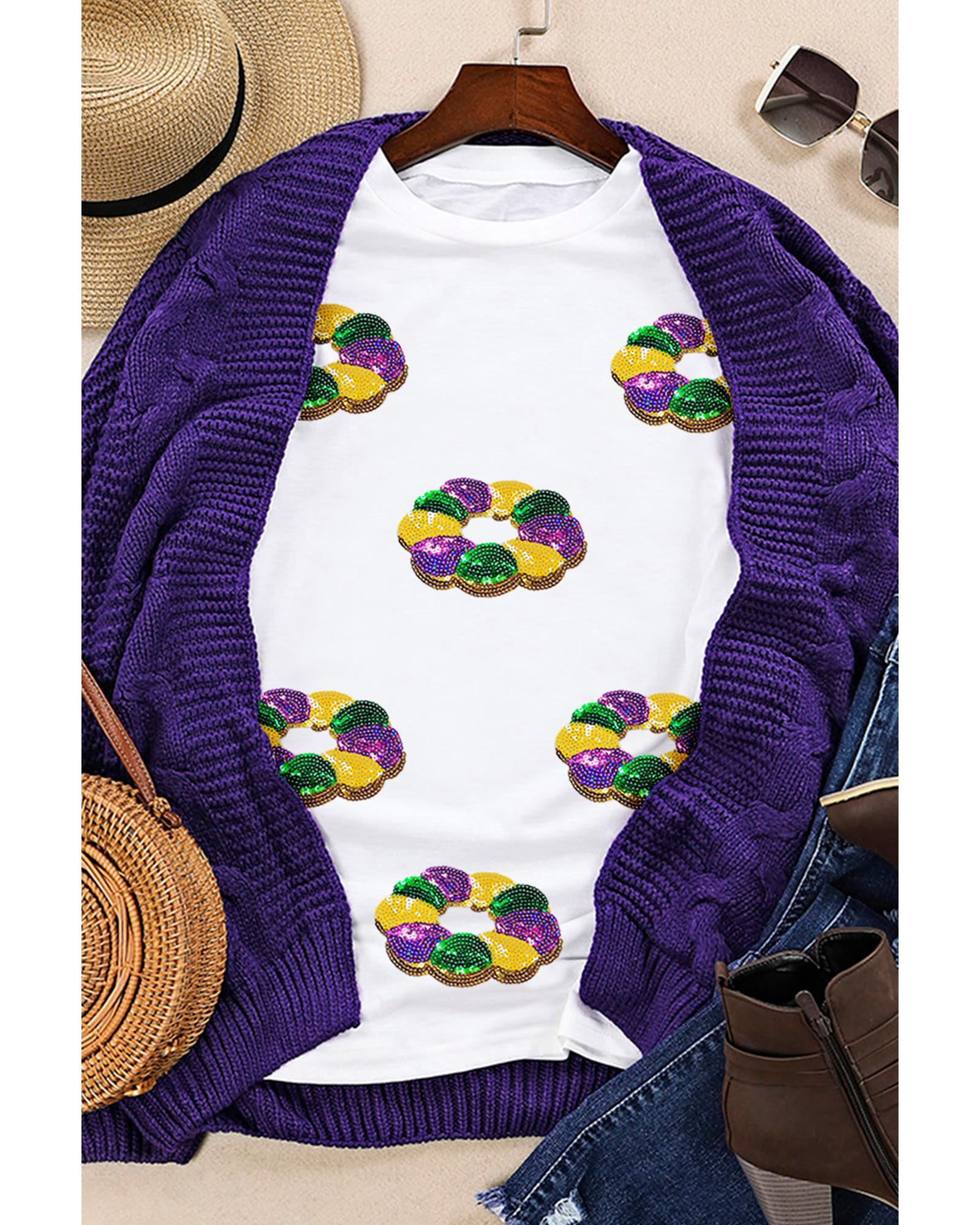 White Sequined Mardi Gras Pattern Crew Neck Short Sleeve Top – L