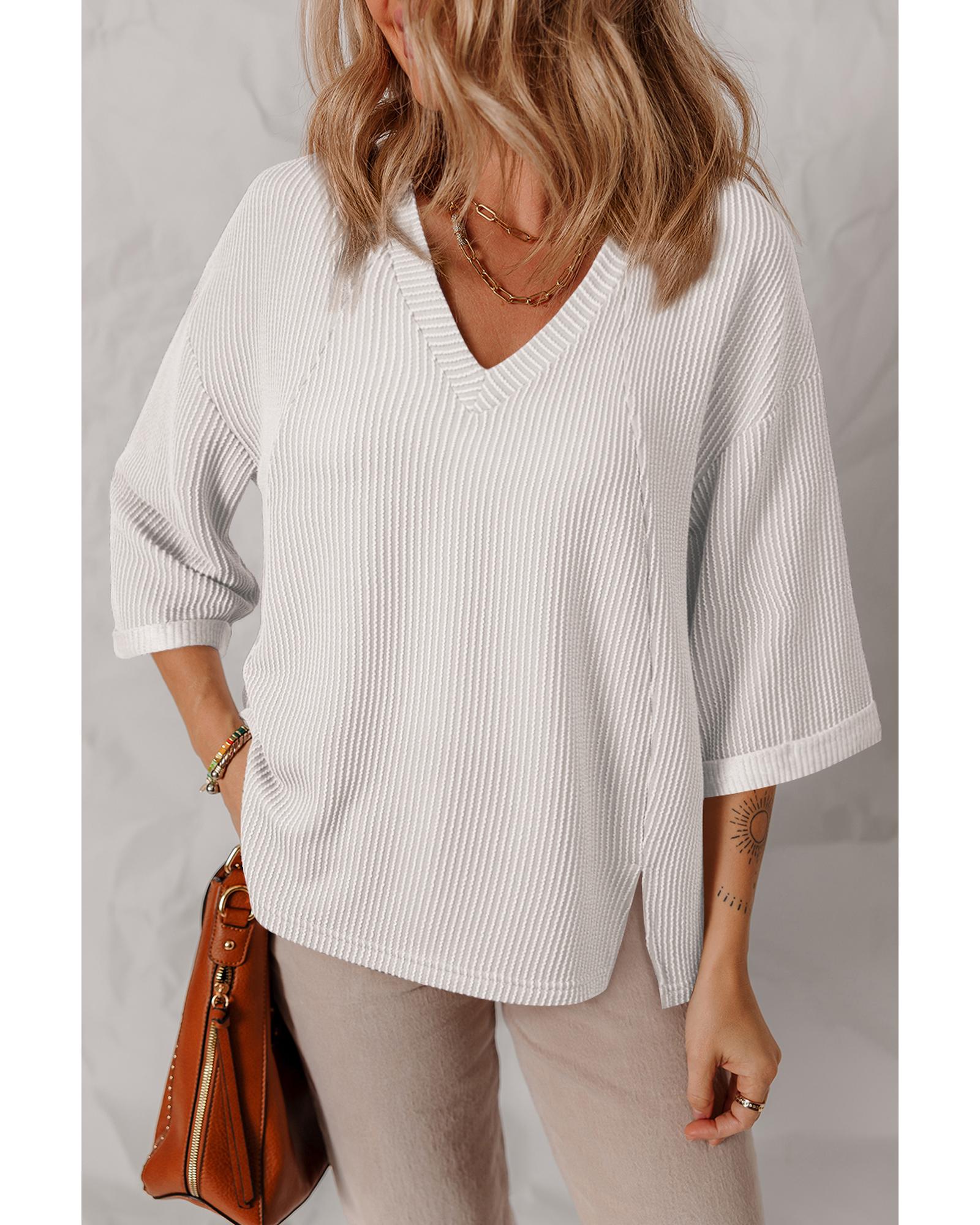 White Solid Color Corded Drop Shoulder 3/4 Sleeve V Neck Top – 2XL