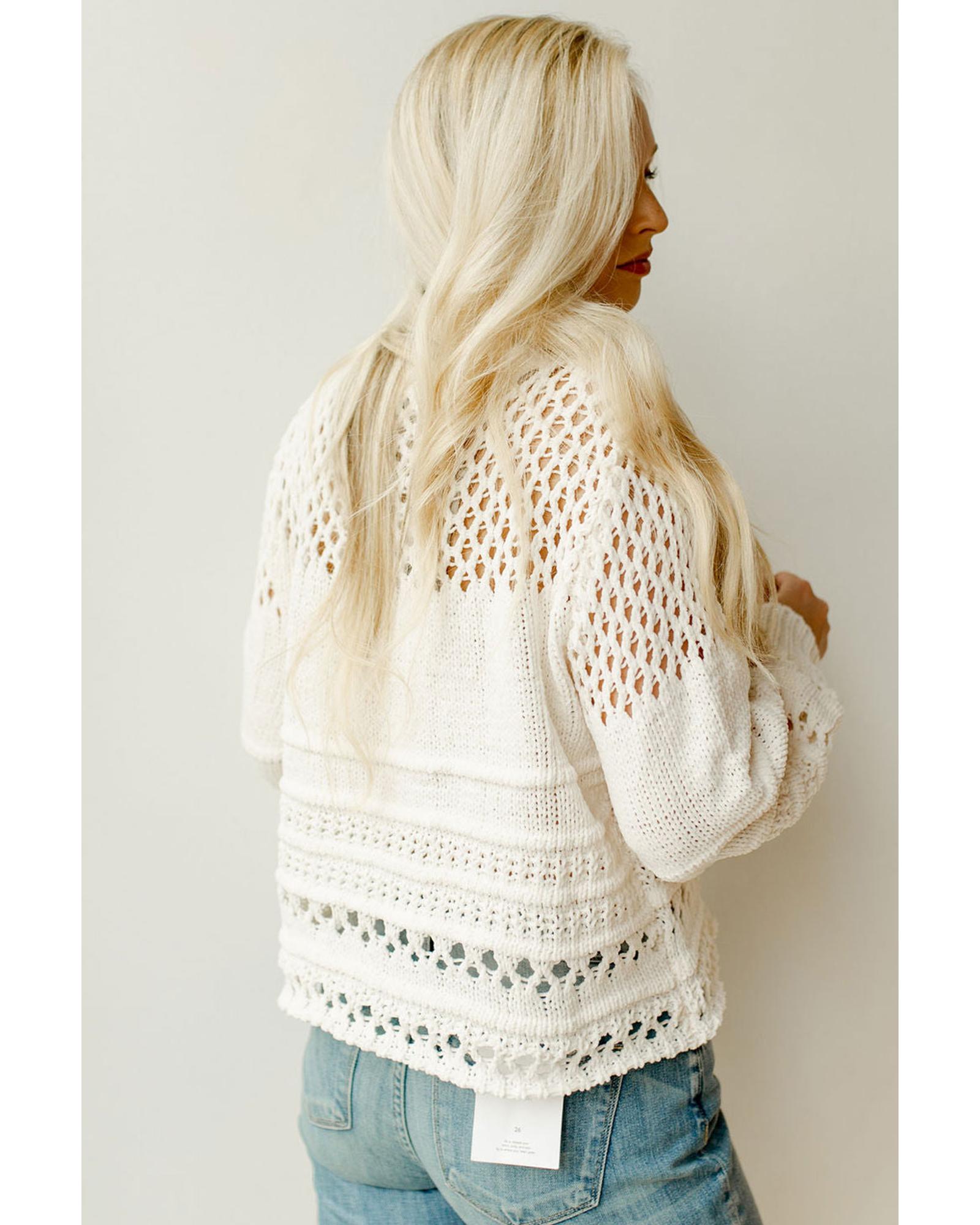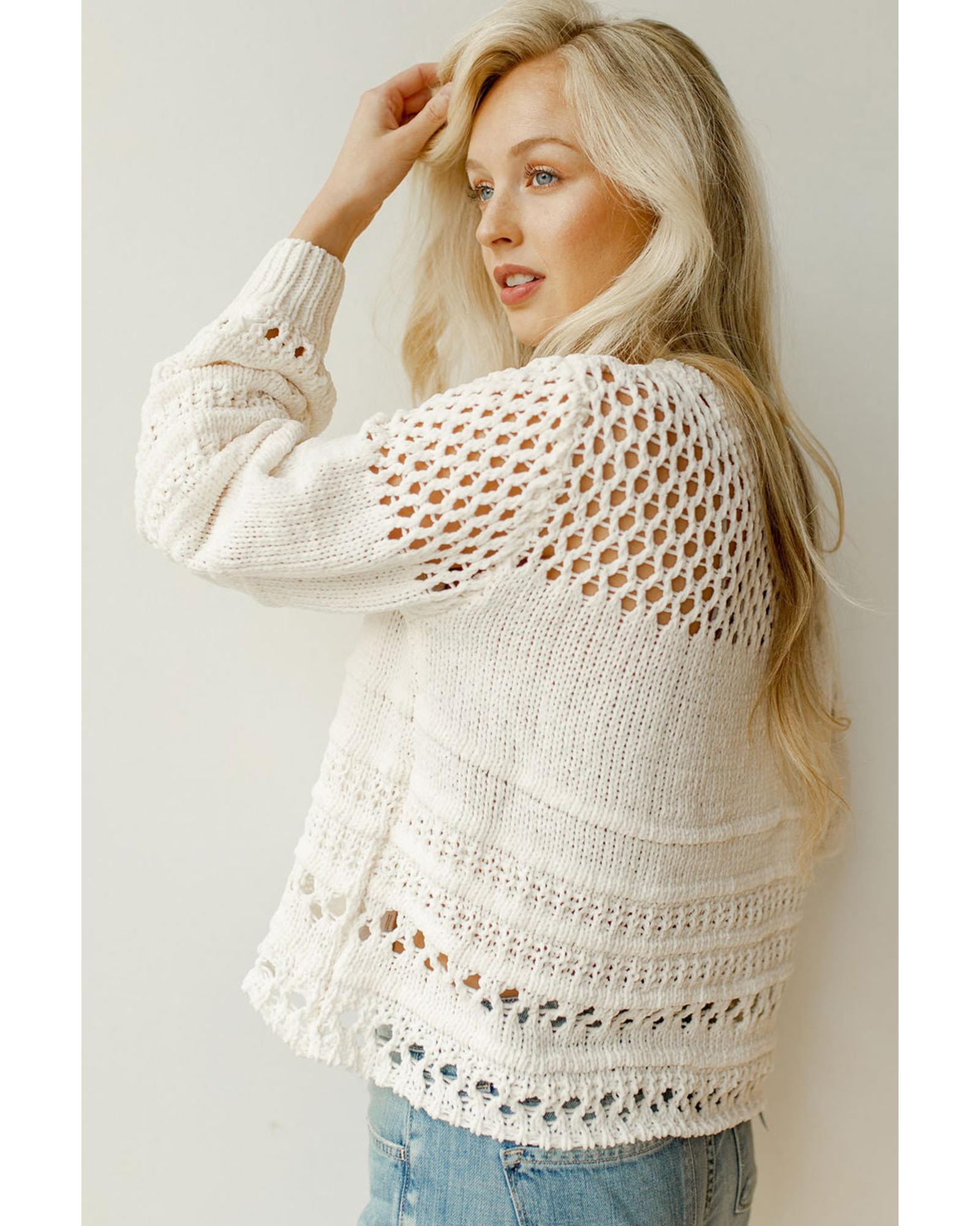 White Solid Color Pointelle Knit Puff Sleeve Sweater – L