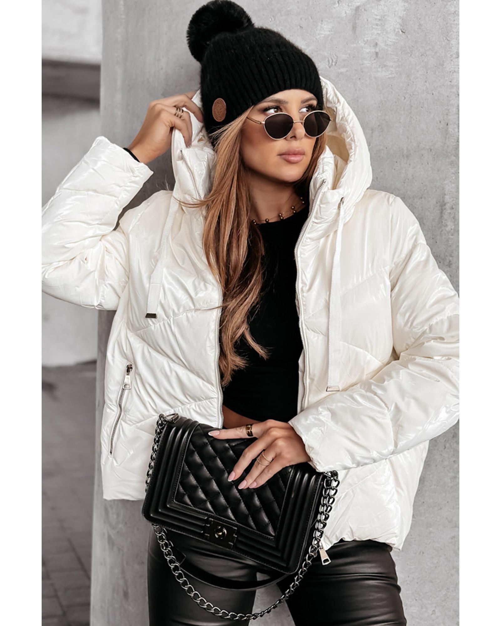 White Solid Quilted Hooded Zip Up Puffer Coat – M