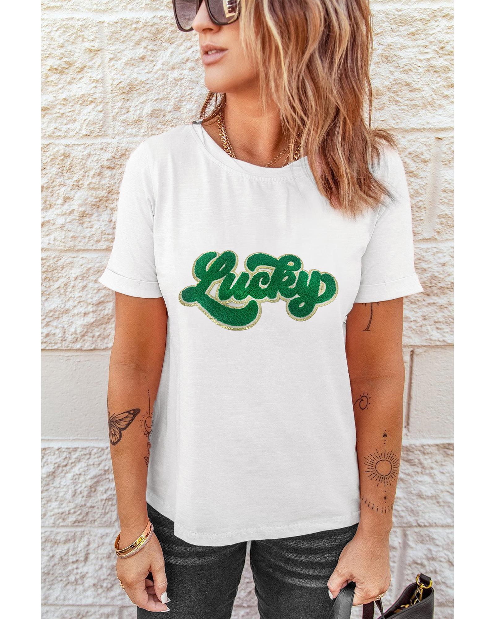 White St. Patrick Lucky Chenille Glitter Patched Graphic T Shirt – 2XL