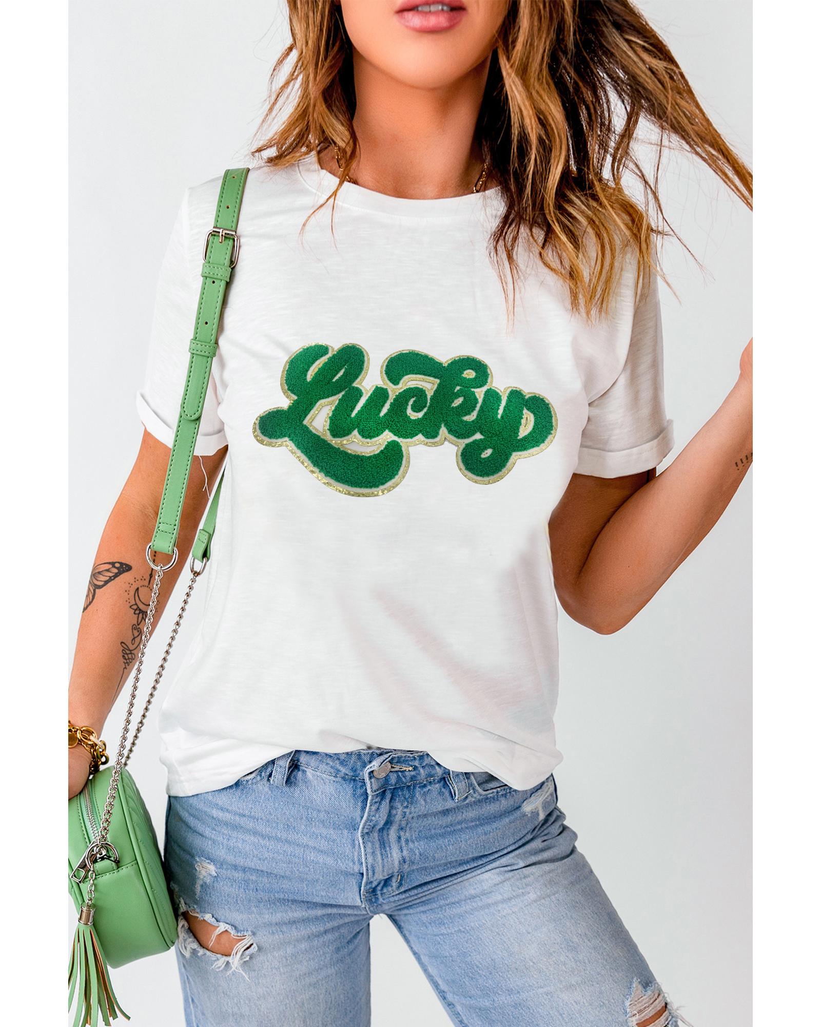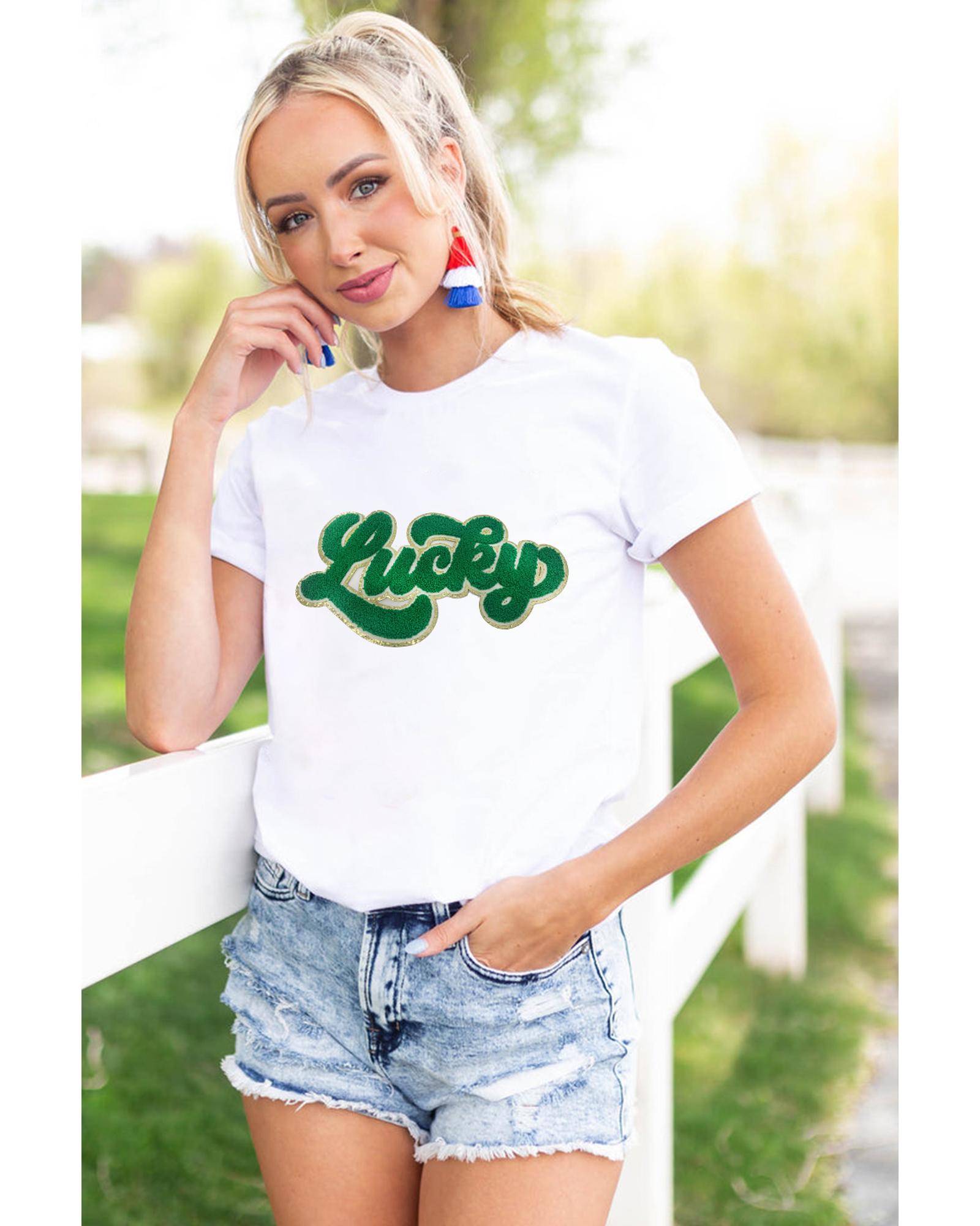 White St. Patrick Lucky Chenille Glitter Patched Graphic T Shirt – XL