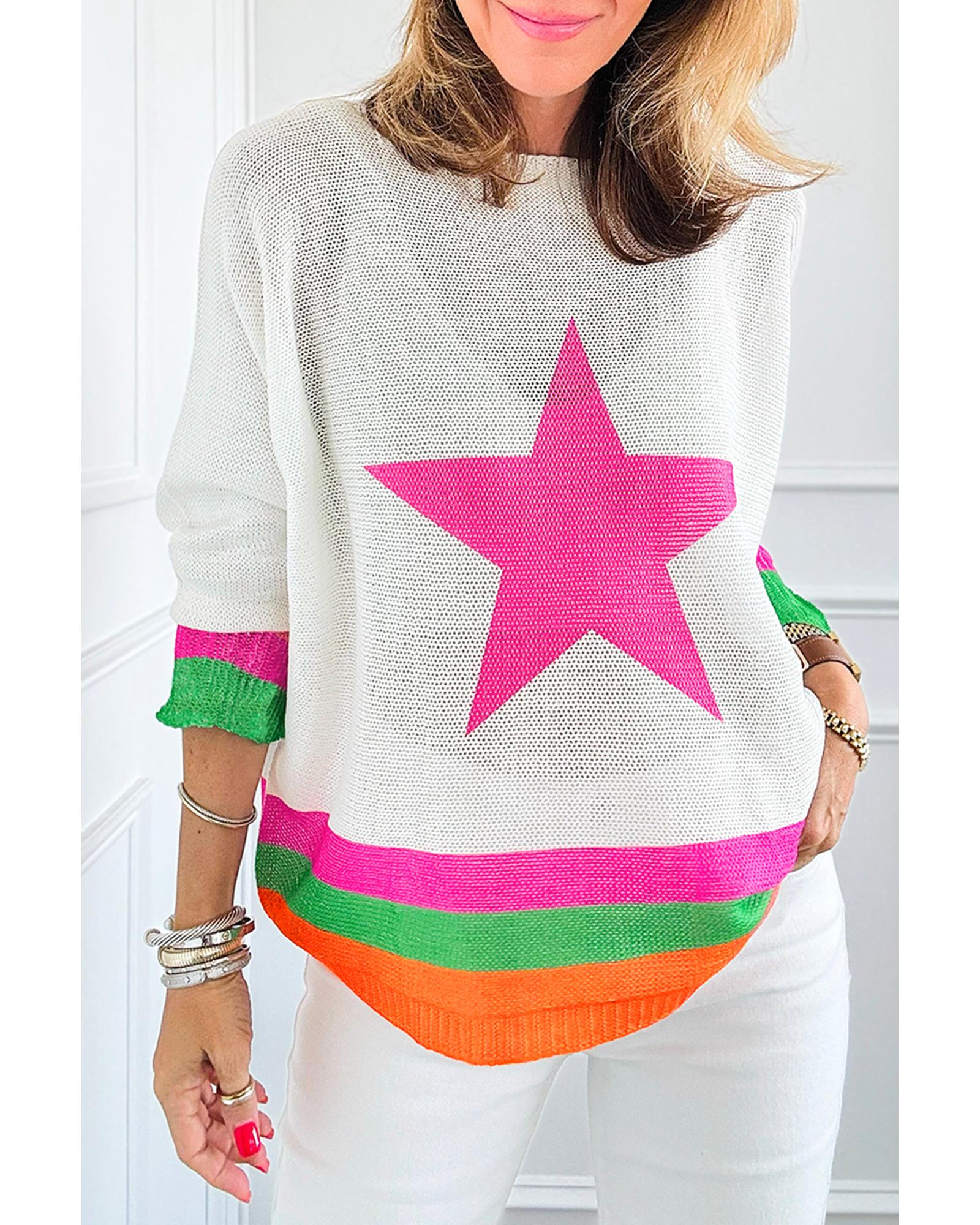 White Star Pattern Colorblock Striped Edge Drop Shoulder Sweater - S