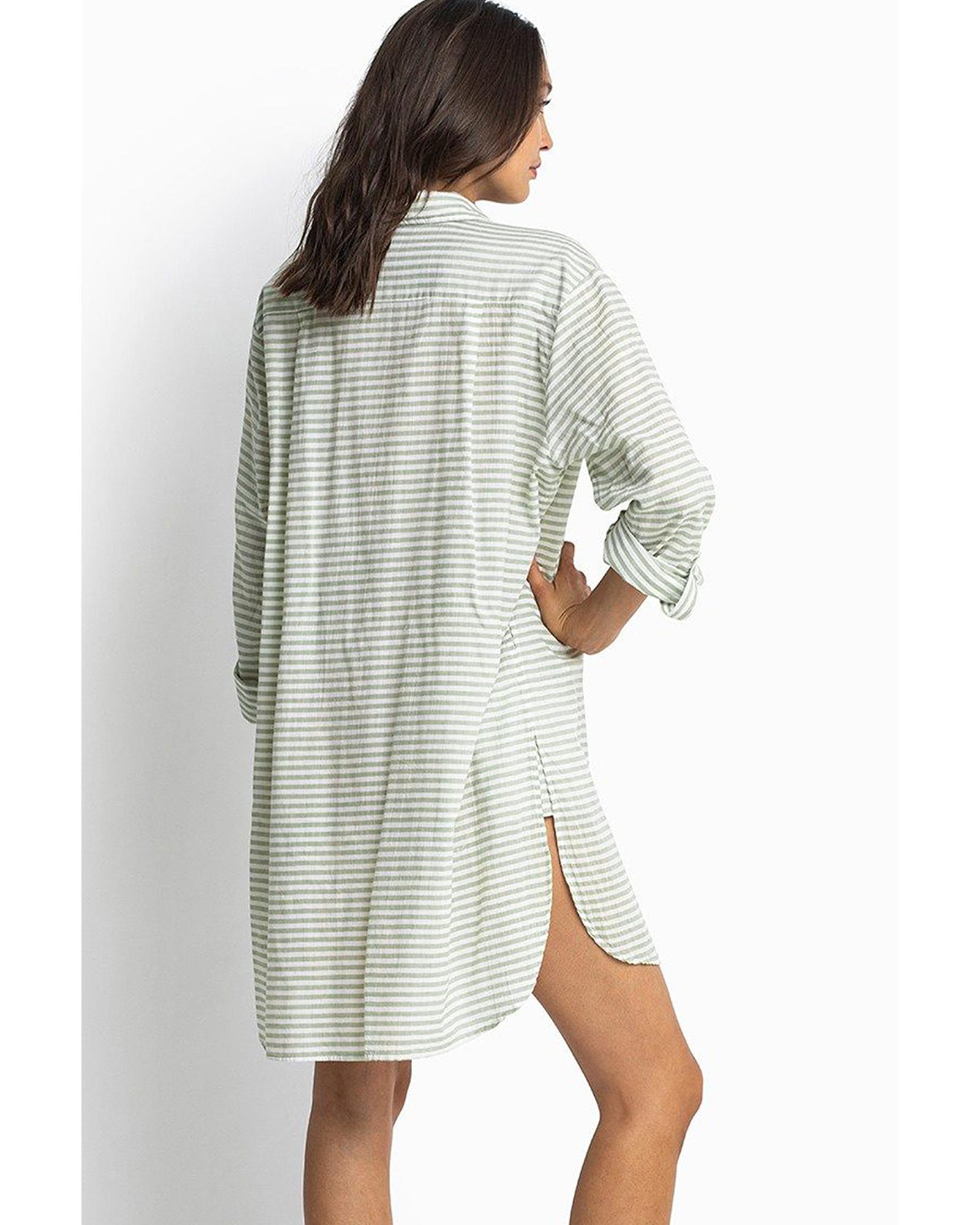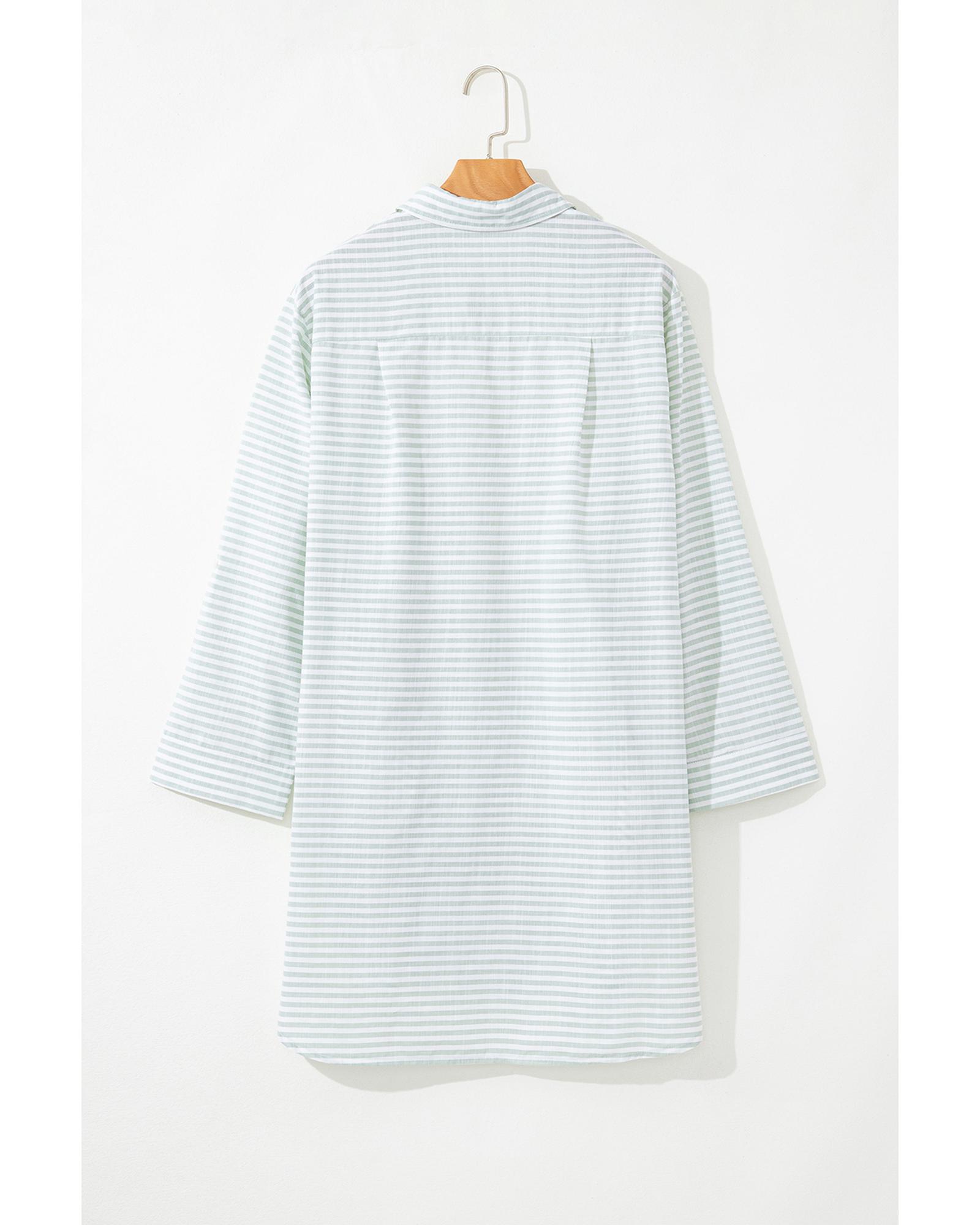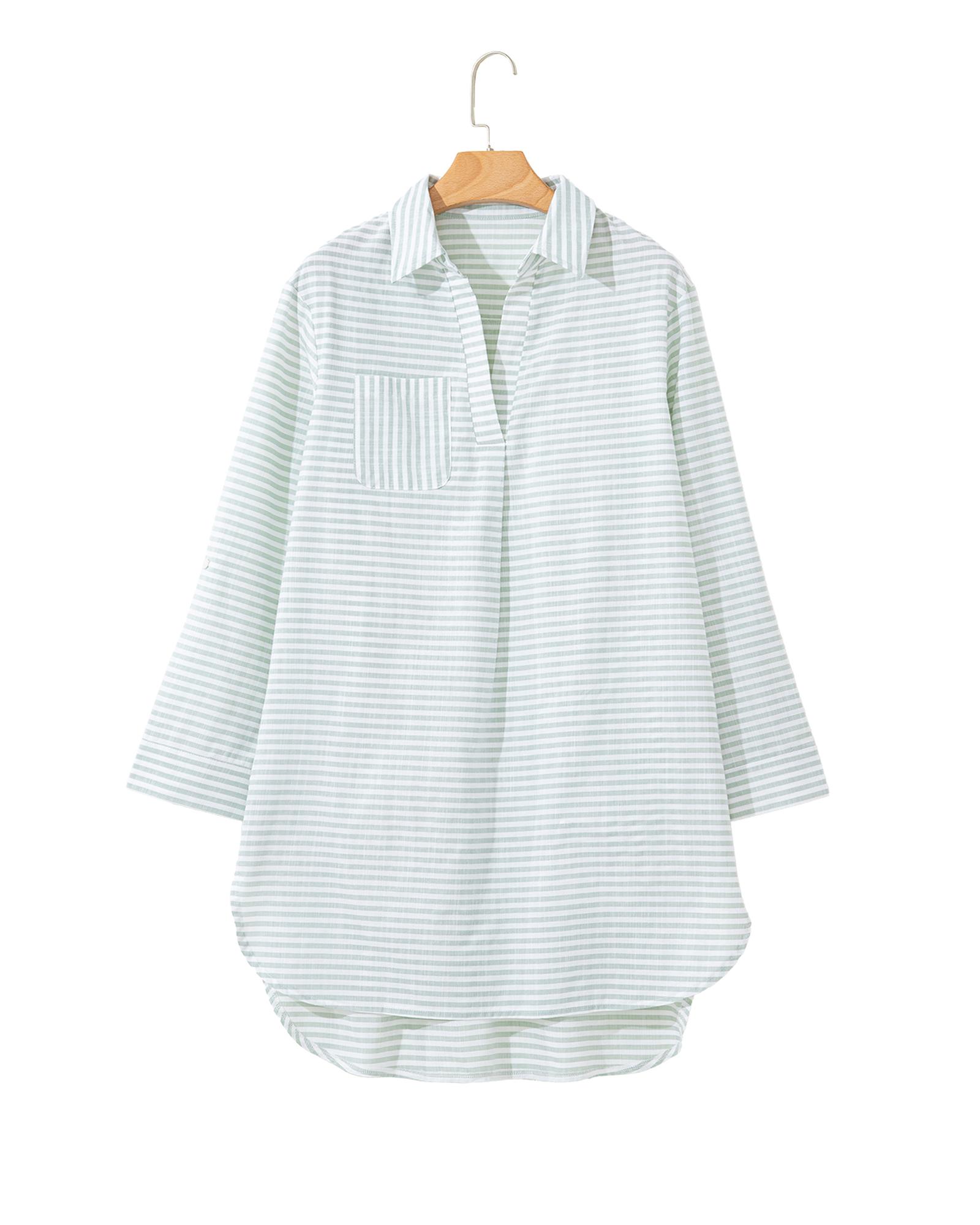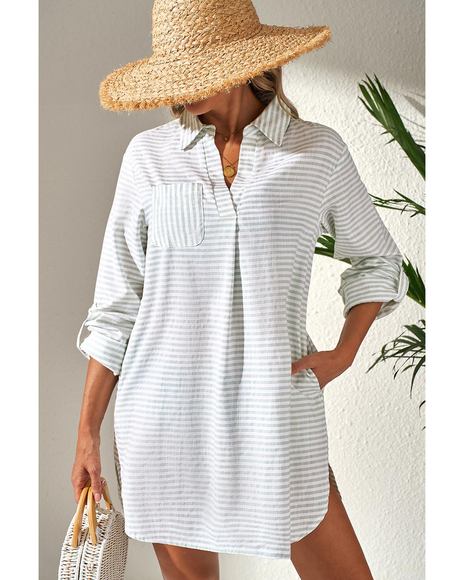 White Stripe Collared V Neck Chest Pocket Long Sleeve Beach Cover up – 2XL