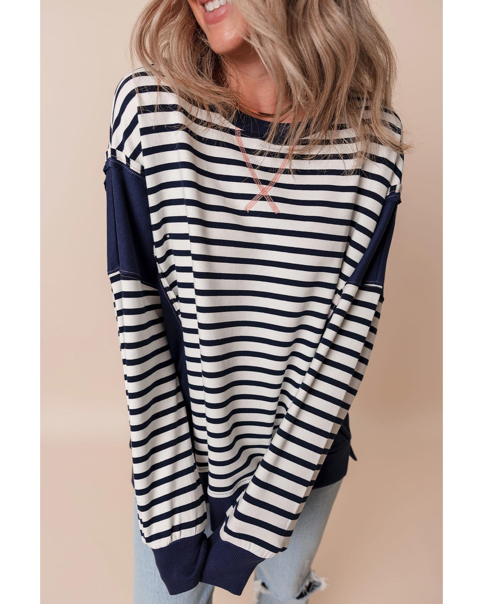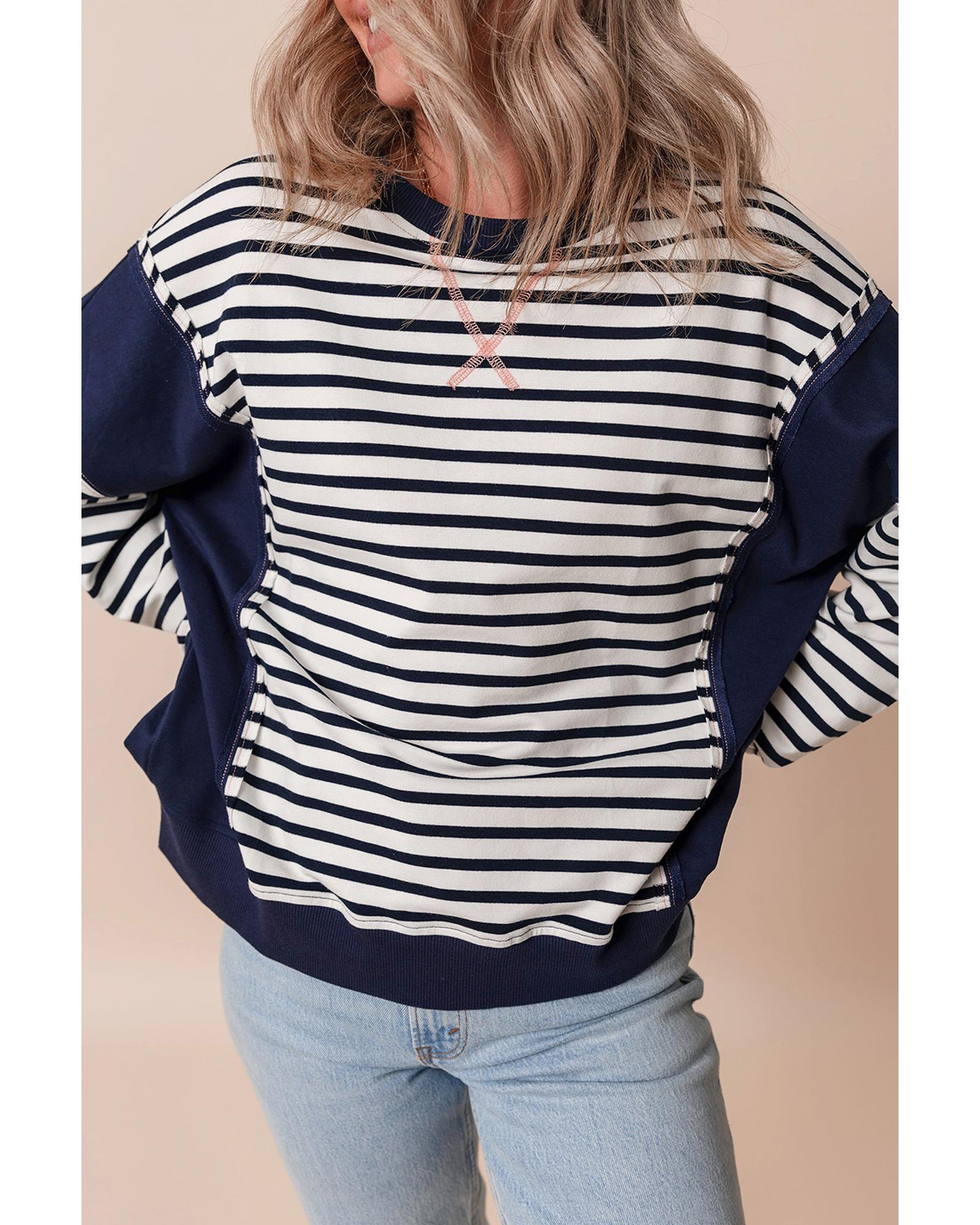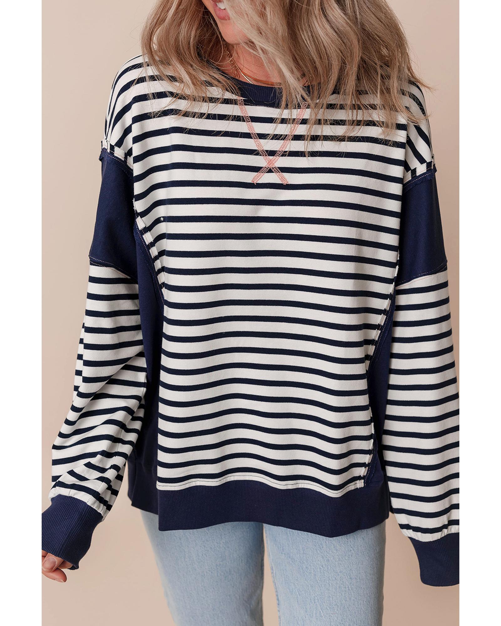 White Stripe Color Block Exposed Seam Loose Fit Sweatshirt – S
