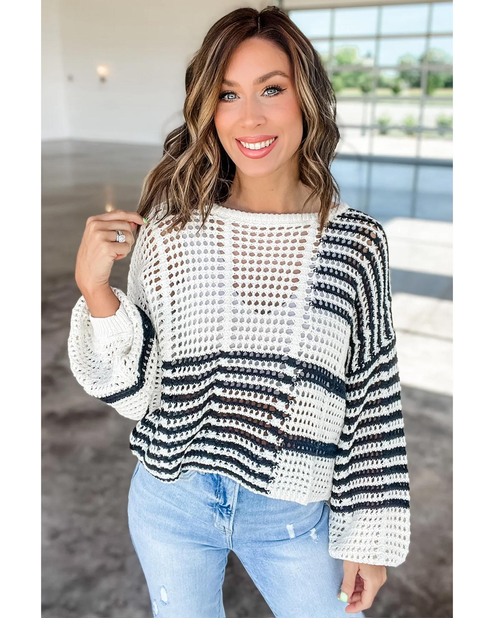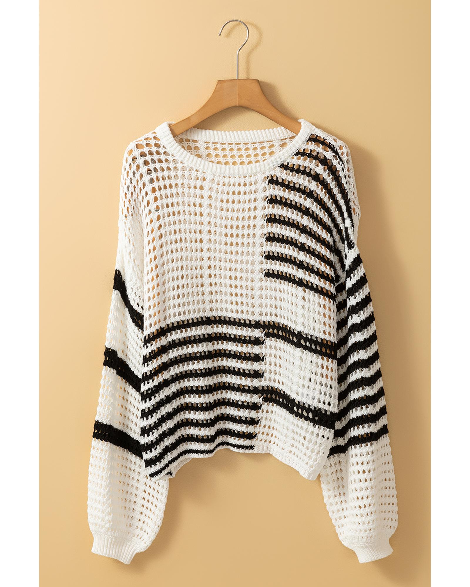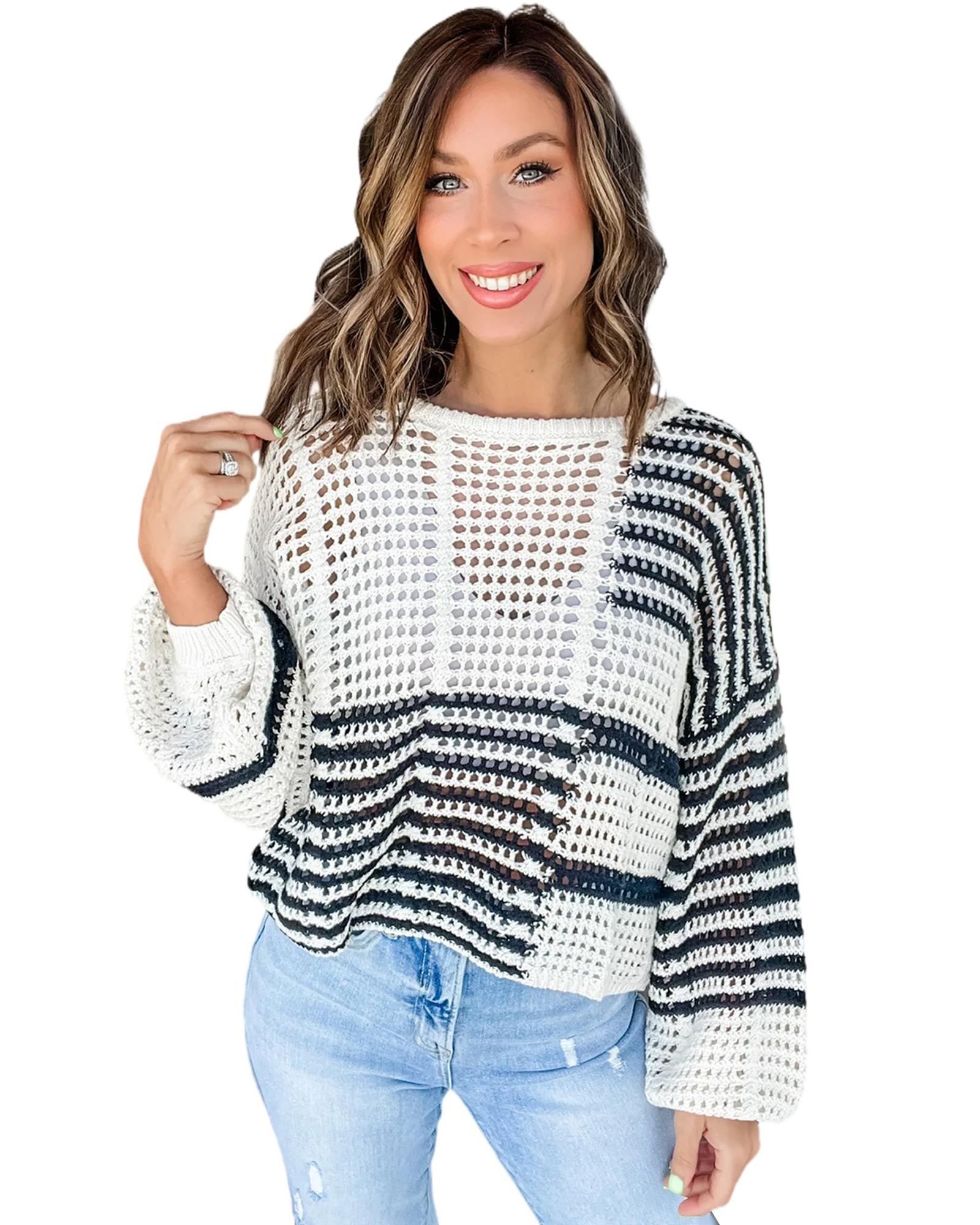 White Stripe Contrast Striped Crochet Puff Sleeve Sweater – S