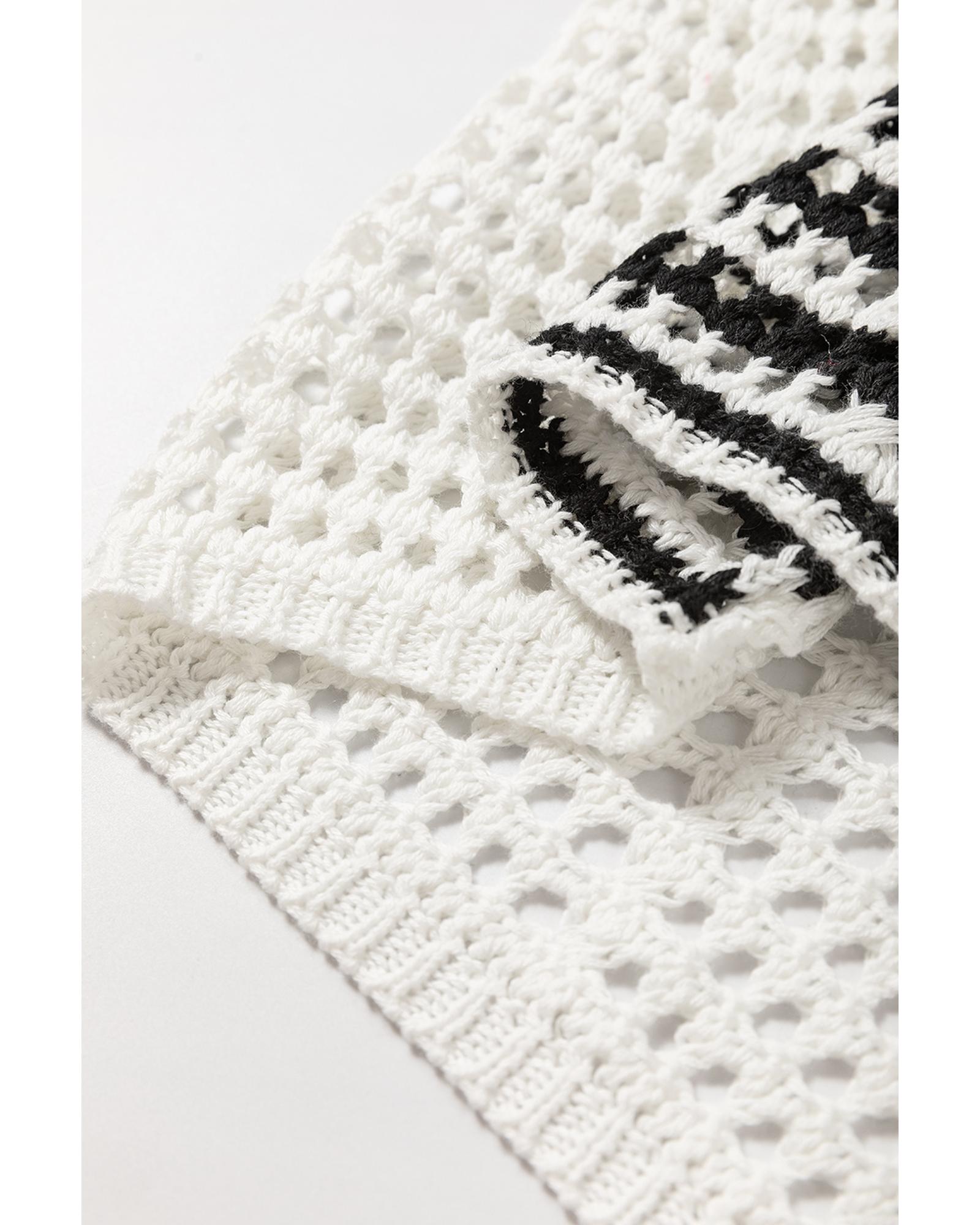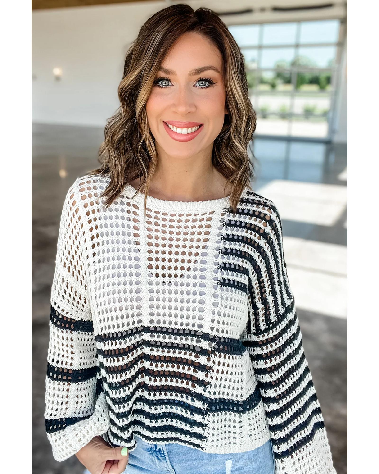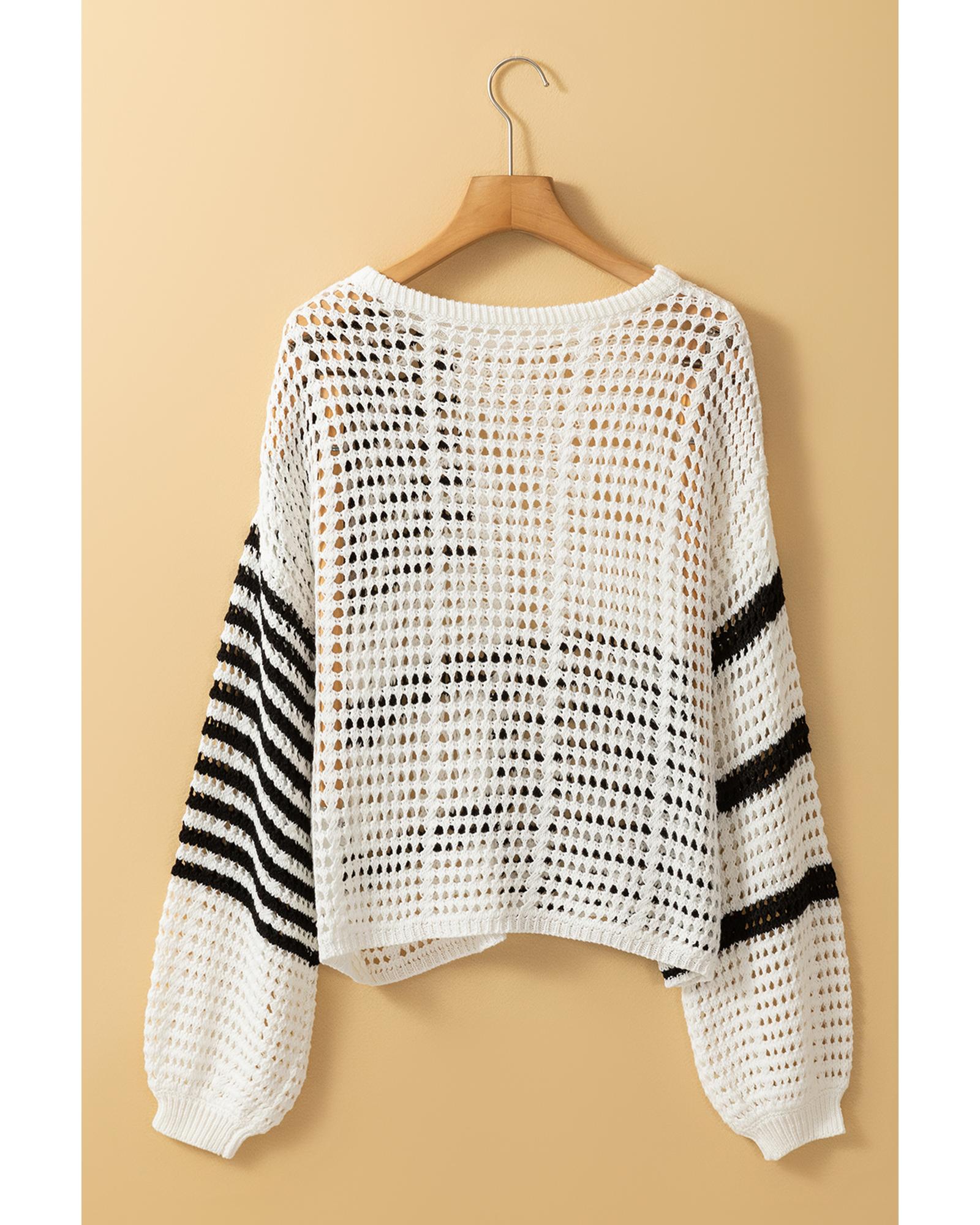 White Stripe Contrast Striped Crochet Puff Sleeve Sweater – XL