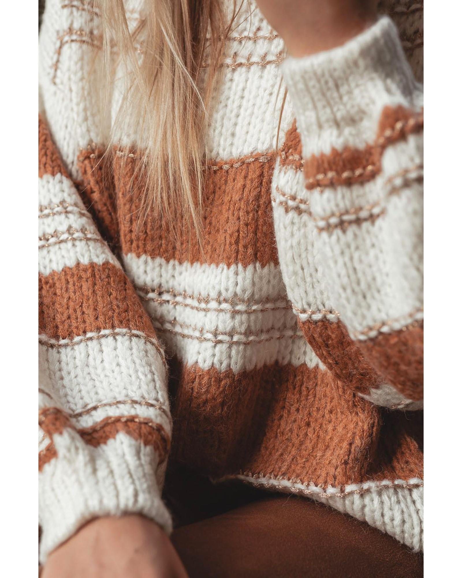 White Striped Knit Puff Sleeve Casual Sweater – XL