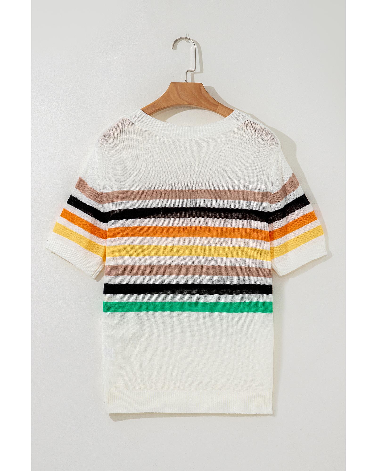 White Striped Pocketed Loose Fit Crewneck Knitted T Shirt – S