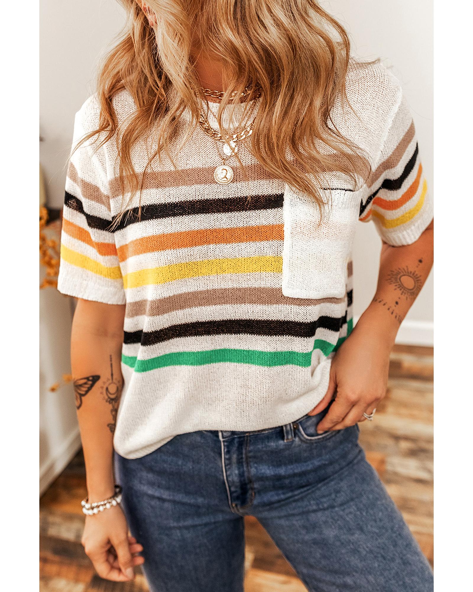 - White Striped Pocketed Loose Fit Crewneck Knitted T
