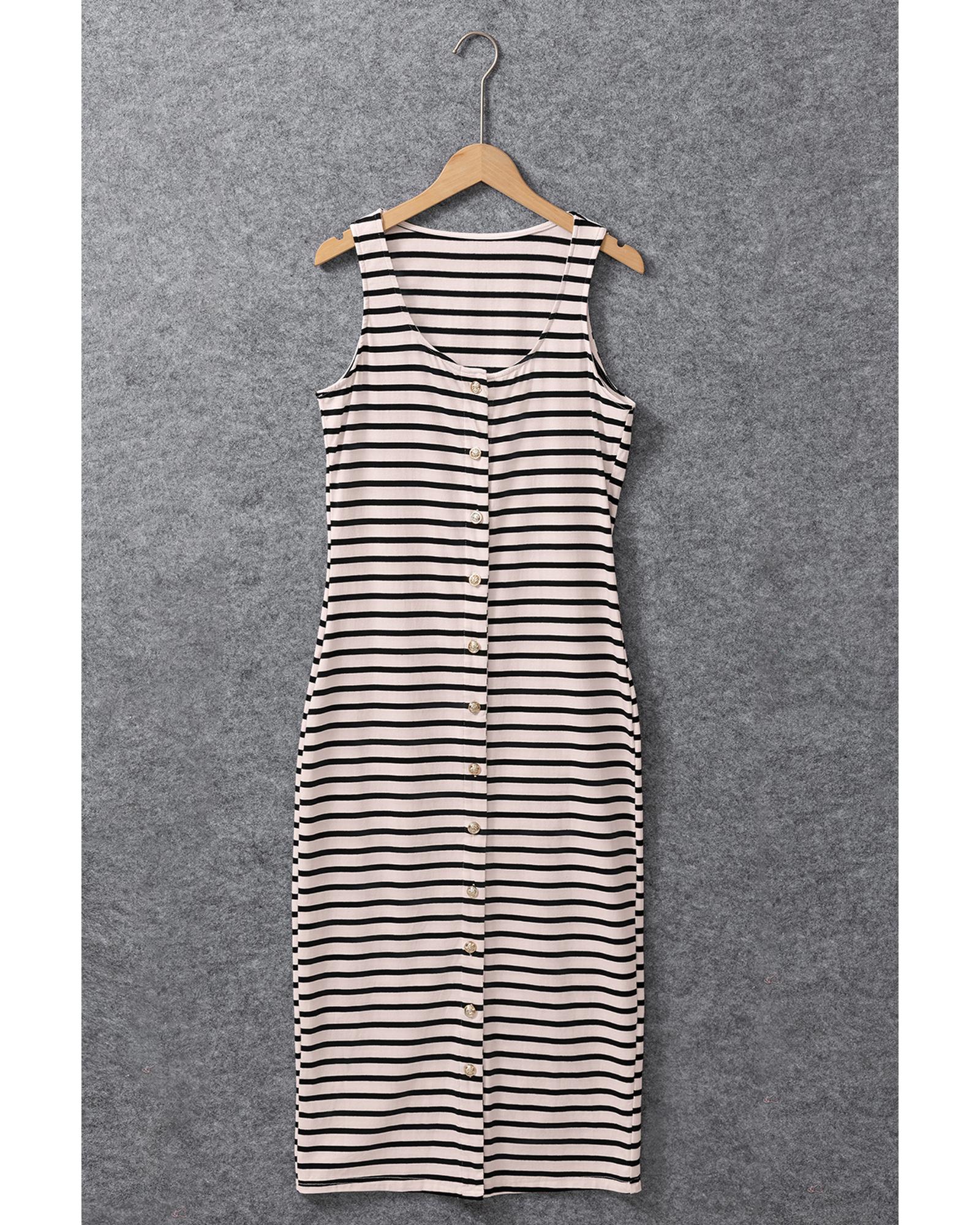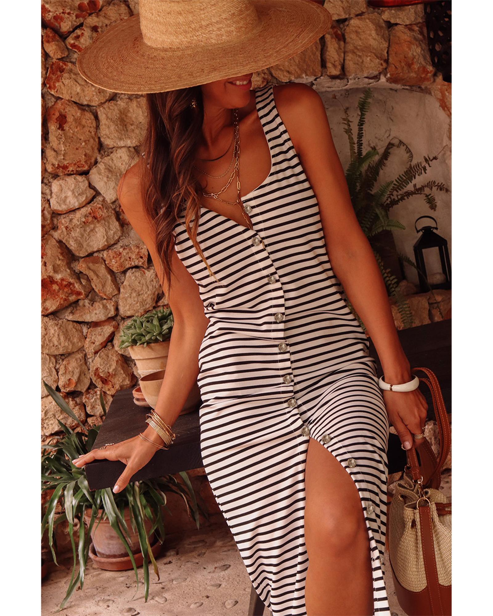White Striped Print Sleeveless Buttoned Maxi Dress – M