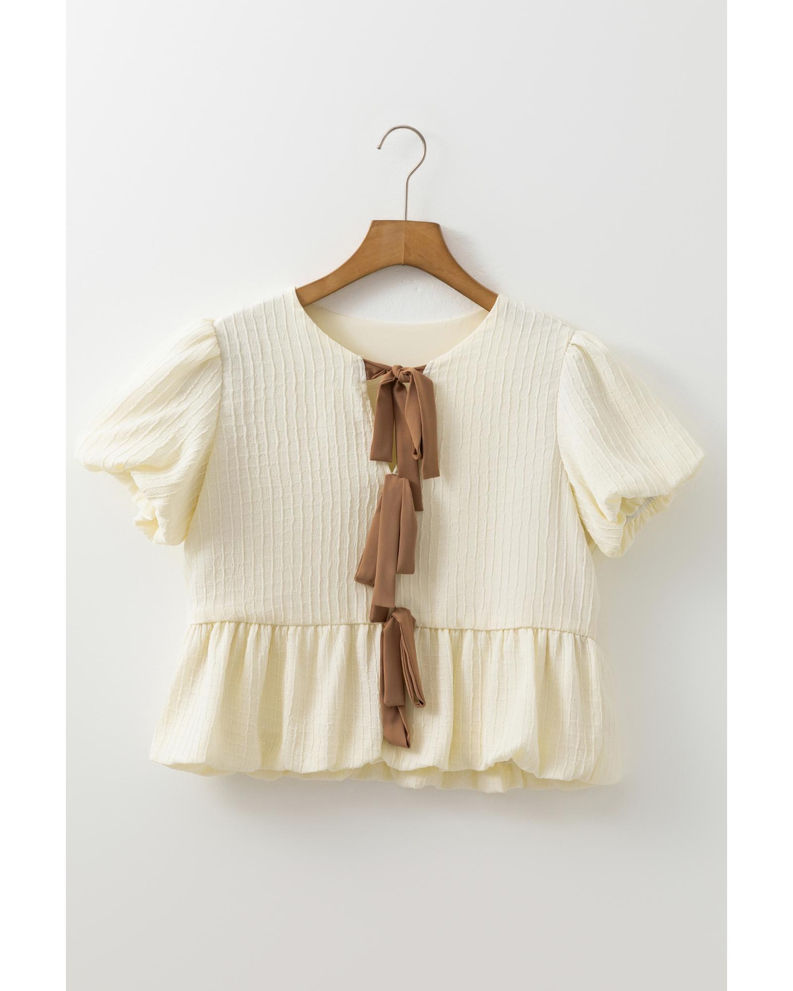 White Textured Bow Ties Front Bubble Hem Puff Short Sleeve Blouse – L