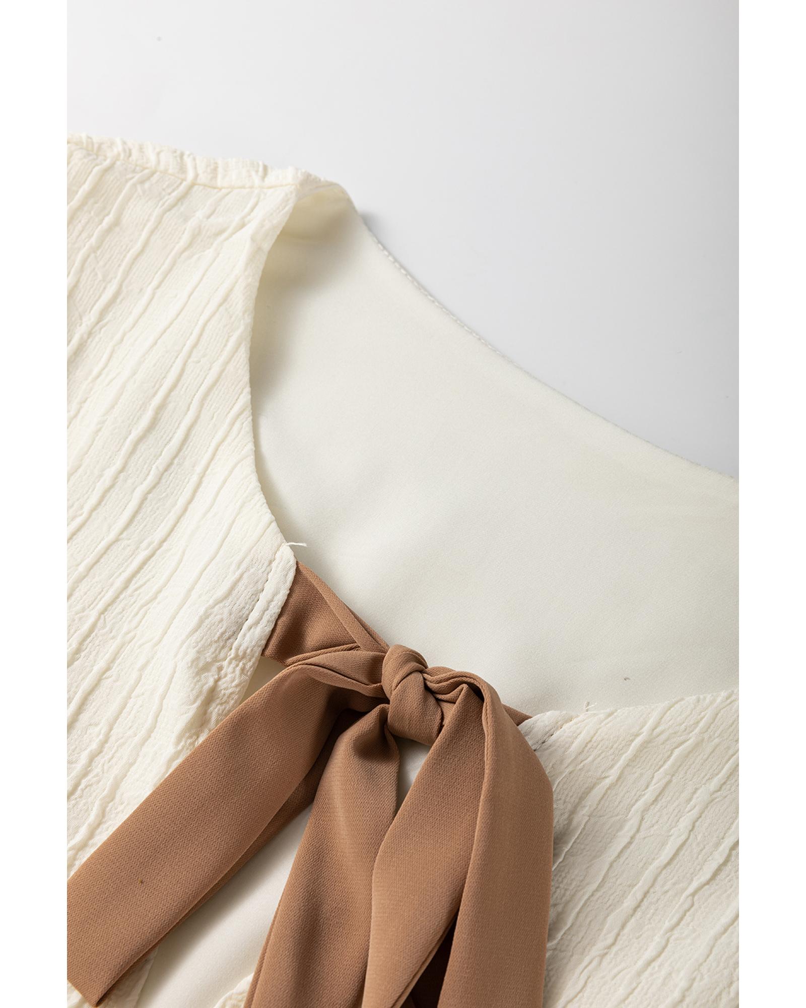 White Textured Bow Ties Front Bubble Hem Puff Short Sleeve Blouse - XL