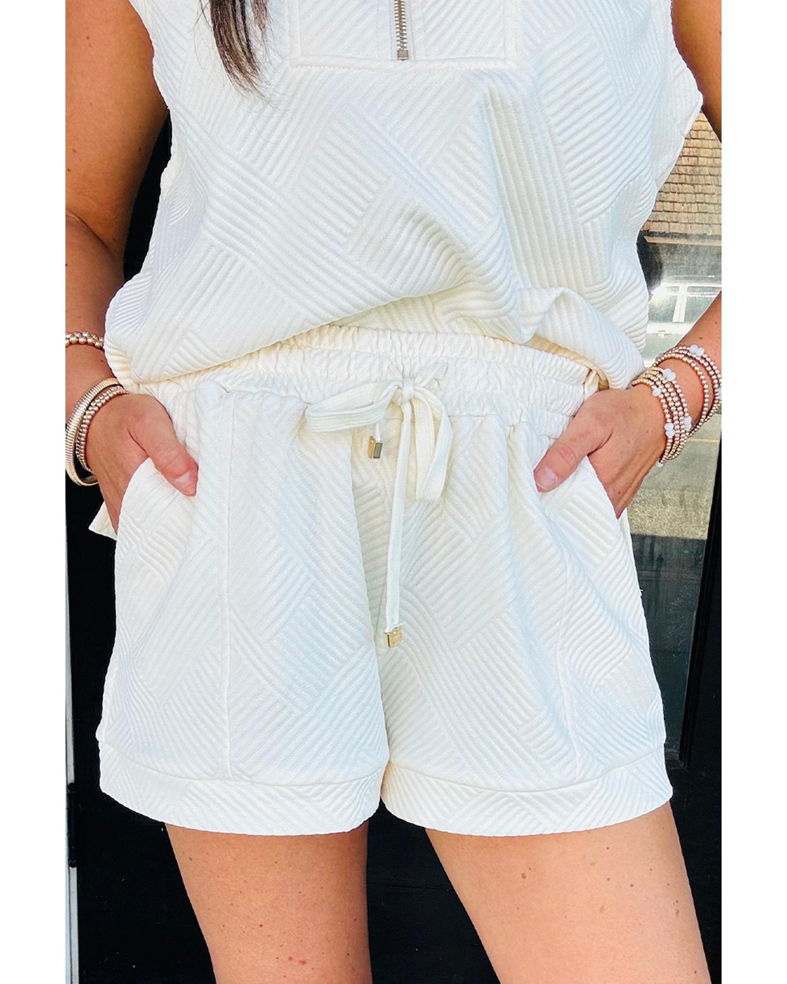 White Textured Half Zip Tank Top Drawstring Shorts Set – L