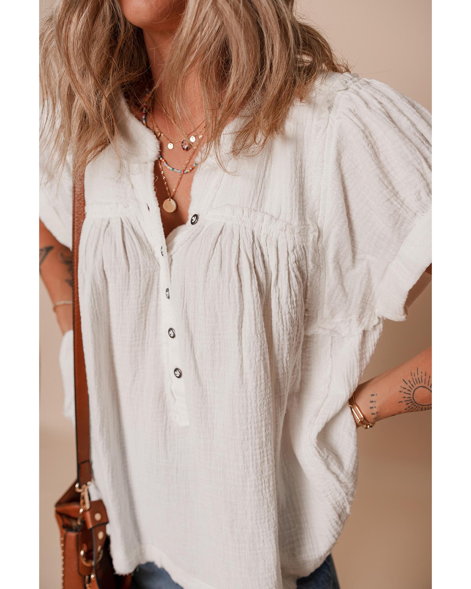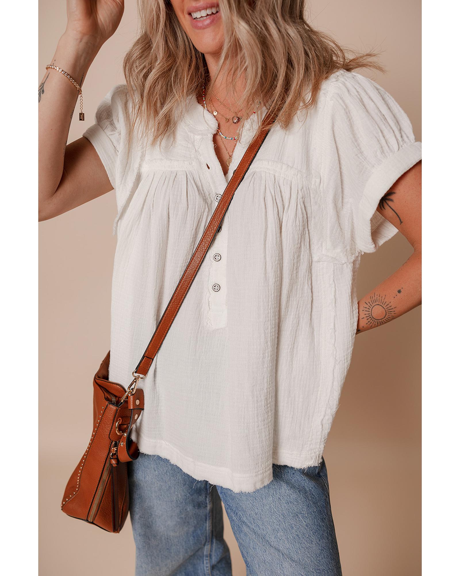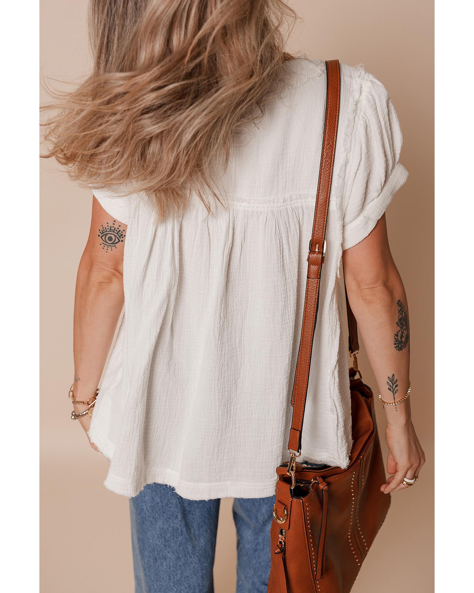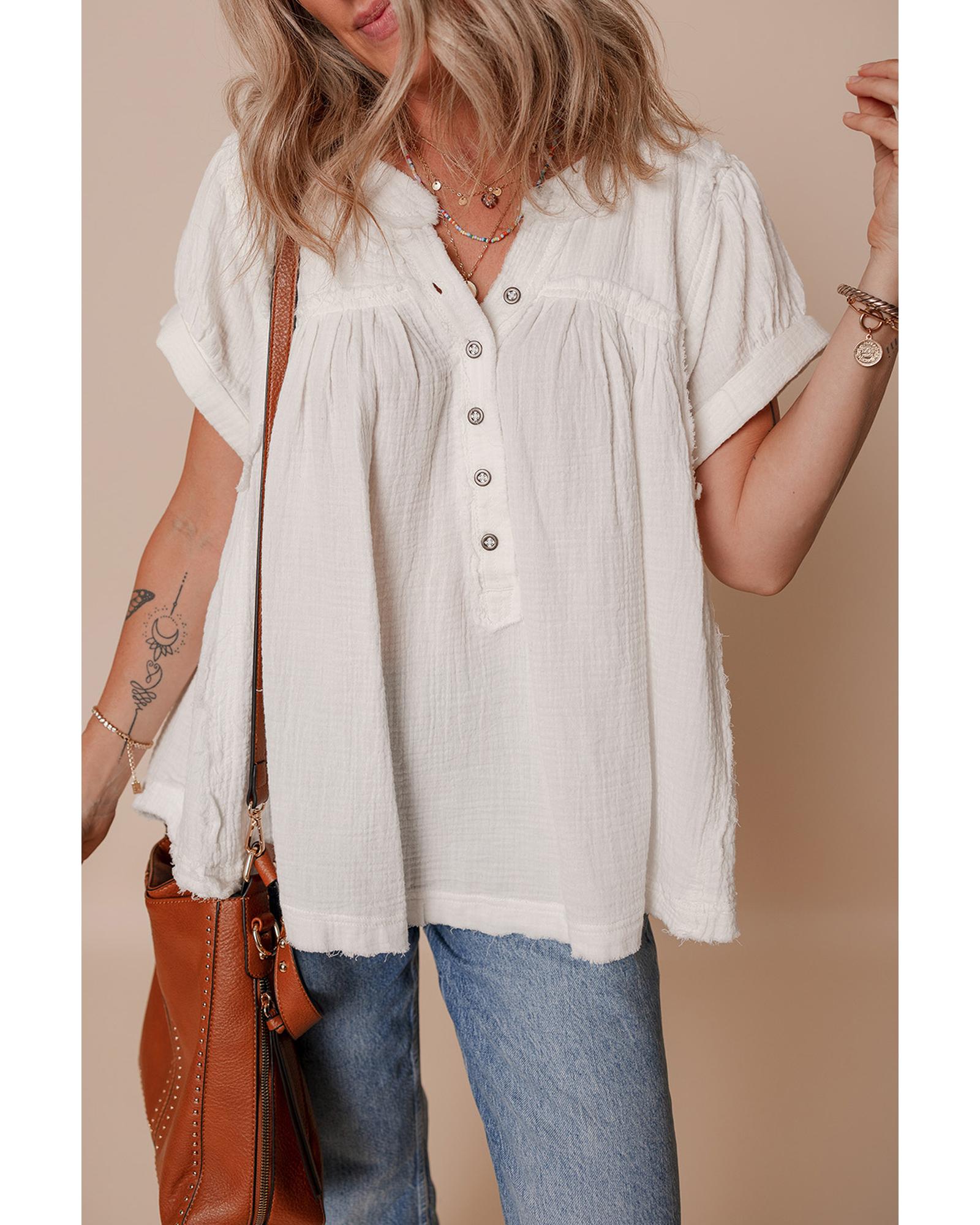 White Textured Short Sleeve Buttons Frayed Blouse – L